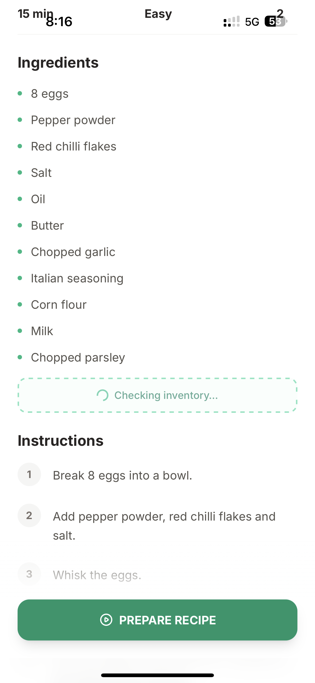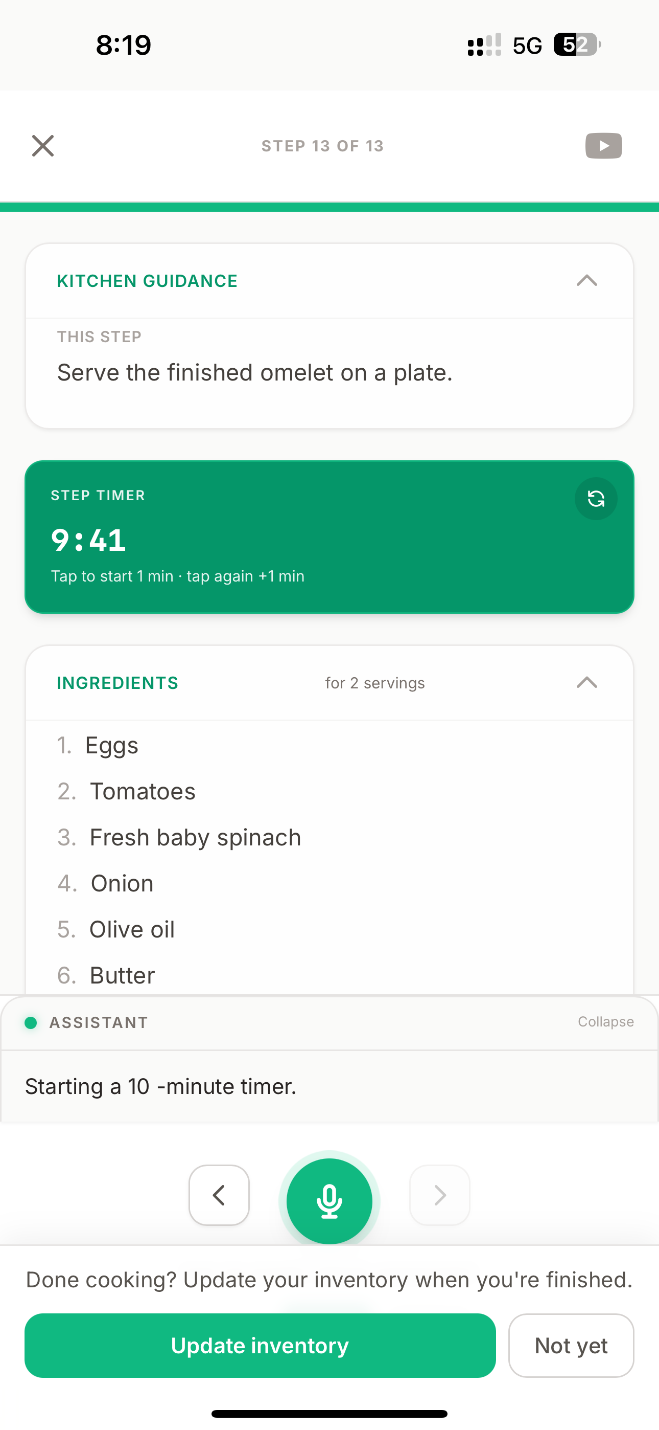 - Say "I'm done" → Recipe is marked complete, used ingredients are automatically deducted from your inventory.