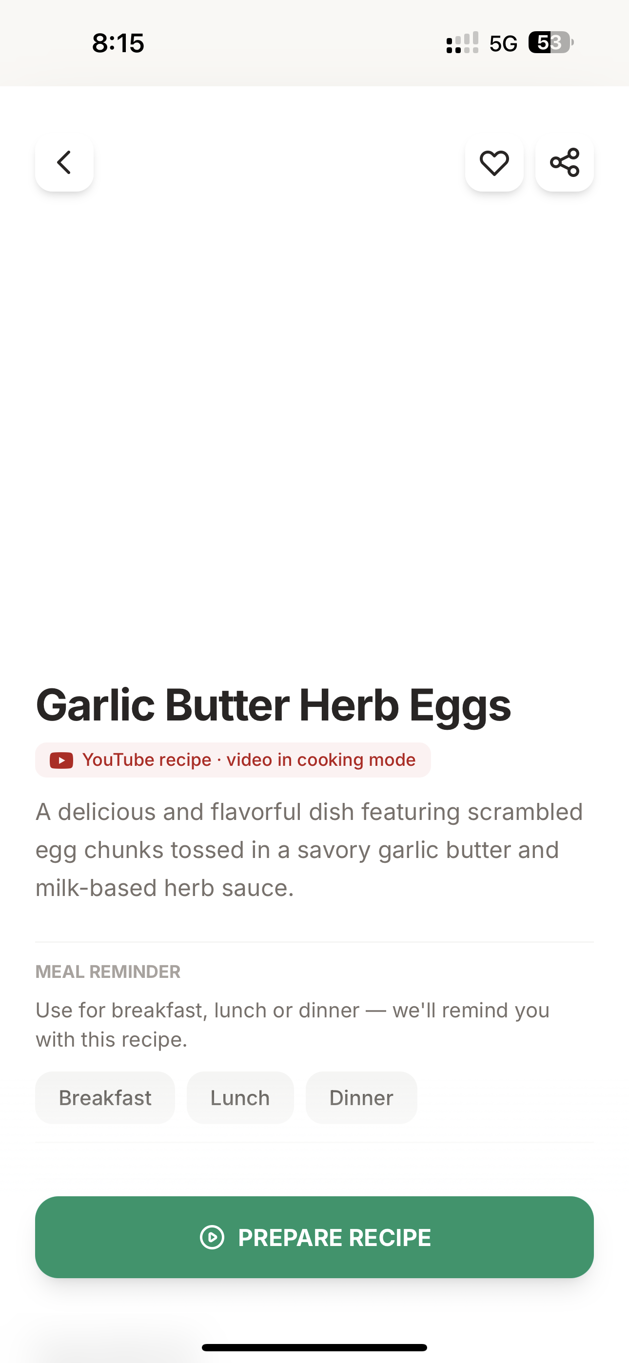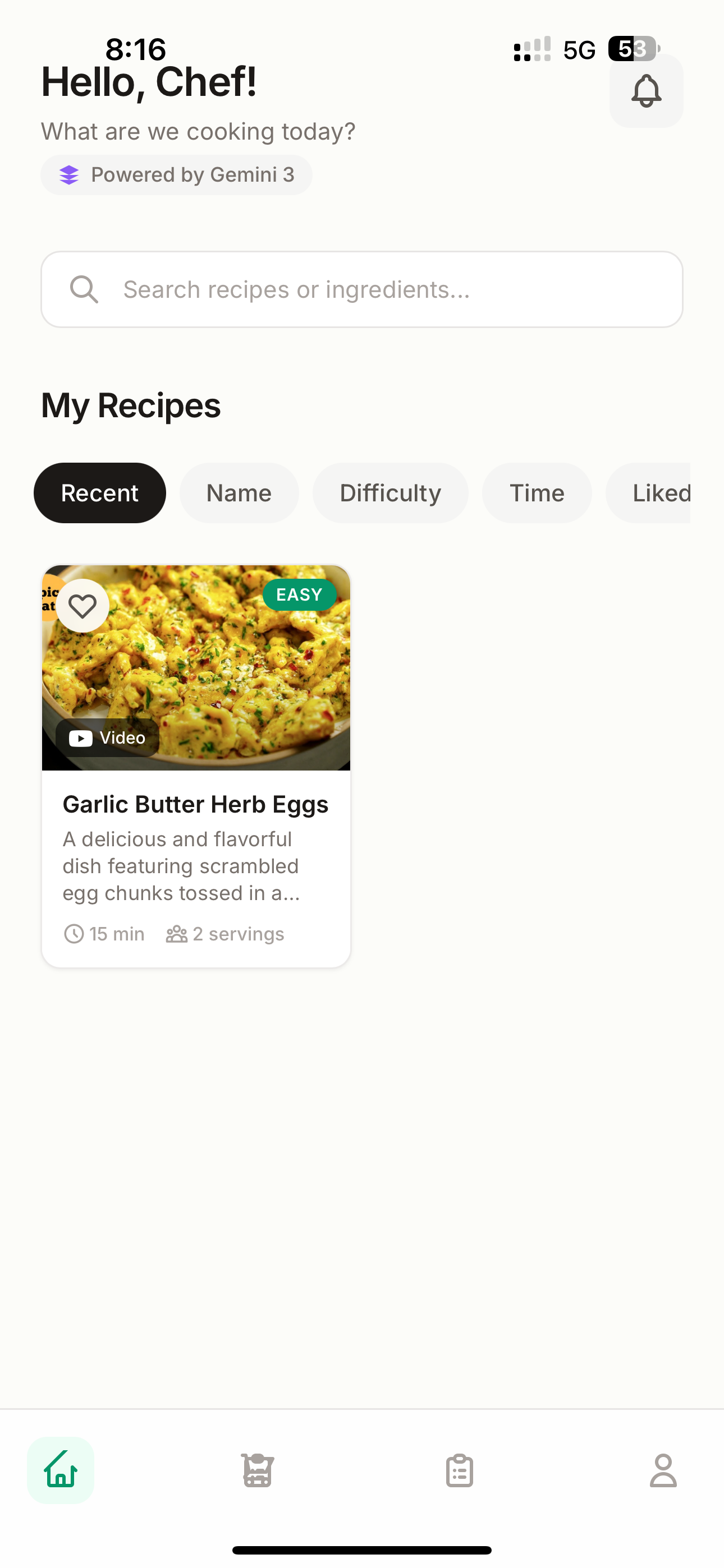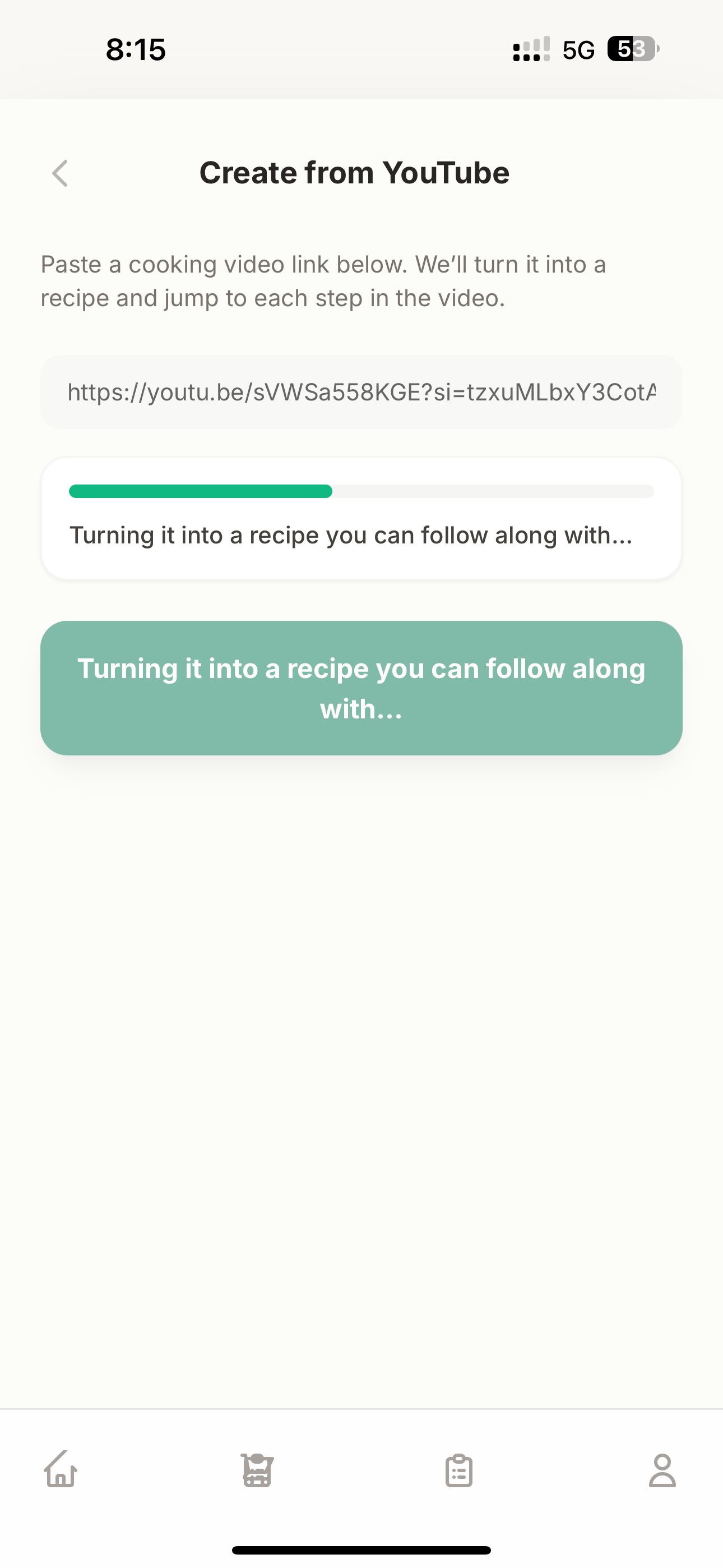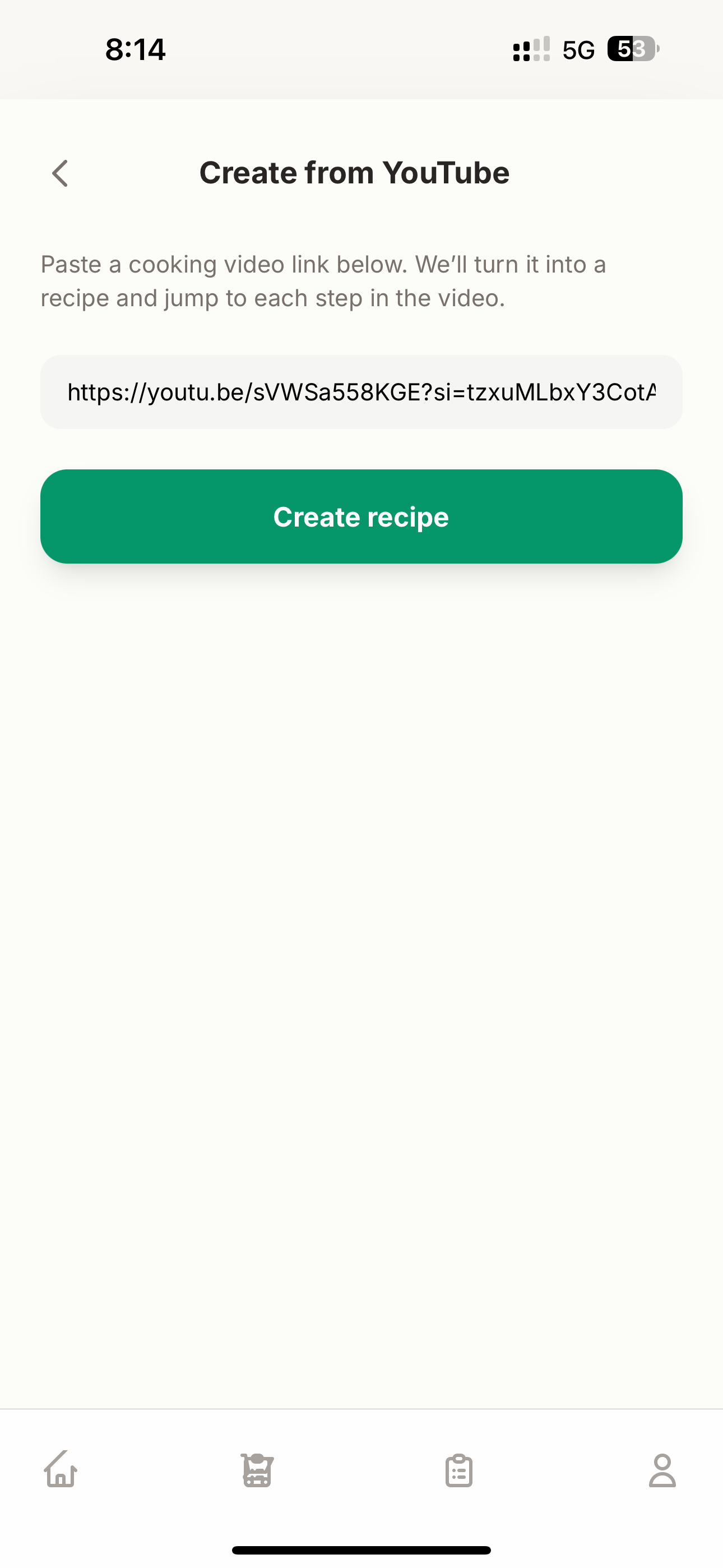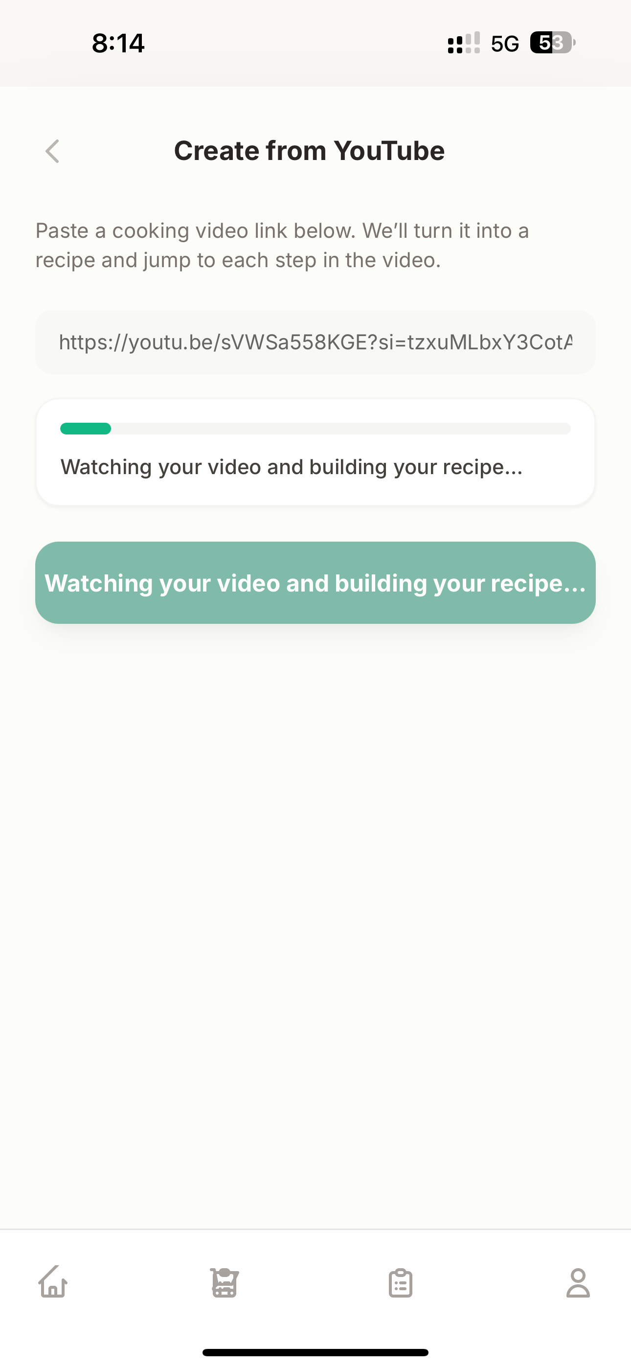 - Create recipes from YouTube — Paste a cooking video URL. Gemini watches the actual video, extracts a timestamped transcript, then builds a structured recipe where every step is linked to the exact moment in the video (MM:SS). When you cook, the video and instructions stay perfectly in sync.