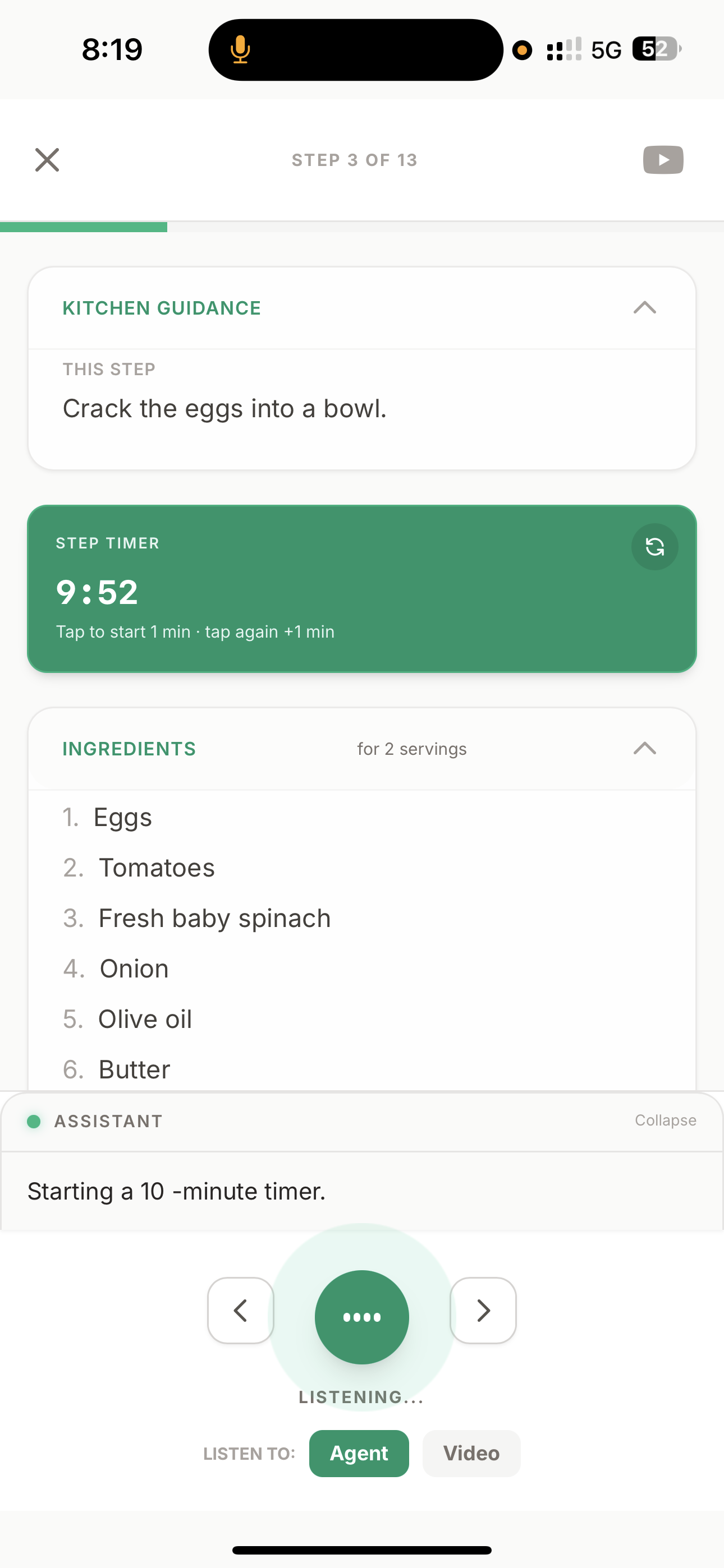 We asked ourselves: What if your phone could actually cook with you? Not just display a recipe — but listen, speak, navigate, set timers, control the video, track your ingredients, and adapt to your dietary needs — all through voice, completely hands-free?