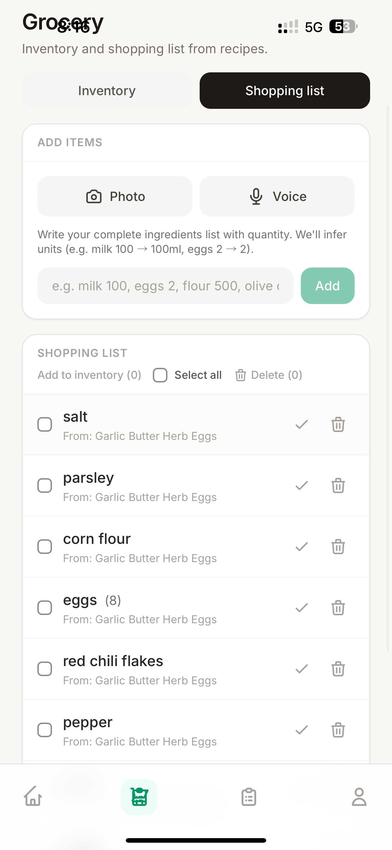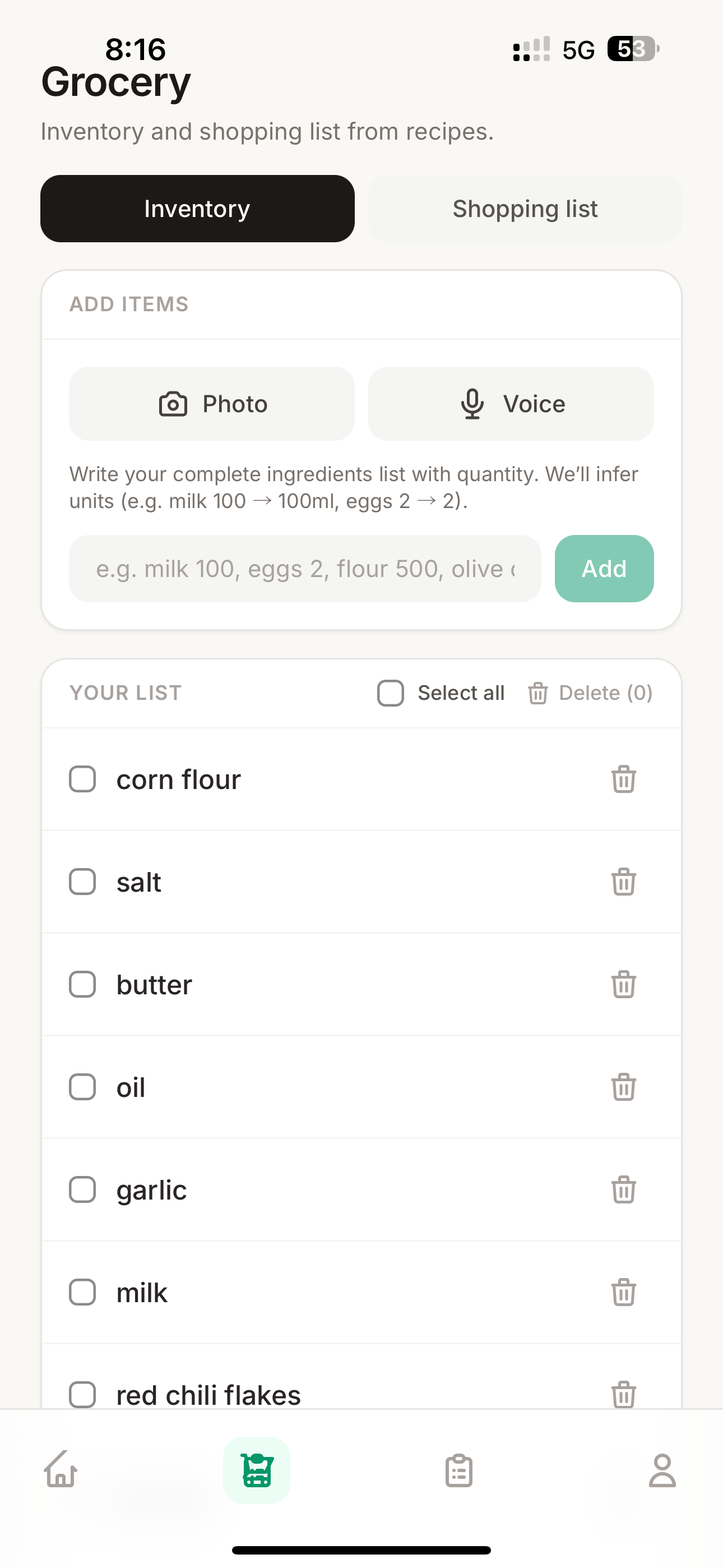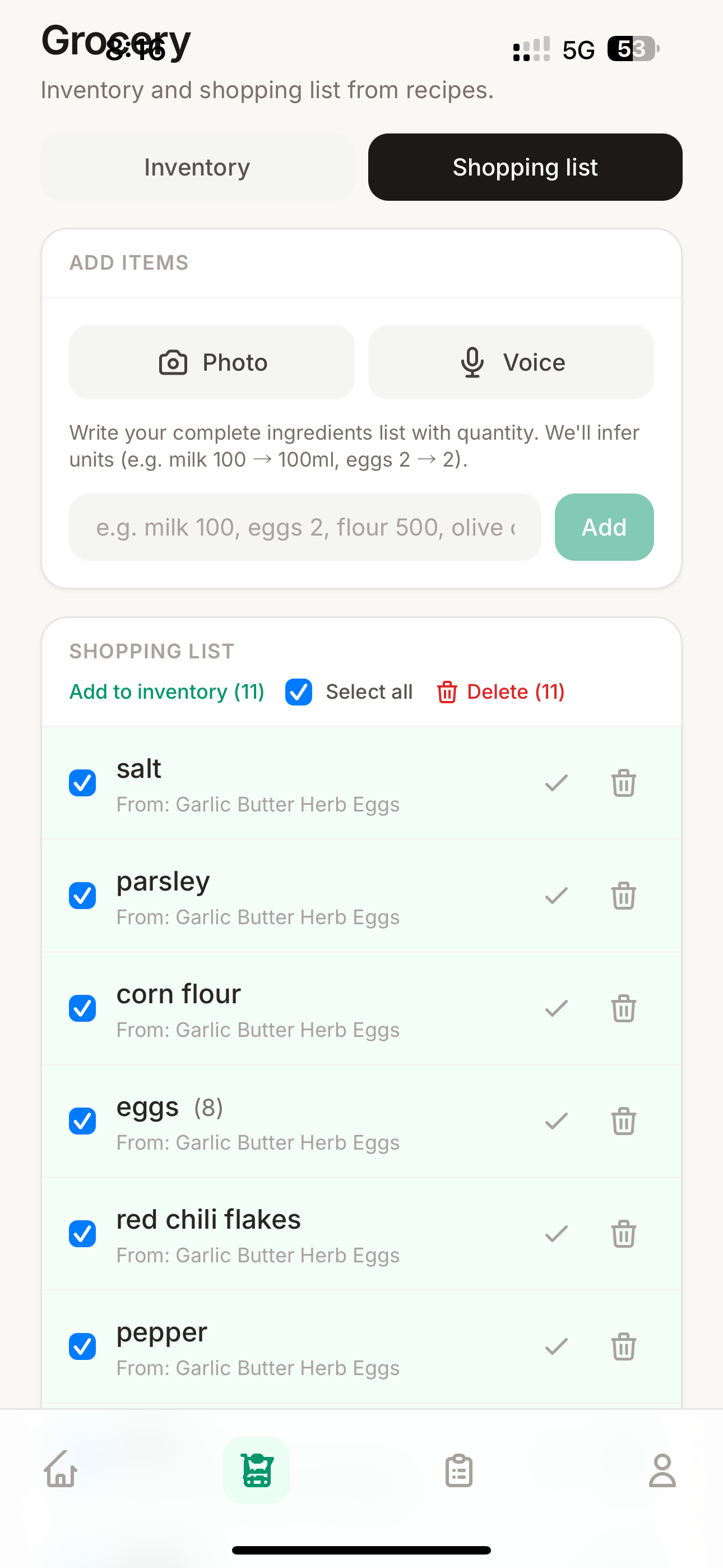 - Smart inventory — Add groceries by snapping a photo of a receipt, speaking a list, or typing. Gemini intelligently parses items with quantities and units. When you finish cooking, used ingredients are auto-deducted.
