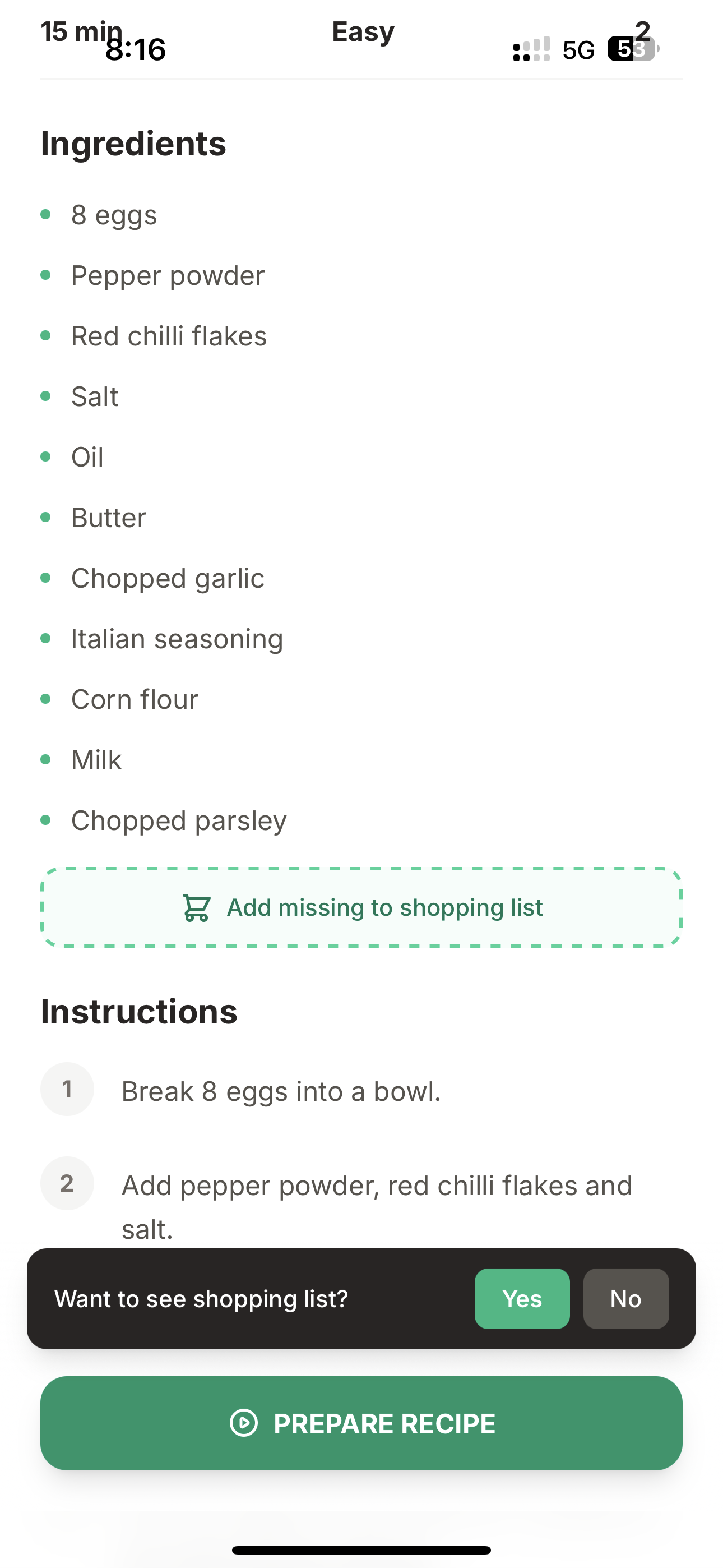 - Shopping list — Missing ingredients for a recipe? One tap adds them to your shopping list, tagged with which recipe needs them.