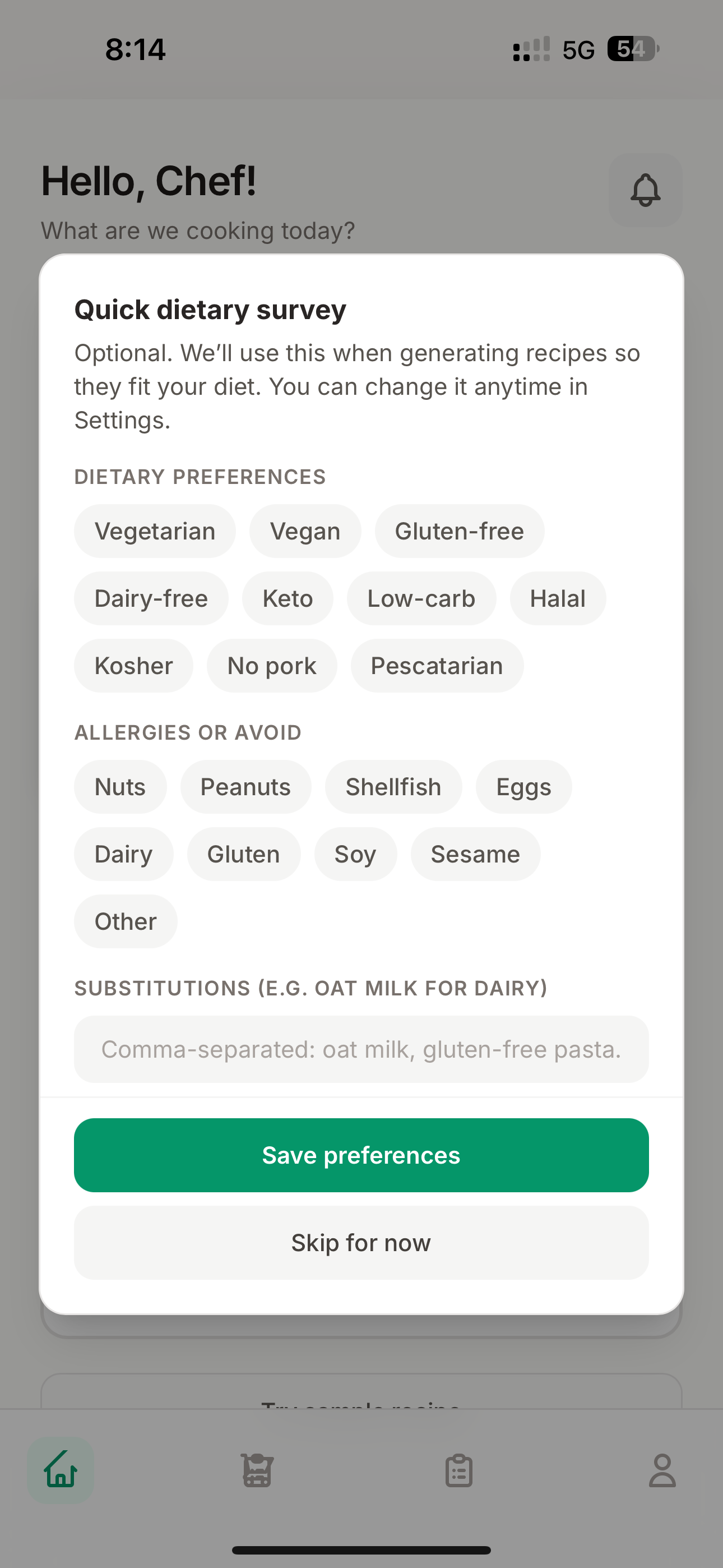 - Ingredient scanner — Point your camera at your fridge or pantry. Gemini Vision identifies everything it sees. Then it recommends recipes you can make right now with what you have.