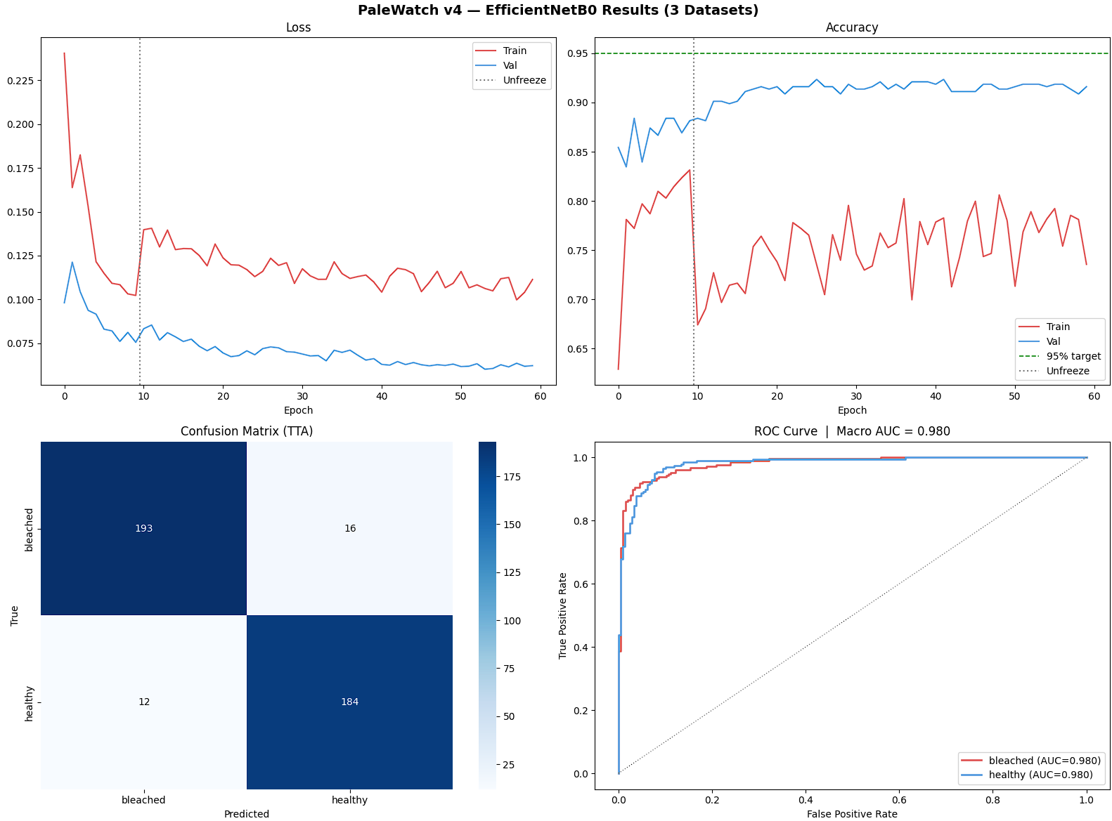 The first layer was the machine learning model. We started in Kaggle, sourcing coral images from three separate datasets and merging them into a single unified training set of 3,962 images. We trained an EfficientNetB0 convolutional neural network using a two-phase approach: first training only the classifier head while the backbone stayed frozen, then unfreezing the entire network for fine-tuning with MixUp and CutMix augmentation. After 60 epochs and test-time averaging the model hit 95.63 percent test accuracy.