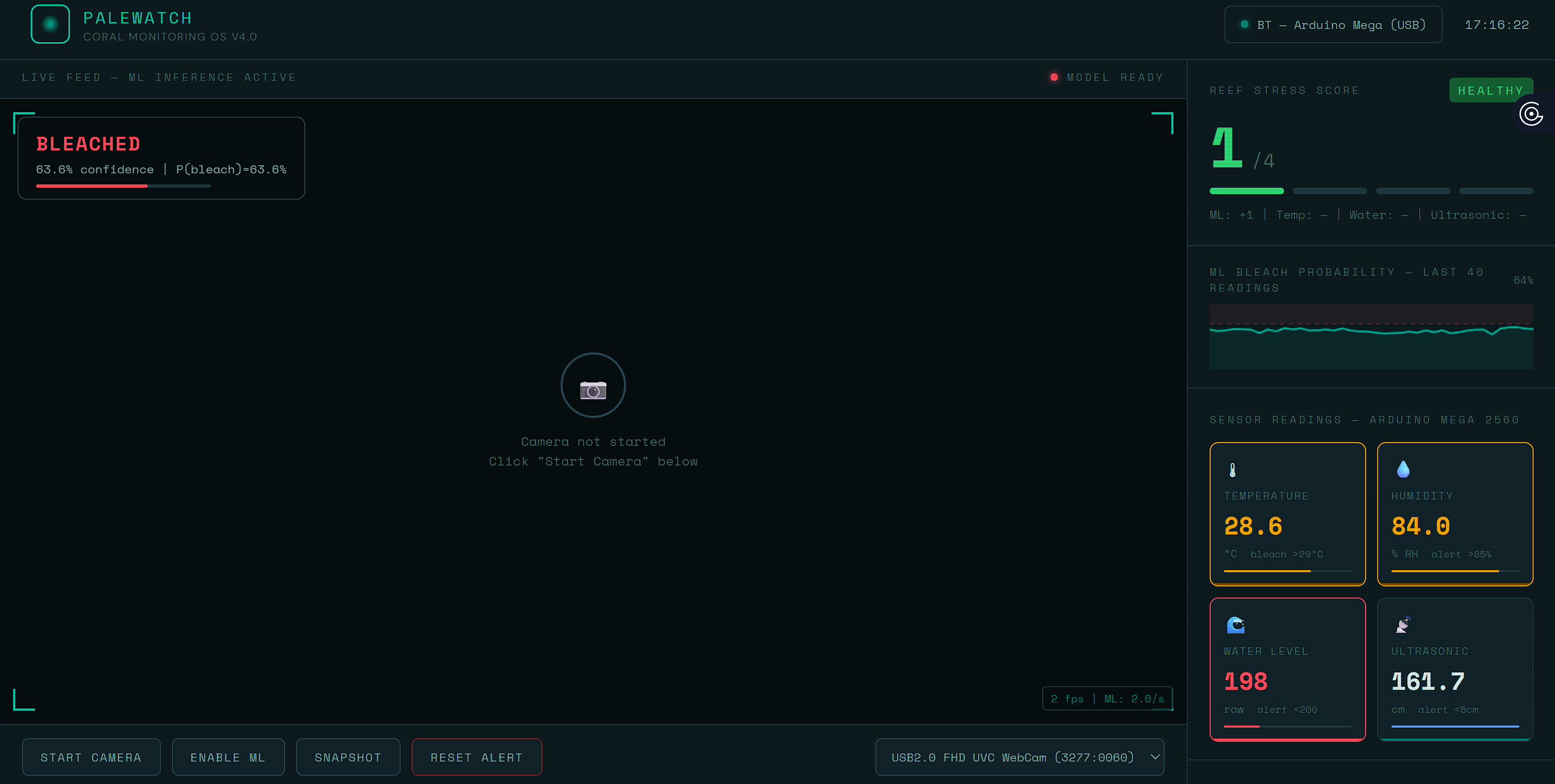 PaleWatch OS is a fifty dollar early warning system for coral nurseries that combines a 95 percent accurate bleaching detection model running live in a browser with a fully autonomous Arduino sensor array, built because the tools that existed were either too expensive or too limited to catch the problem before it was too late.