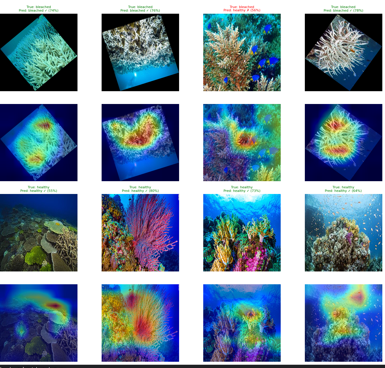 The second major challenge was the browser normalization bug. Because the model was producing plausible-looking outputs (correctly identifying bleached versus healthy most of the time) it was not obvious that the normalization was wrong. Only when we printed the raw logits to the console and saw values of 0.70 and 0.07 instead of the expected 3.5 and negative 2.1 did we realize the predictions were far less sharp than they should be.