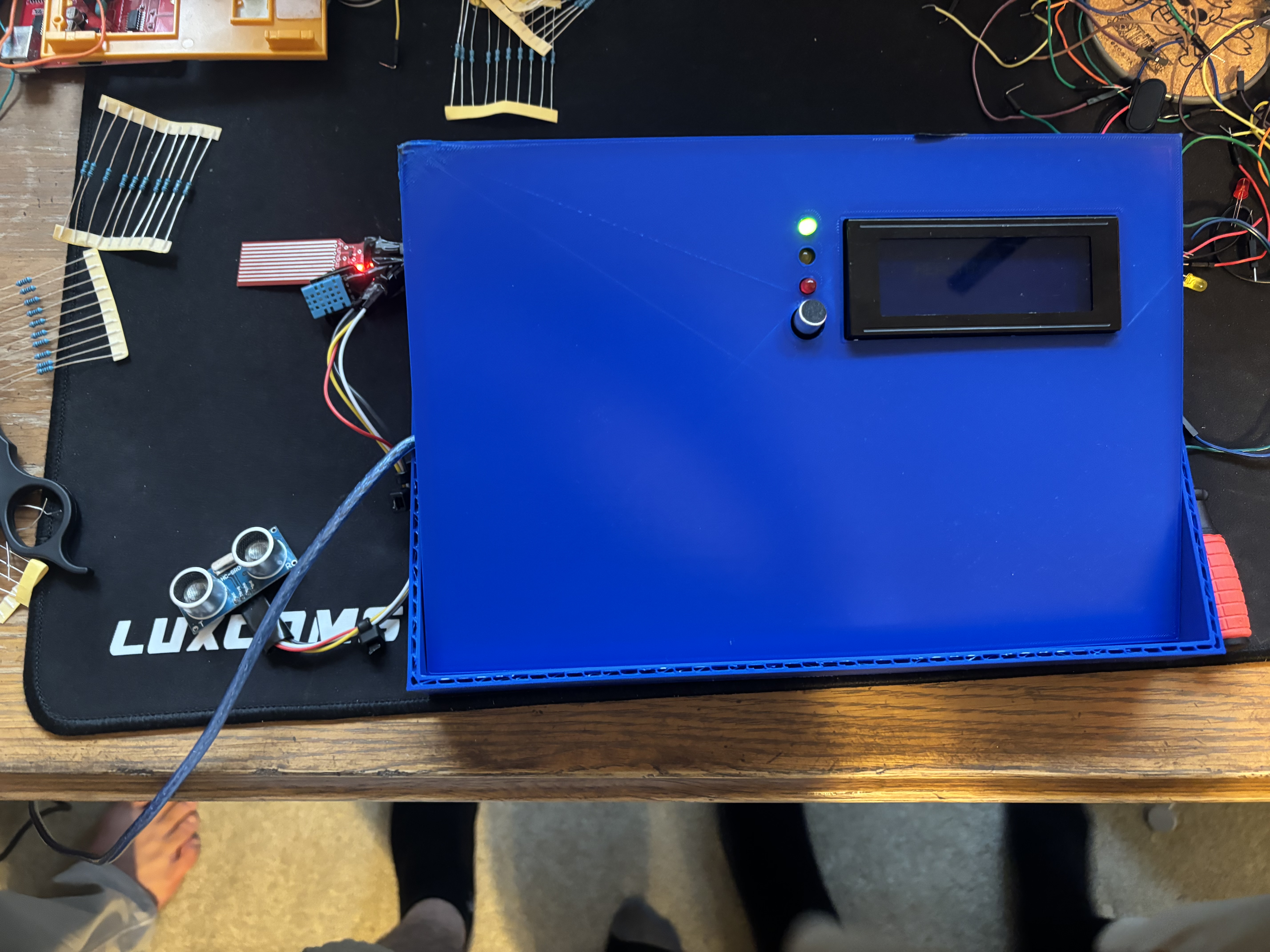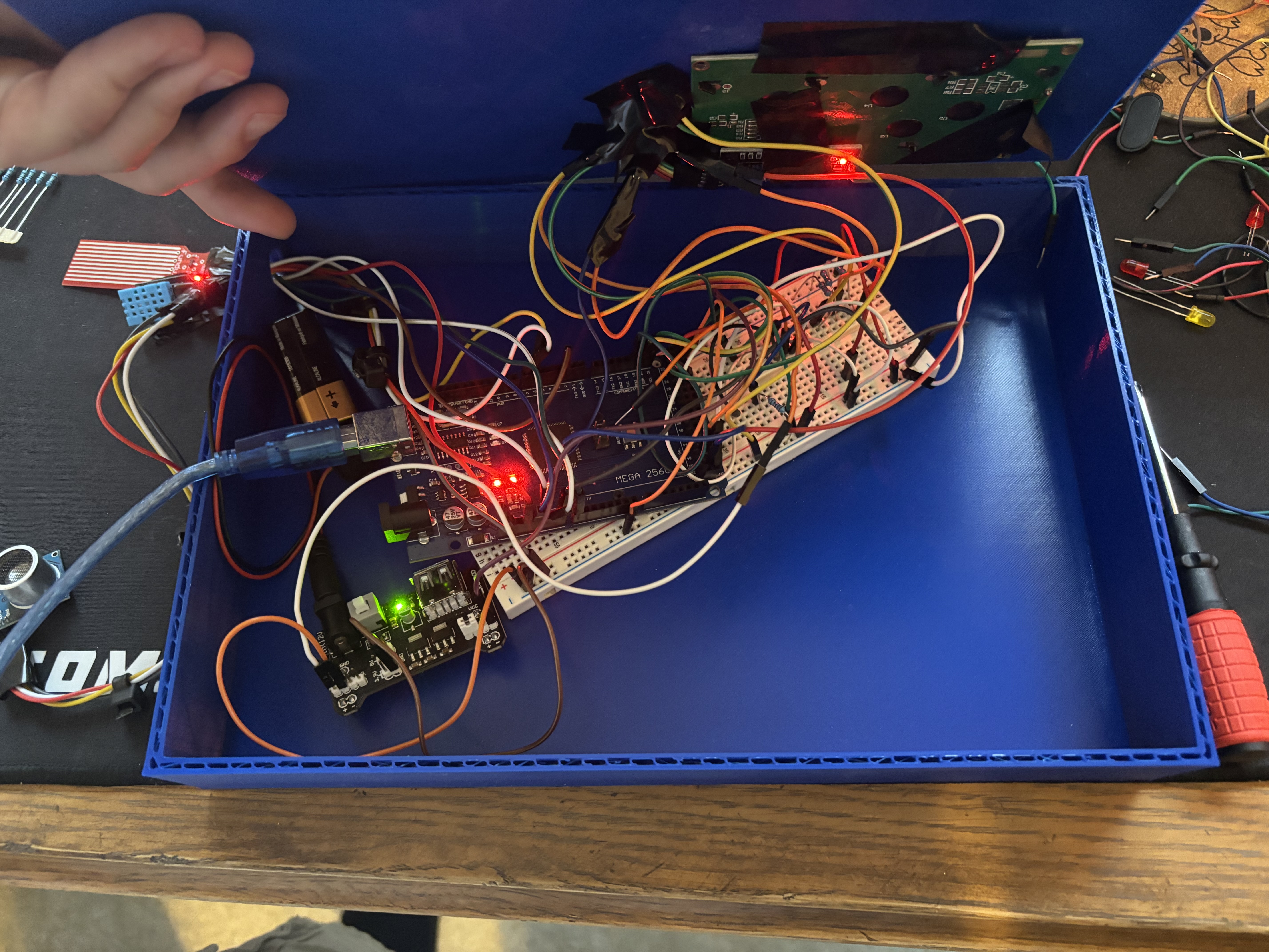 The second layer was the hardware. We wired a DHT11 temperature and humidity sensor, a moisture sensor for runoff detection, and an HC-SR04 ultrasonic sensor to an Arduino Mega 2560. We added three LEDs for visual status, a buzzer for critical alerts, a servo motor to control a vent flap, and an I2C LCD display. The Arduino firmware runs completely standalone, calculating its own stress score and driving all physical outputs without needing the laptop to be connected.