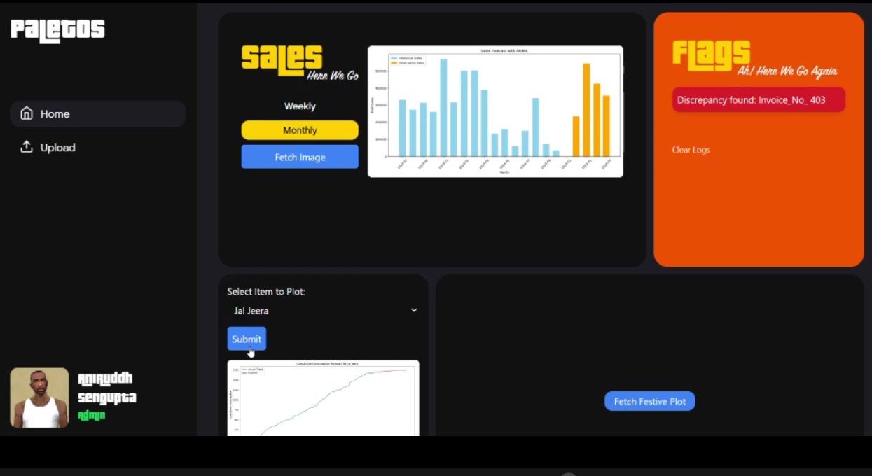 β οΈ Challenges We Ran Into Handling over 30 CSV files, each with unique schemas and over 2 million rows of unclean data, was a significant challenge. The initial unfamiliarity with MLOps made setting up a robust pipeline from scratch a steep learning curve. Integrating various data sources seamlessly and ensuring consistent predictions was technically demanding. Ensuring the accuracy of forecasts with real-time data updates required a well-designed feedback mechanism. π Accomplishments That We're Proud Of Successfully created a deployable web-based interface that turns messy raw data into actionable insights in real-time. Implemented an ARIMA model that accurately forecasts sales and predicts seasonal demands aligned with Indian festivals. Designed a robust anomaly detection system capable of flagging potential theft or unsettled payments. Despite being new to MLOps, we made it to the top 10 teams in the hackathon out of 1300+ participants. π What We Learned Deepened our understanding of MLOps, from data ingestion and cleaning to deployment and real-time monitoring. Learned how to work effectively with large, unstructured datasets and transform them into a usable format. Improved our machine learning skills, specifically in time-series forecasting using ARIMA. Enhanced our ability to develop a scalable solution that works for a diverse set of restaurant owners. βοΈ What's Next for Paleto's Restaurant Network Backend Enhancements: Integrating advanced machine learning models to improve the accuracy of predictions further. Live Data Adaptation: Enable continuous learning from live data inputs to refine the modelβs performance. User Dashboard: Develop a more detailed user dashboard with interactive visualizations and deeper insights.