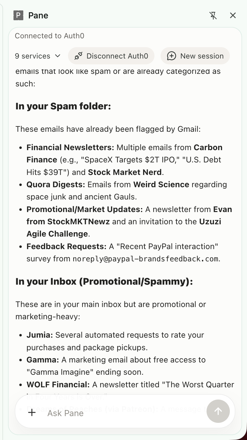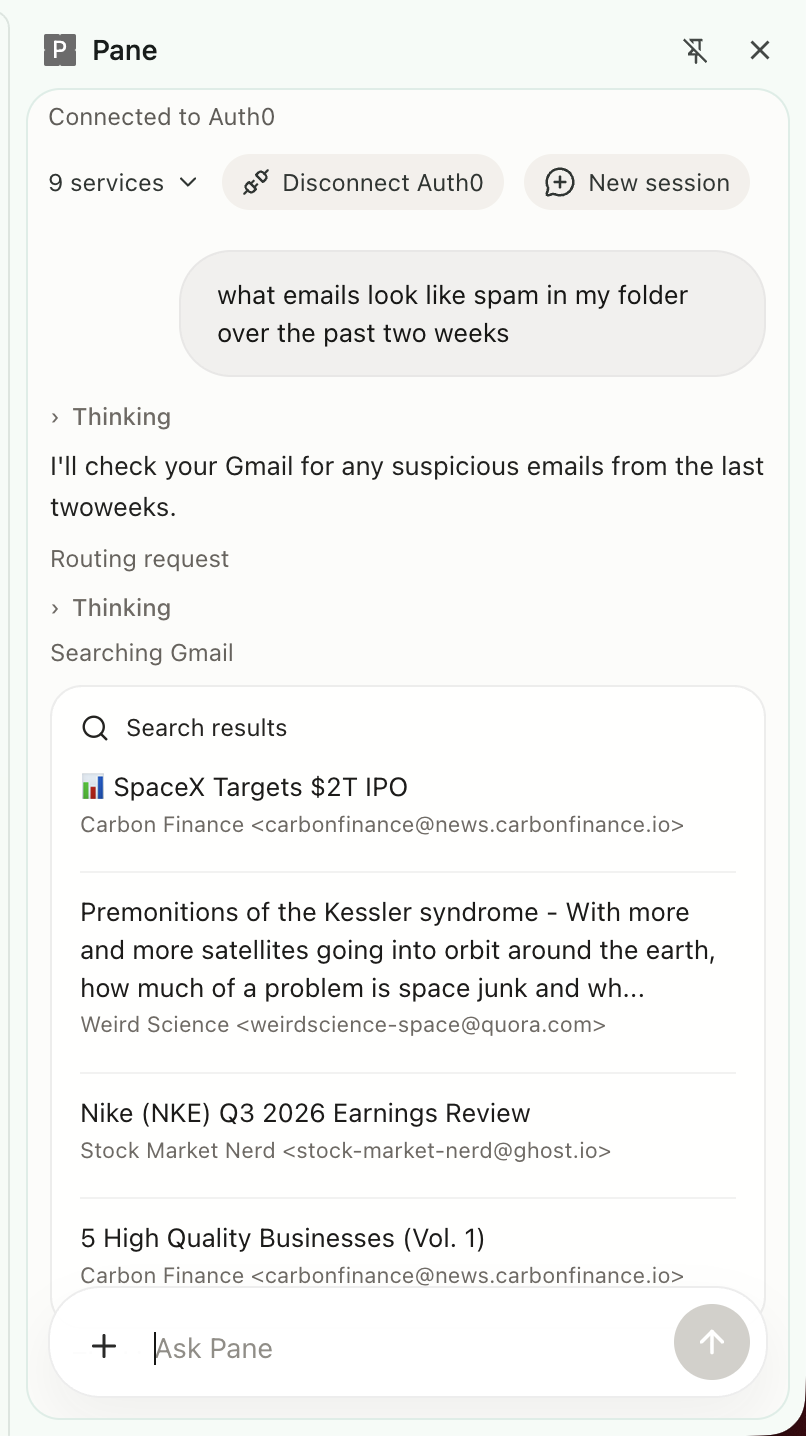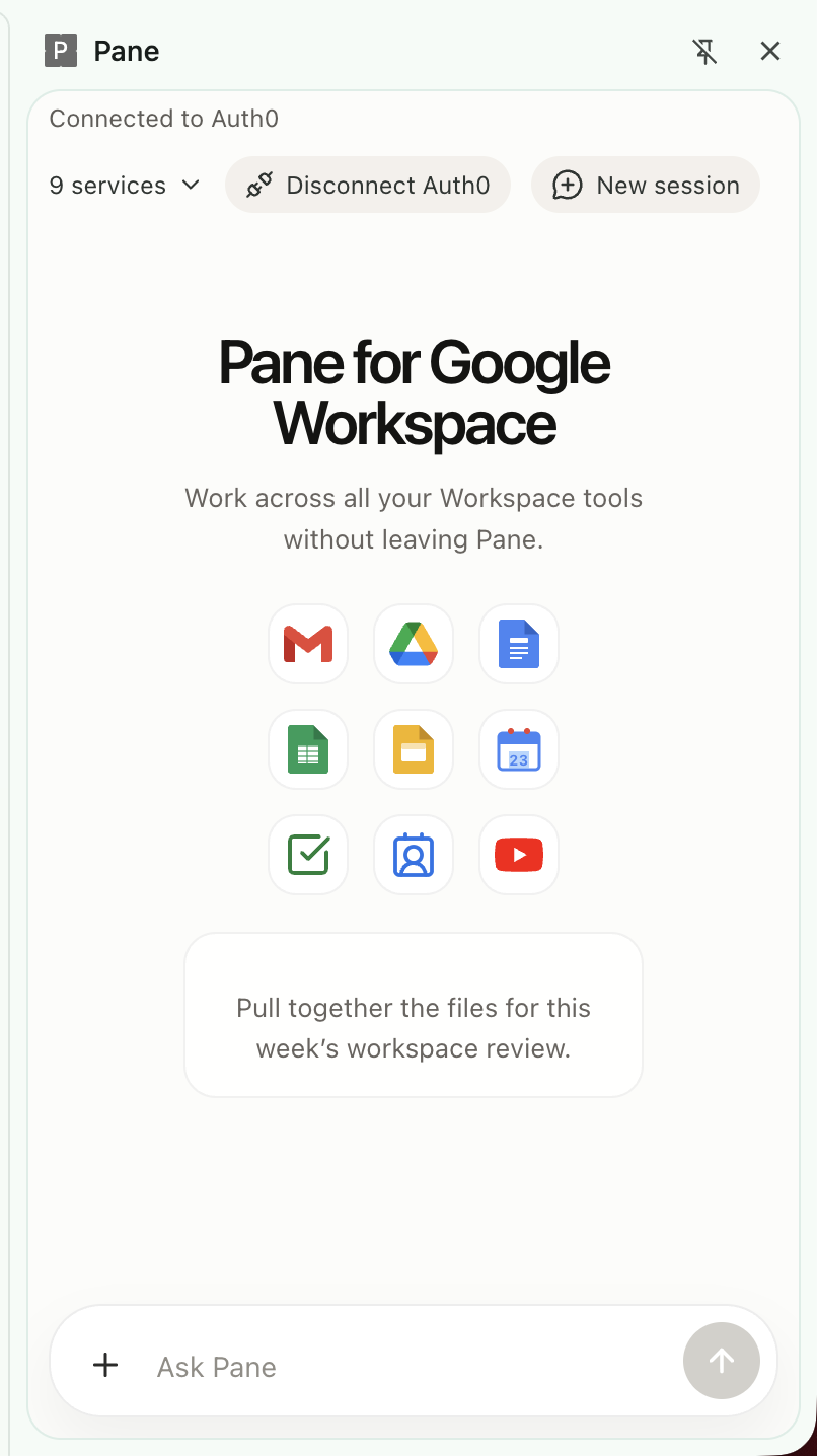 Pane is a Chrome side-panel assistant for Google Workspace. Sign in once, connect Google through Auth0, and work across multiple services from a single conversational interface.