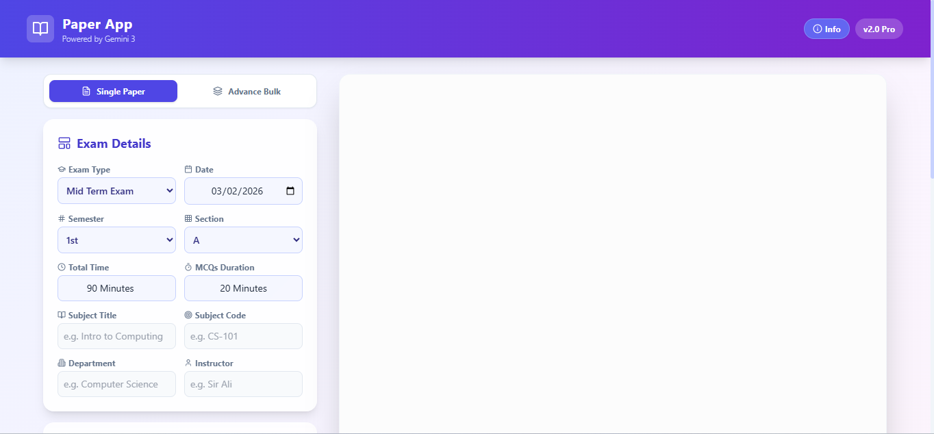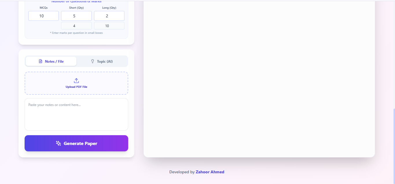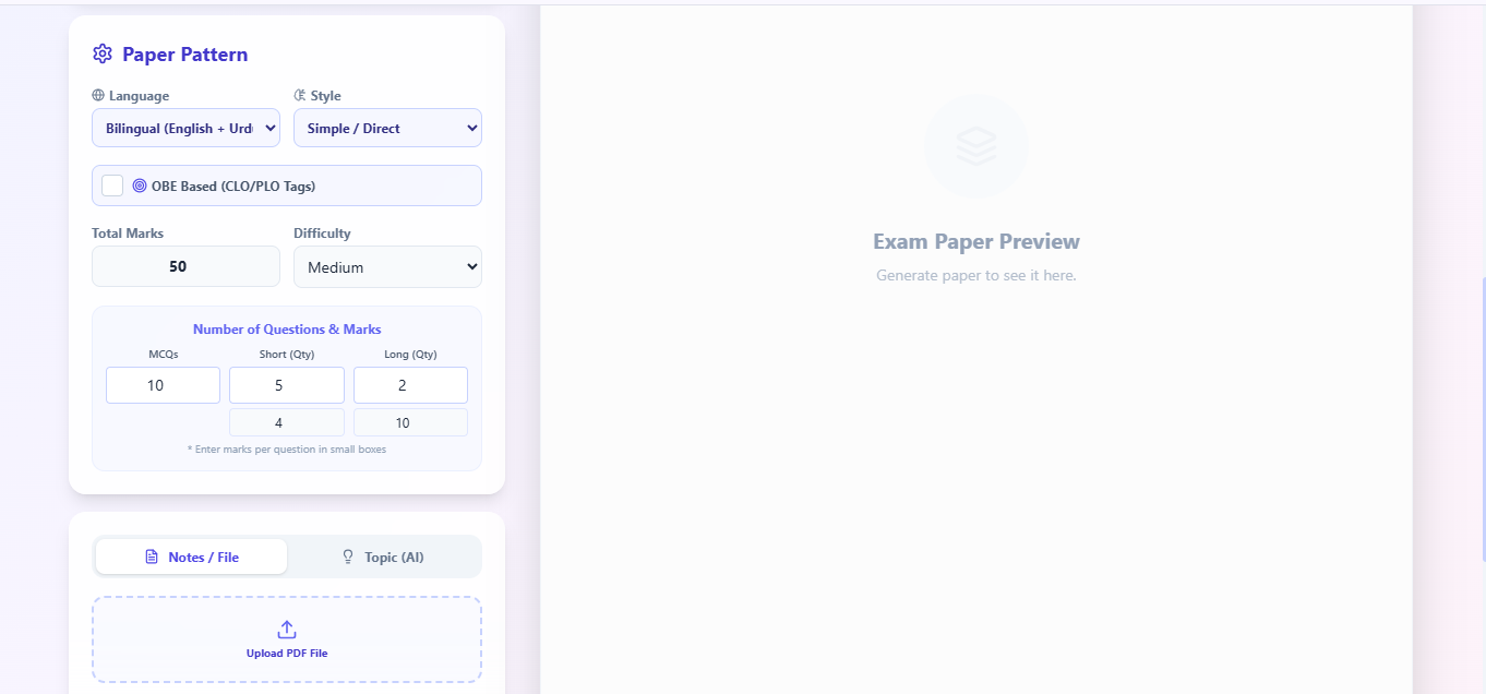 Paper App – AI-Powered Assessment Design System creates complete, structured exam papers from syllabus PDFs, pasted notes, or simple topic inputs. It supports both outcome-based (CLO/PLO-aligned) and simple modes, allows control over difficulty levels (easy, medium, hard), flexible marks distribution, scenario- based questions, and customizable paper headers (semester, department, date, etc.). The final output can be copied or exported as a DOC file, ready for real academic use.