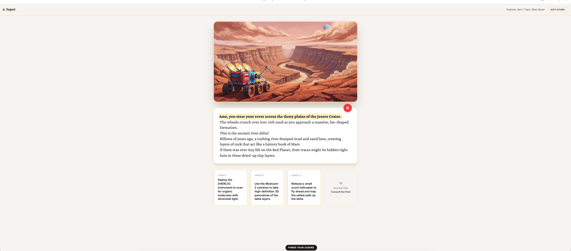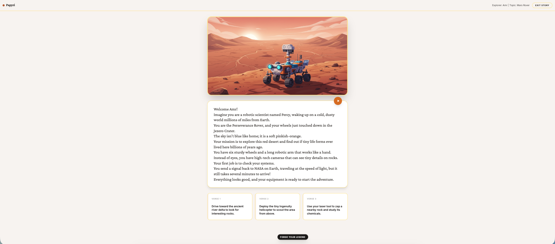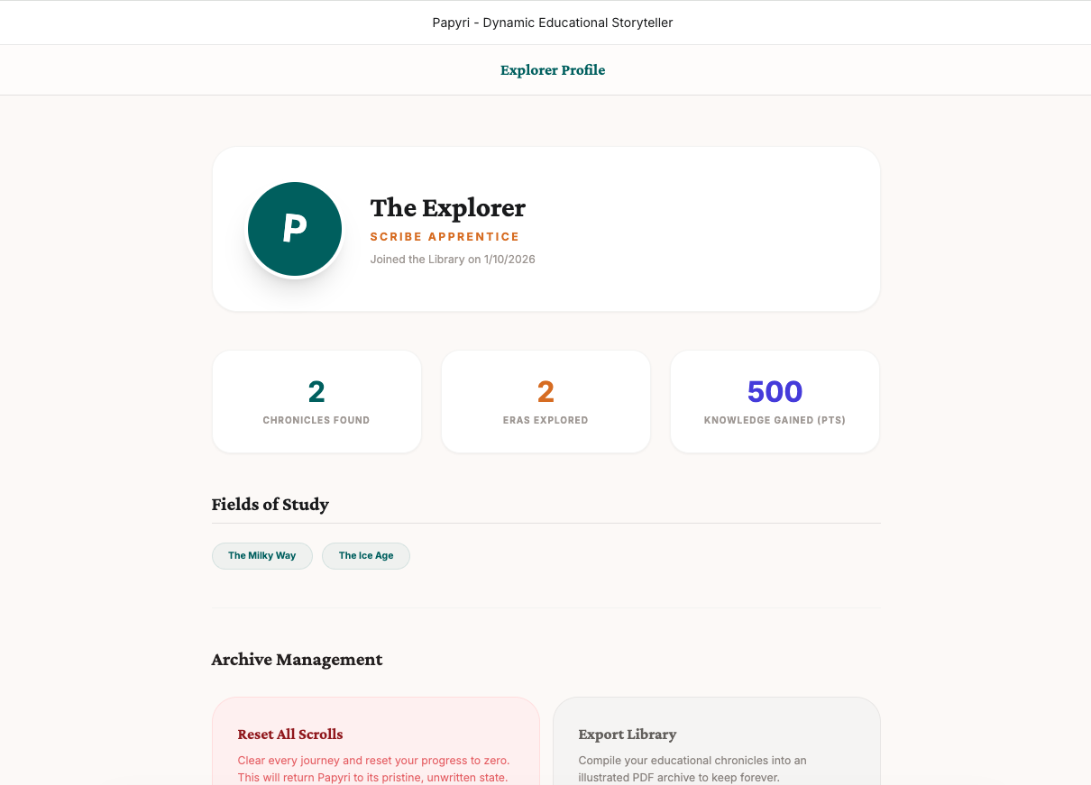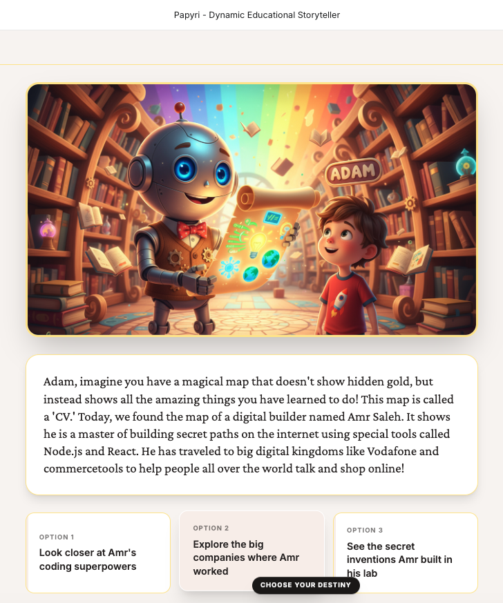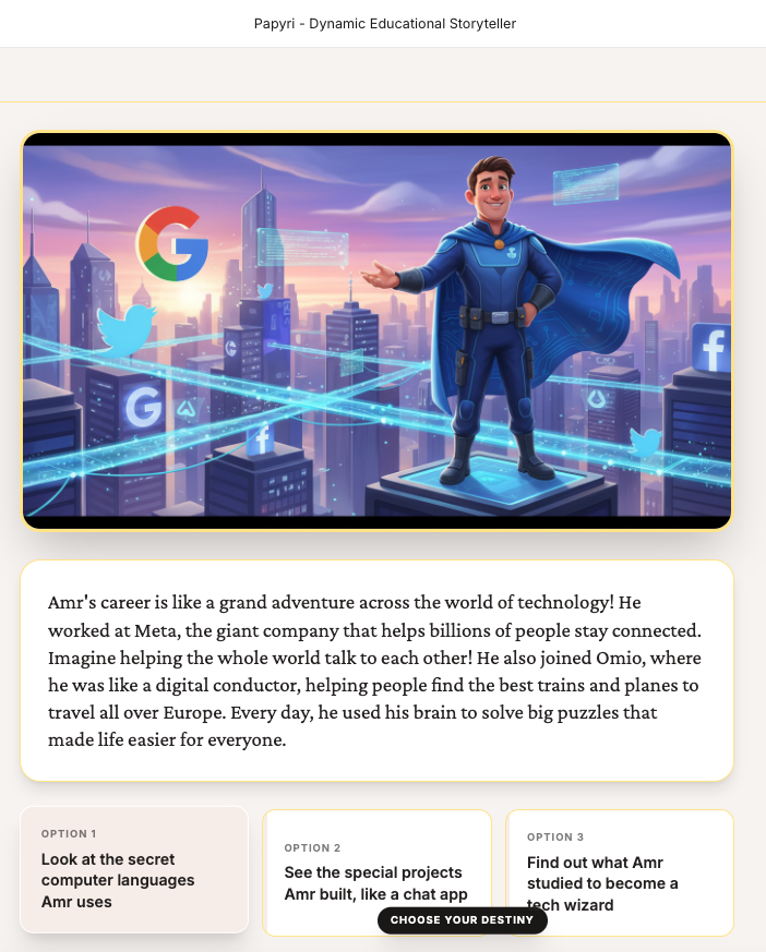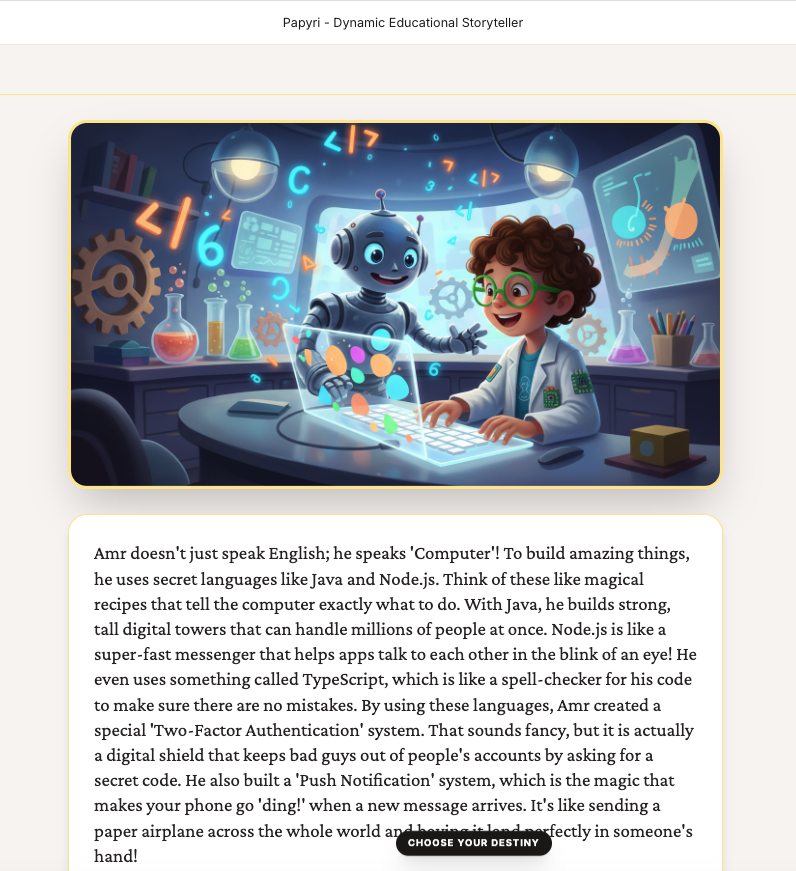Papyri is a dynamic educational storyteller. Users provide their name, age, and a topic they are curious about (or even upload their own reference documents). The app then generates an interactive narrative in real-time. Each "verse" of the story includes: