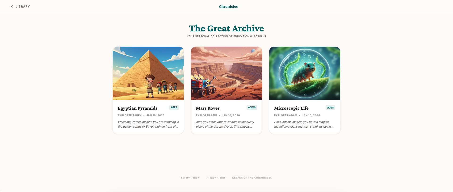 We are particularly proud of the Seamless Multimodal Loop. Seeing a child’s name integrated into a generated story, seeing a unique image of that specific scene, and hearing a voice read it back—all within seconds—feels like magic. We also succeeded in creating a "Library" system that feels premium, making the "Chronicles" page feel like a real archive of personal growth.