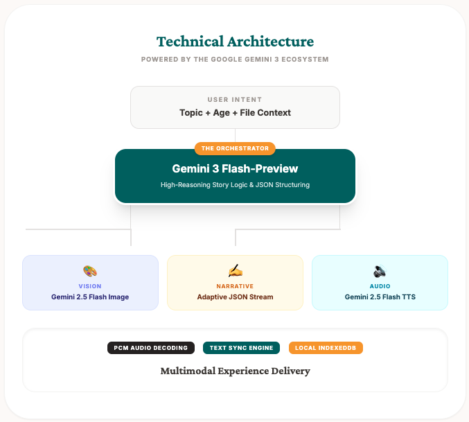 - Gemini 3 Pro/Flash: Used for the high-reasoning task of generating structured JSON that maintains educational accuracy and narrative flow.