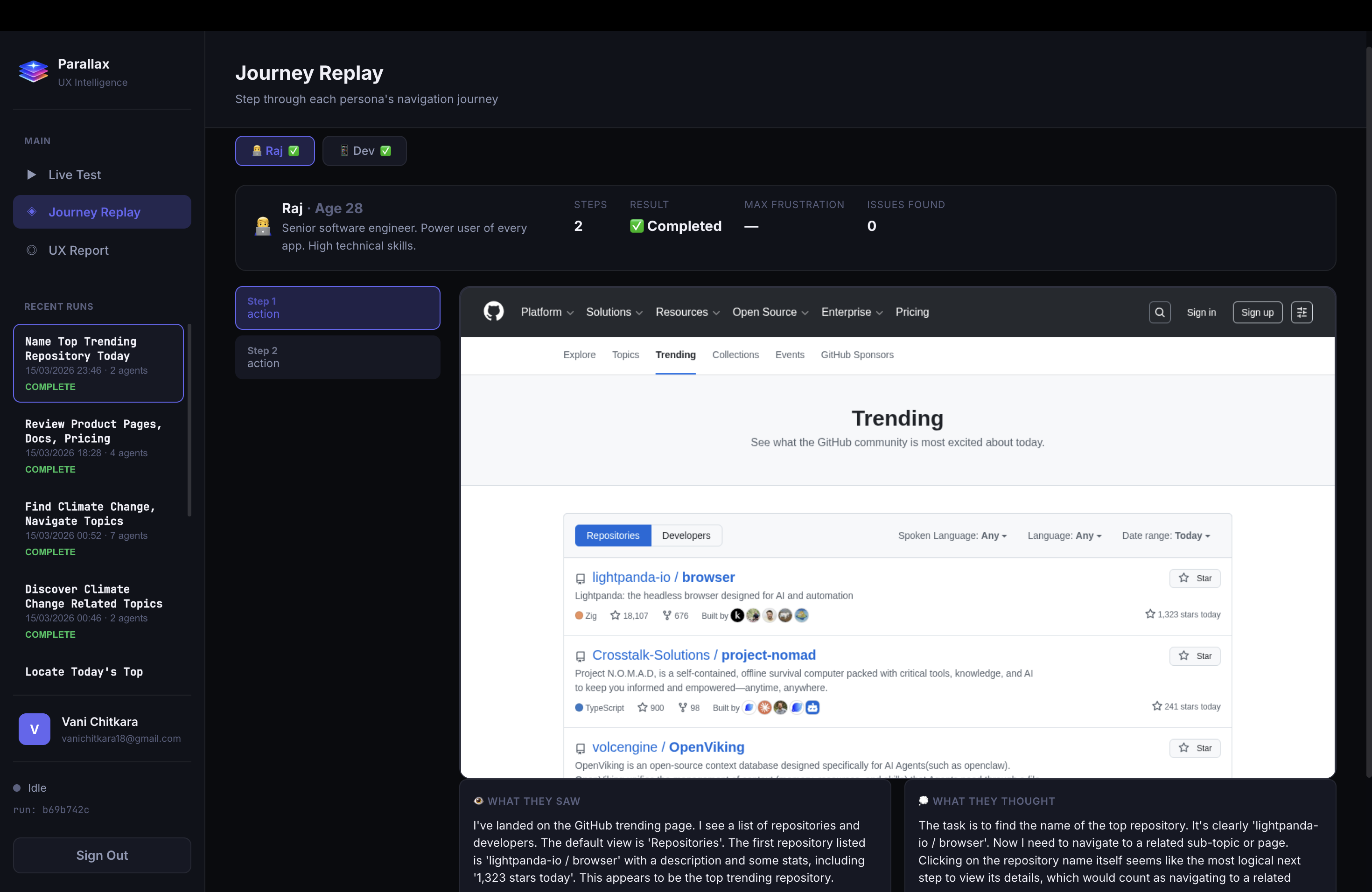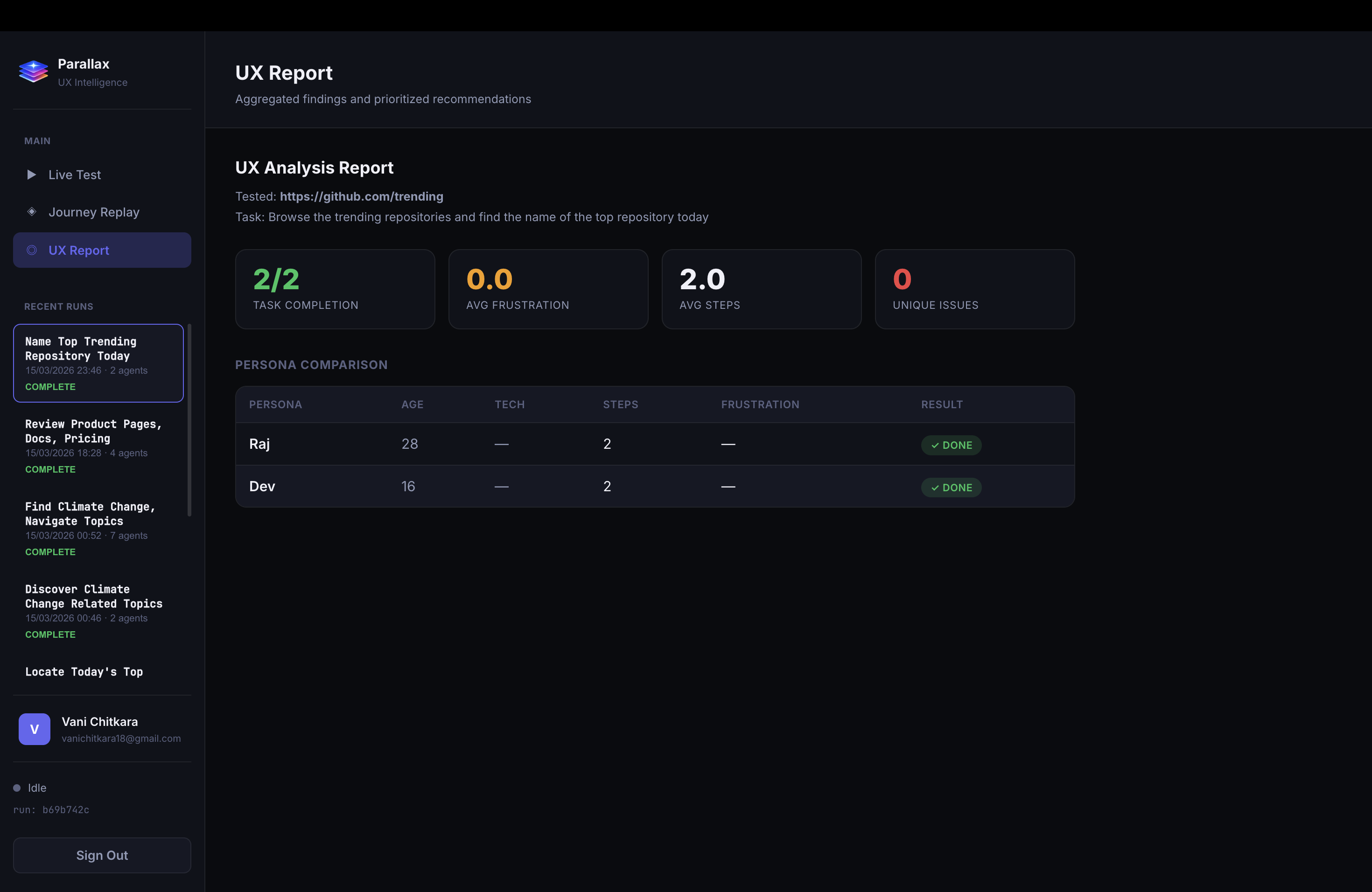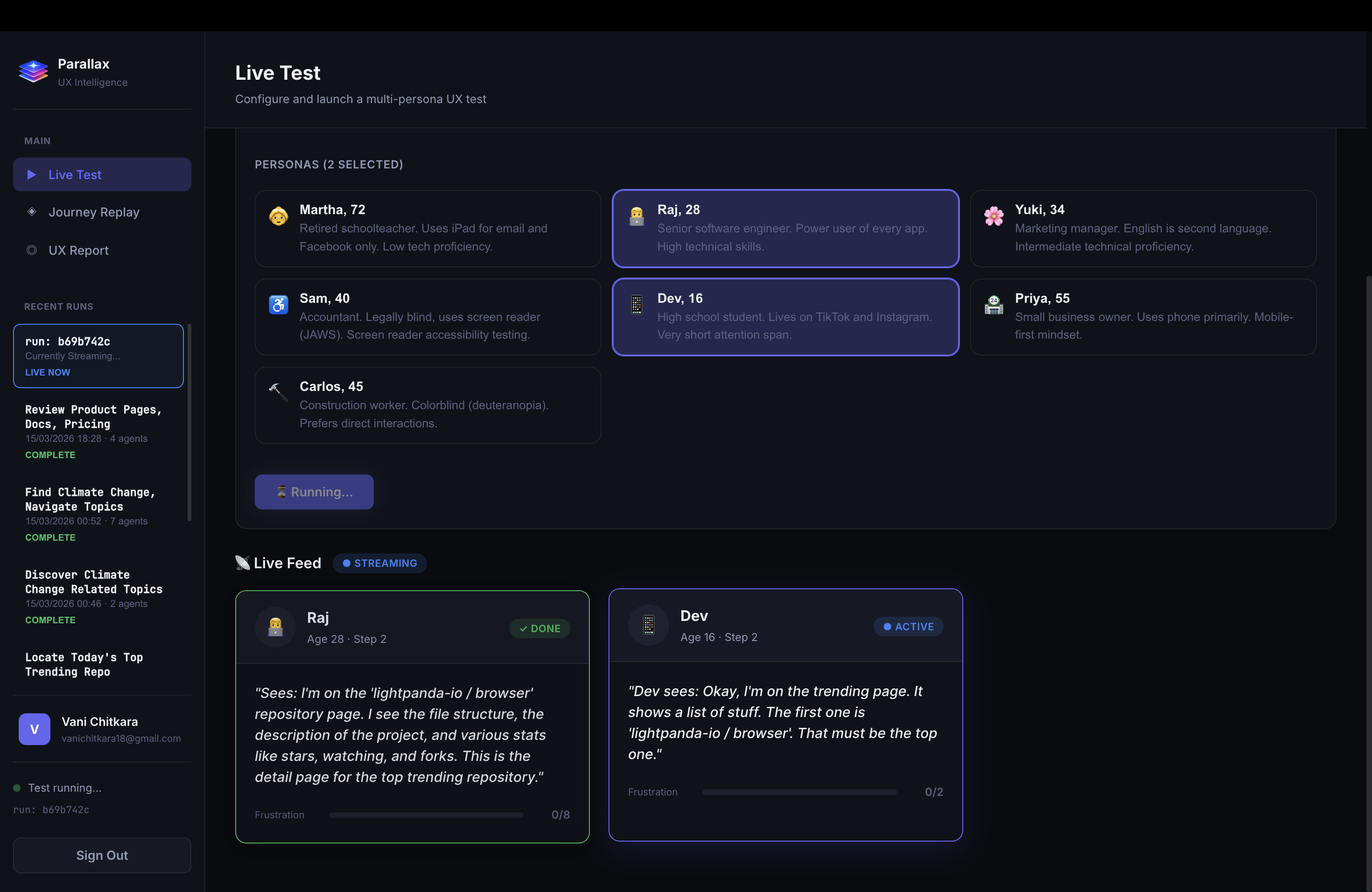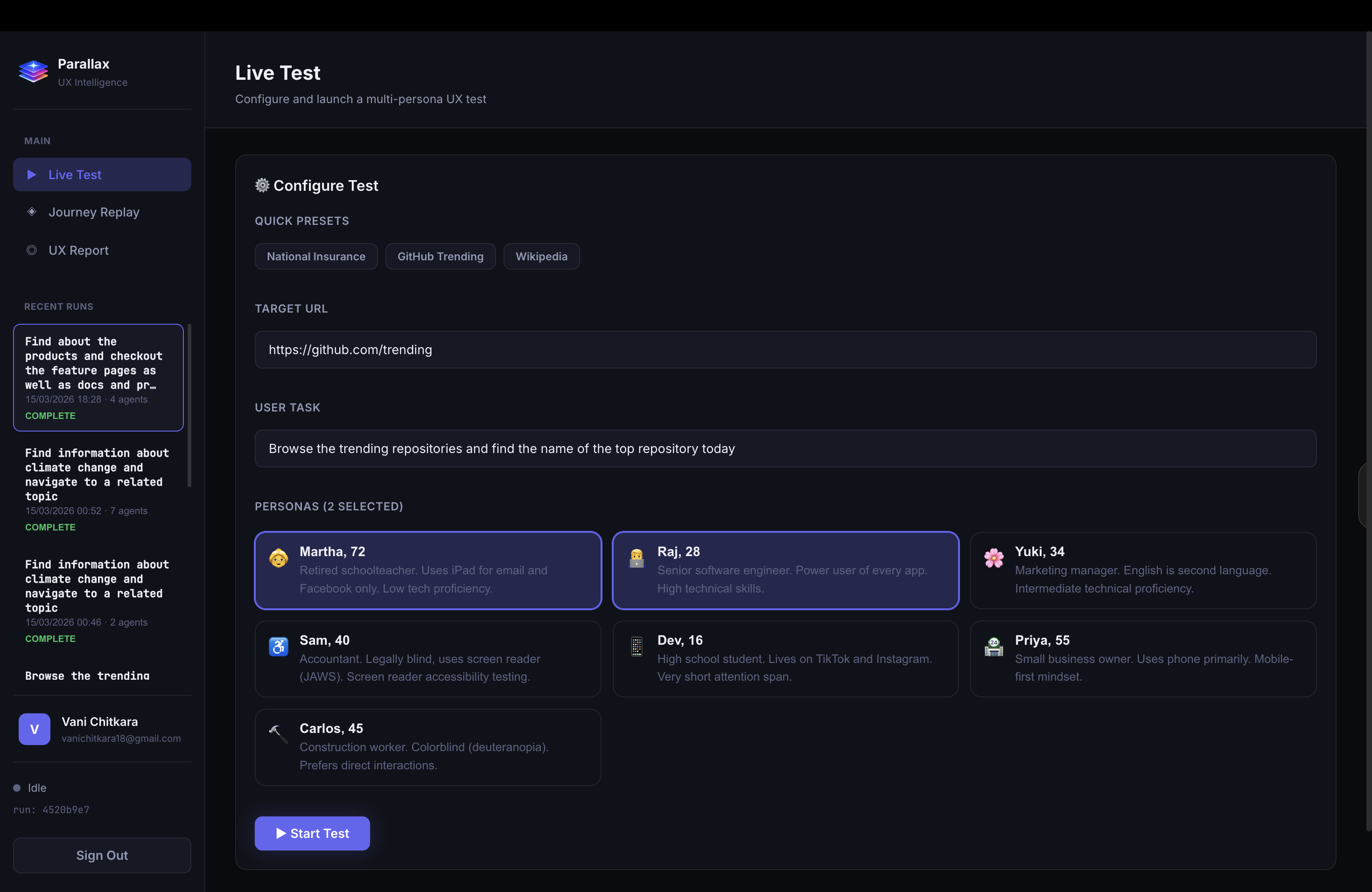 Parallax is a Next-Gen UI Navigator Agent that uses Gemini 2.5 Flash to test websites through the eyes of diverse user personas simultaneously. Users can launch a single test run where "Martha" (72, low tech literacy), "Raj" (28, power user), and many others navigate the target URL autonomously.