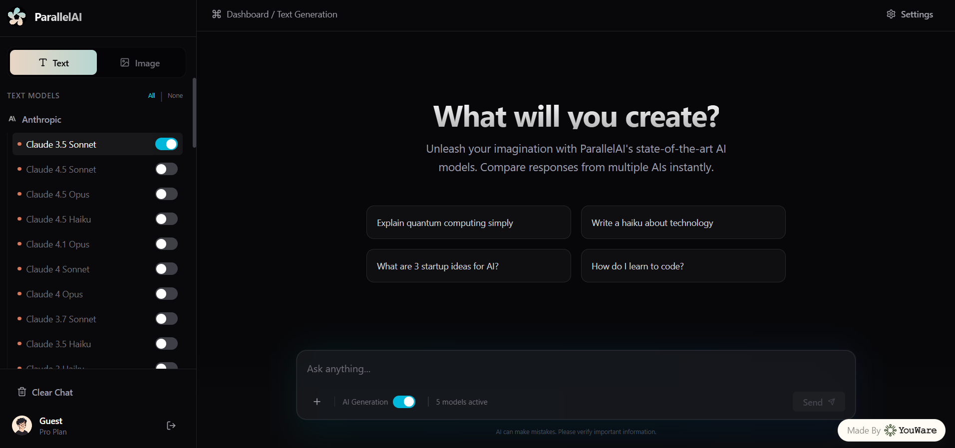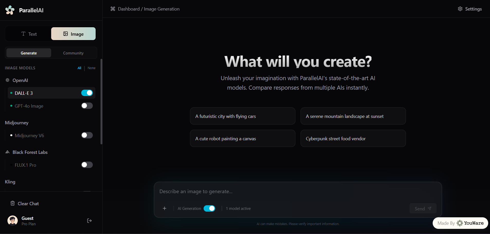 For image generation, multiple AI image models run in parallel, and the results are displayed side by side for easy comparison.