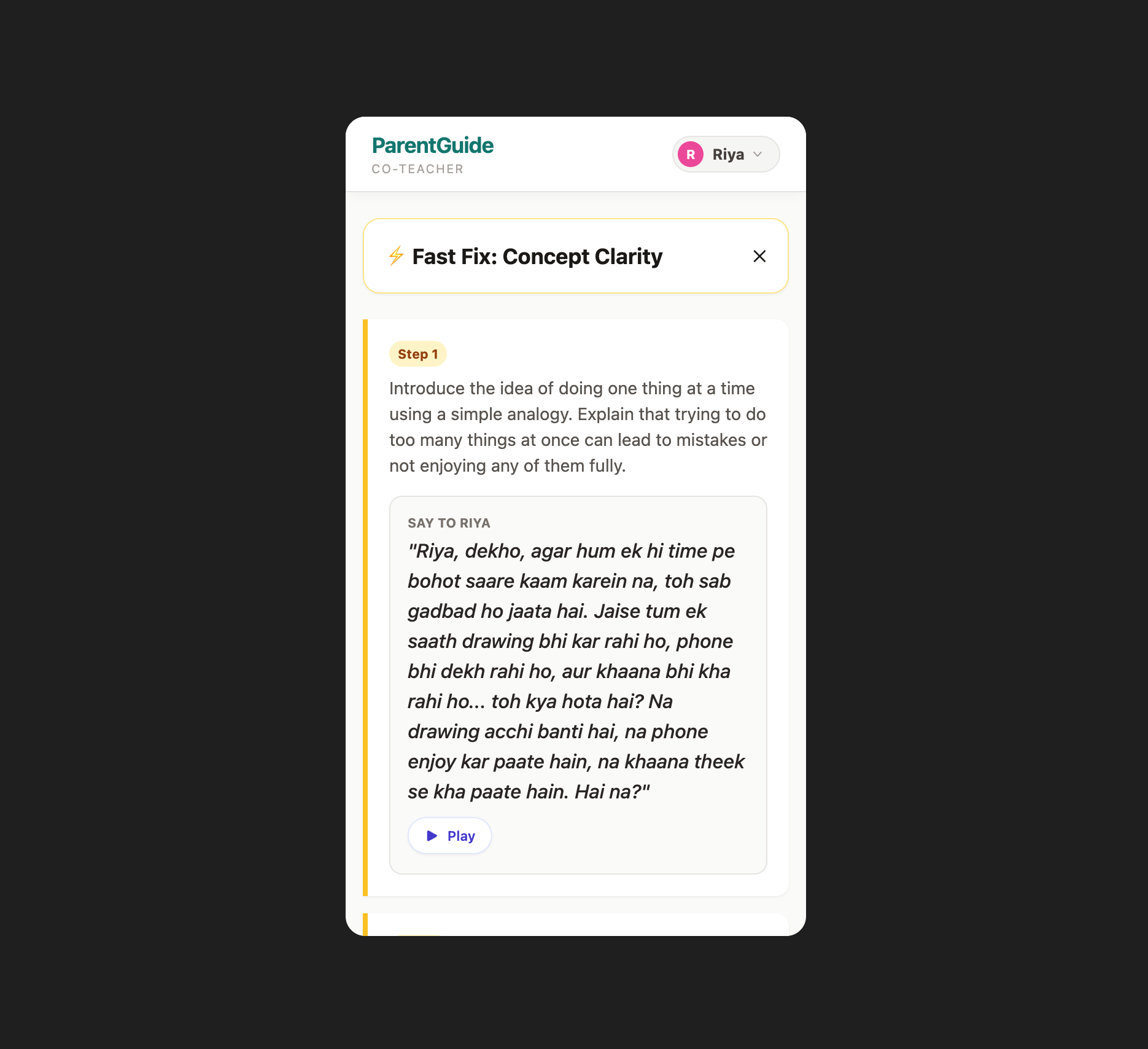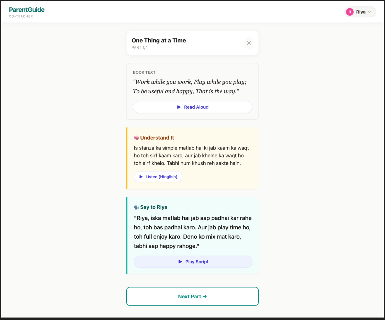 Parent-Co-Teacher transforms homework images into actionable parent-child teaching scripts in Hinglish (natural Hindi-English code-mixing), with AI-powered audio so parents can teach effectively regardless of their own literacy level.