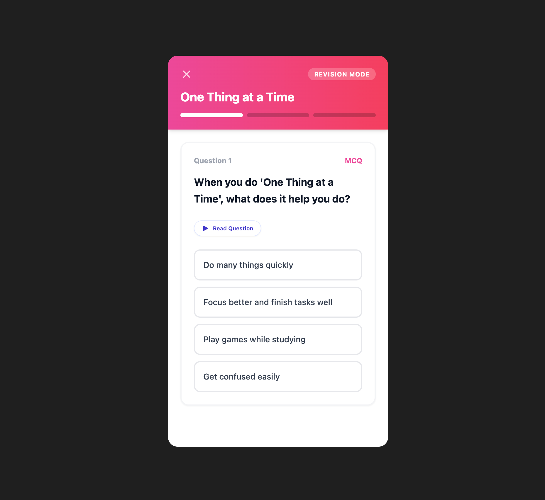 - Consistency across workflows (homework, chapter, quiz, micro-lesson, marathon)