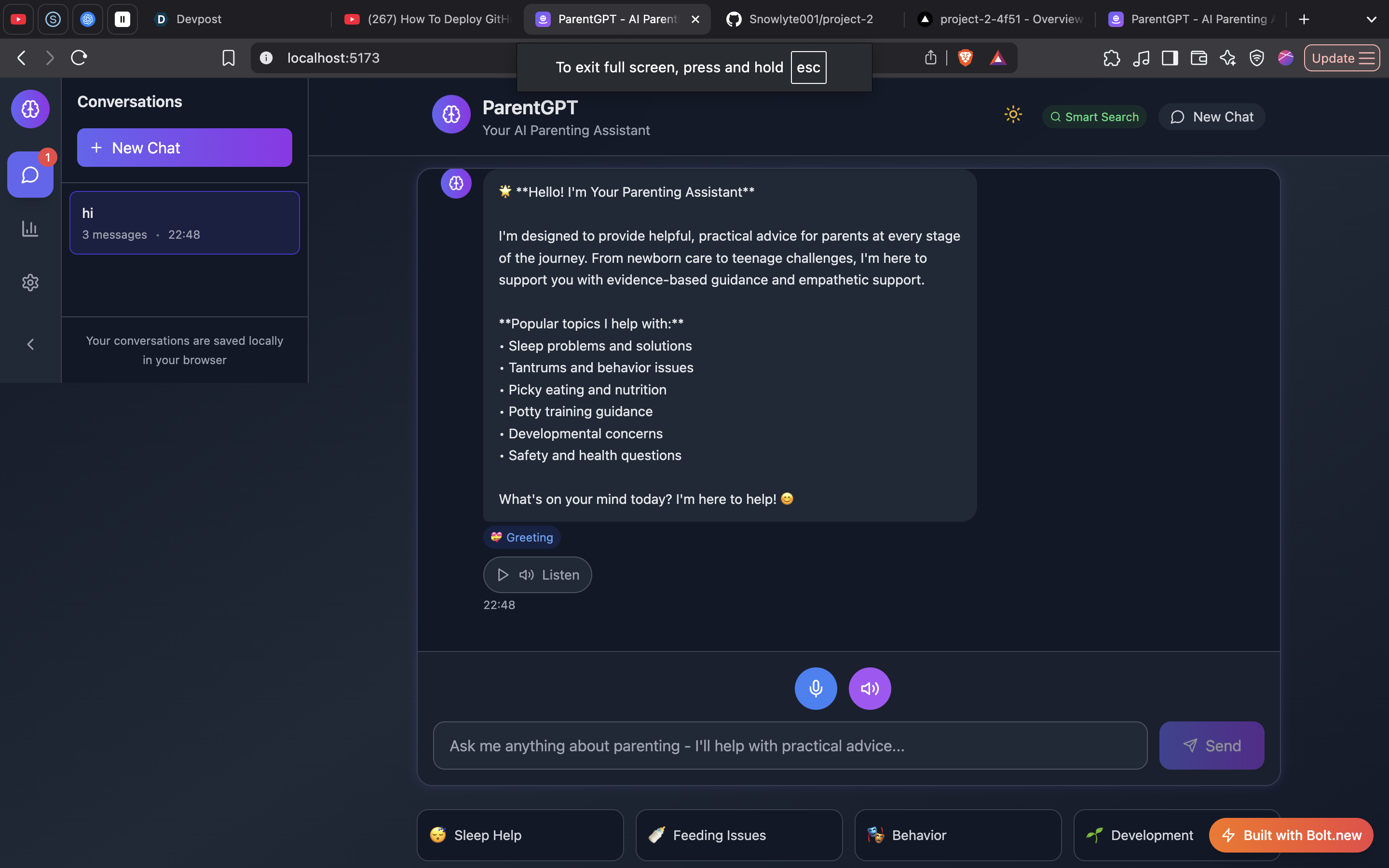 ParentGPT is an AI-powered web app designed to be a gentle, 24/7 companion for first-time parents navigating the challenges of early parenthood. Built primarily in Bolt.new, the app provides voice-enabled support, conversational AI guidance, and a soothing digital experience for overwhelmed moms and dads.