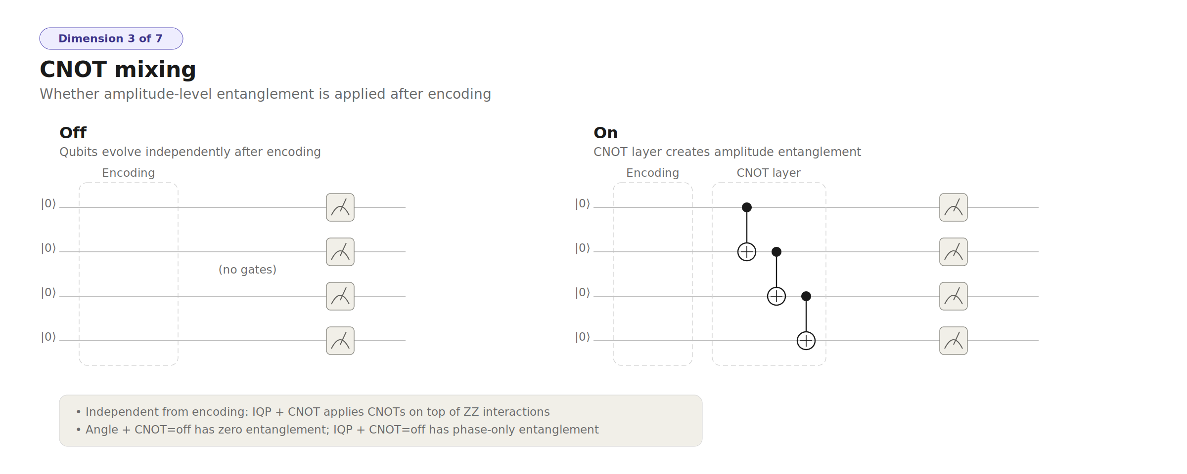 Financial markets are noisy, nonstationary, and heavy-tailed — precisely the conditions where classical feature engineering struggles. The challenge's core hypothesis is that quantum circuits might expose nonlinear structure that classical methods miss. Rather than picking one quantum circuit and hoping it works, we asked: which specific design choices in a quantum feature map actually matter, and can we find the Pareto-optimal combination?