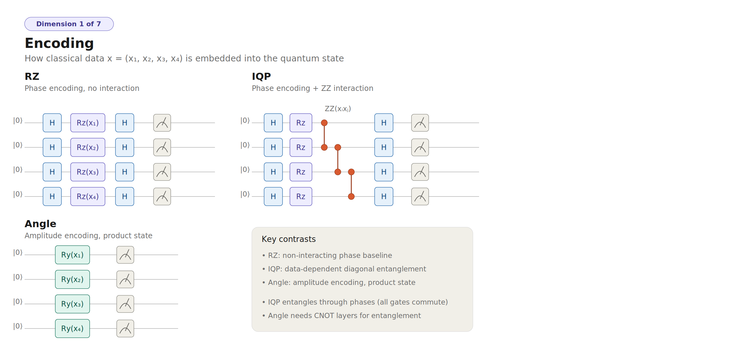 - IQP circuits performed no better than identity — we traced this to missing final Hadamards, periodic encoding saturation on Cauchy-distributed inputs, and diagonal circuit structure that prevents amplitude-level entanglement. Fixing all three still left IQP 2× worse than angle encoding.
