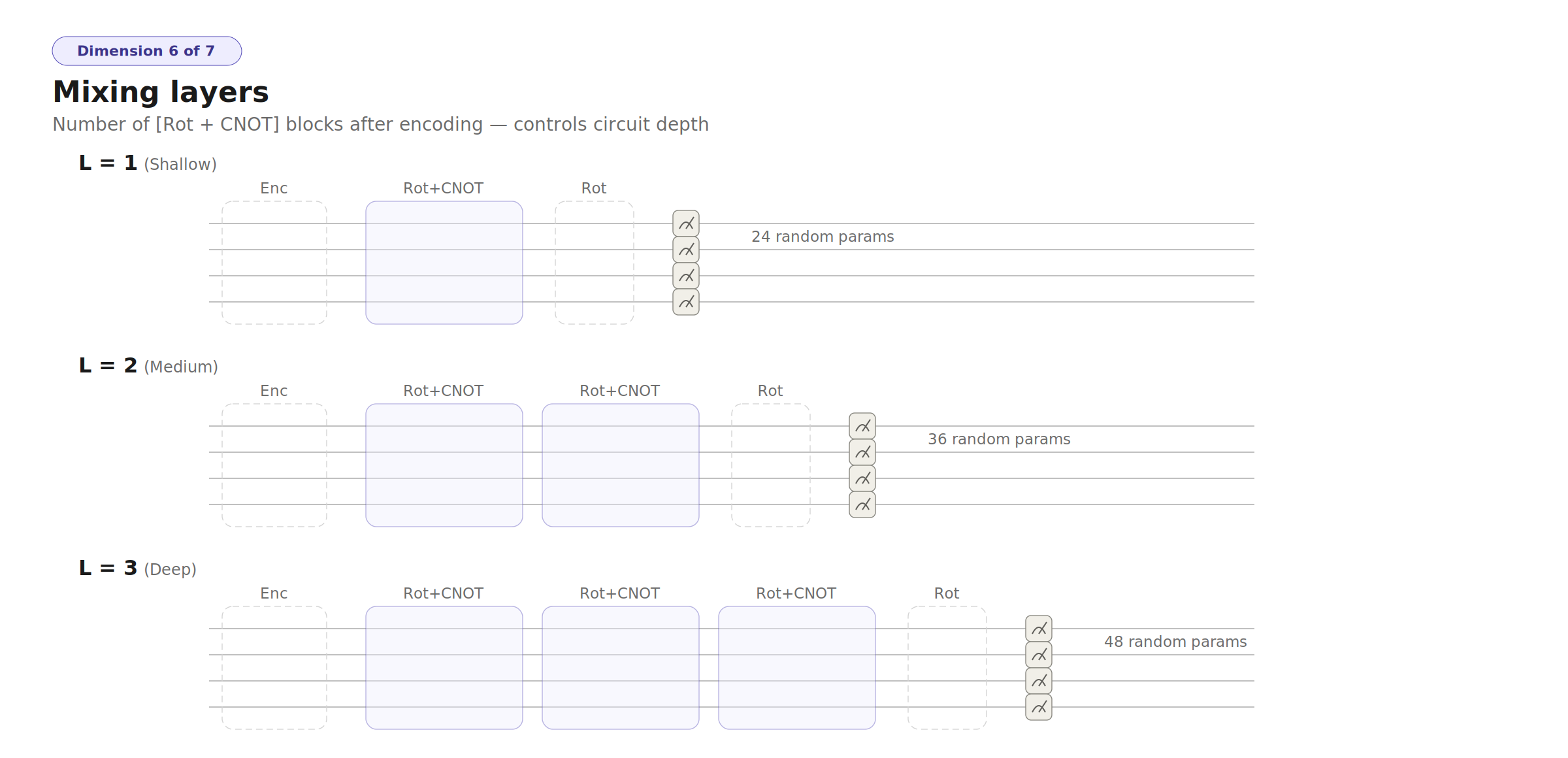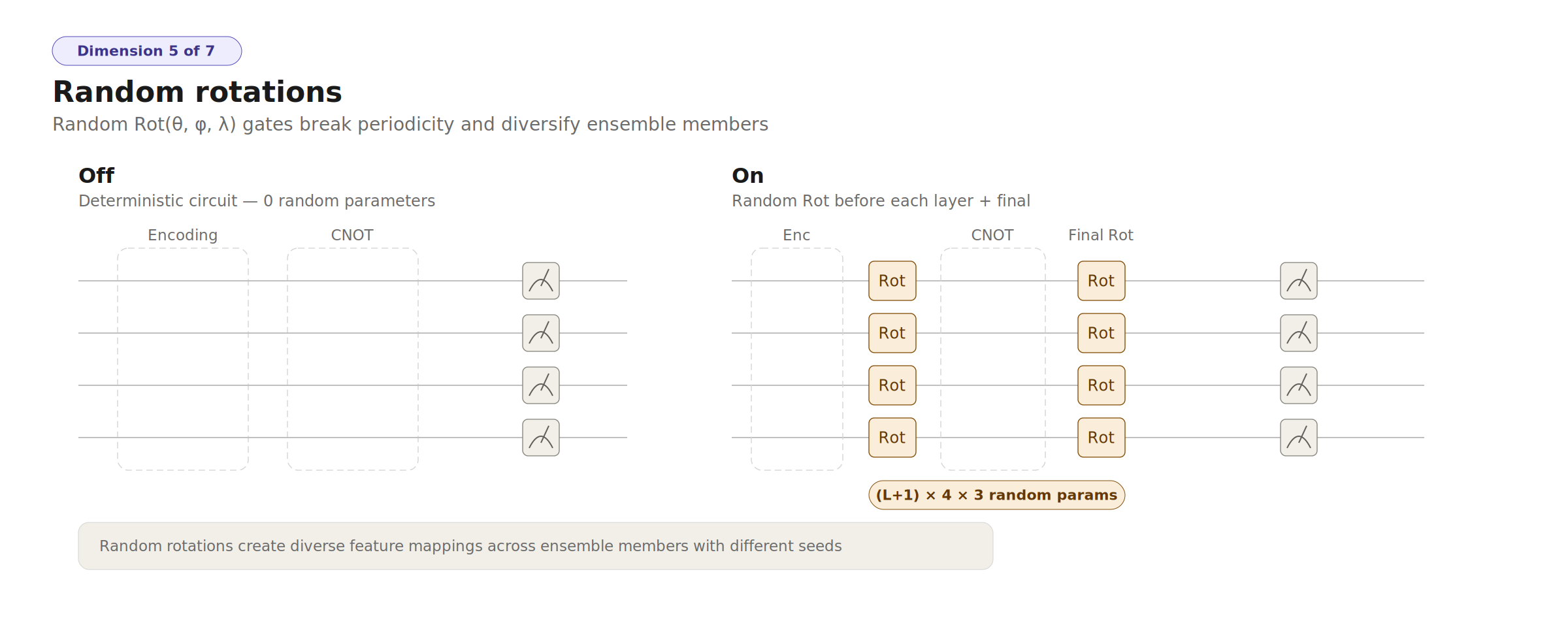 - Ensemble diversity beats circuit depth — 3 shallow circuits (1 layer each) outperform 1 deep circuit (3 layers) at the same total parameter count. The quantum advantage comes from diverse random projections, not from any single circuit's expressiveness.