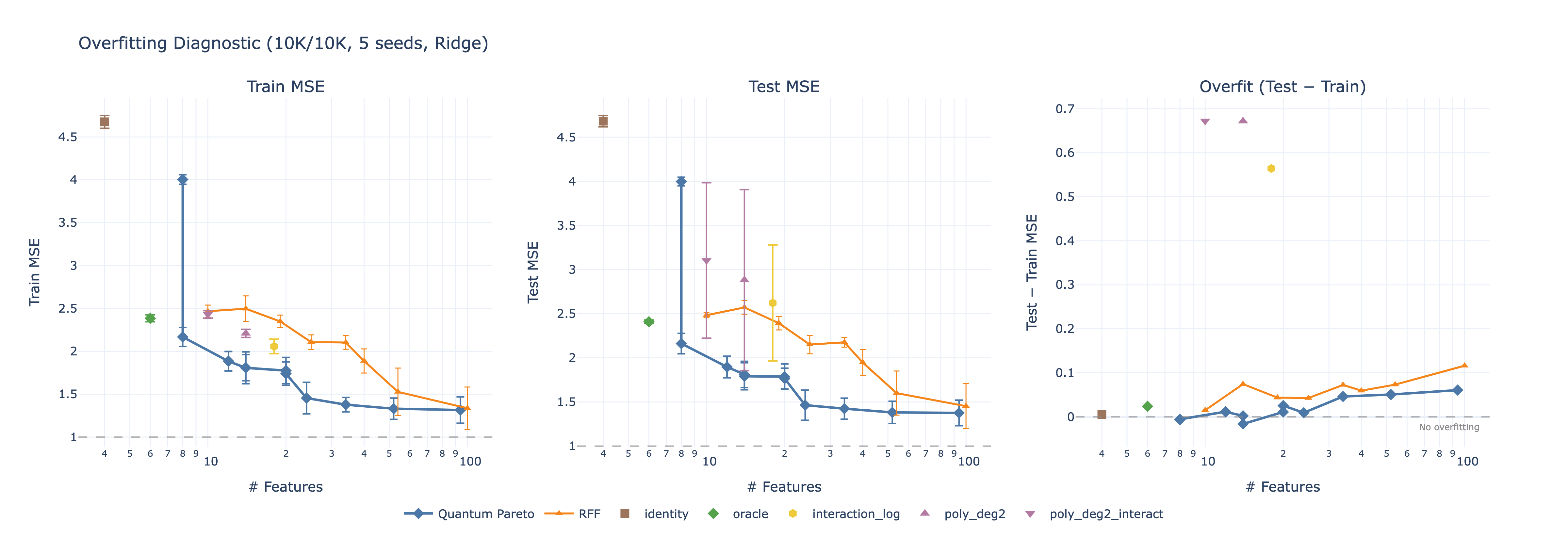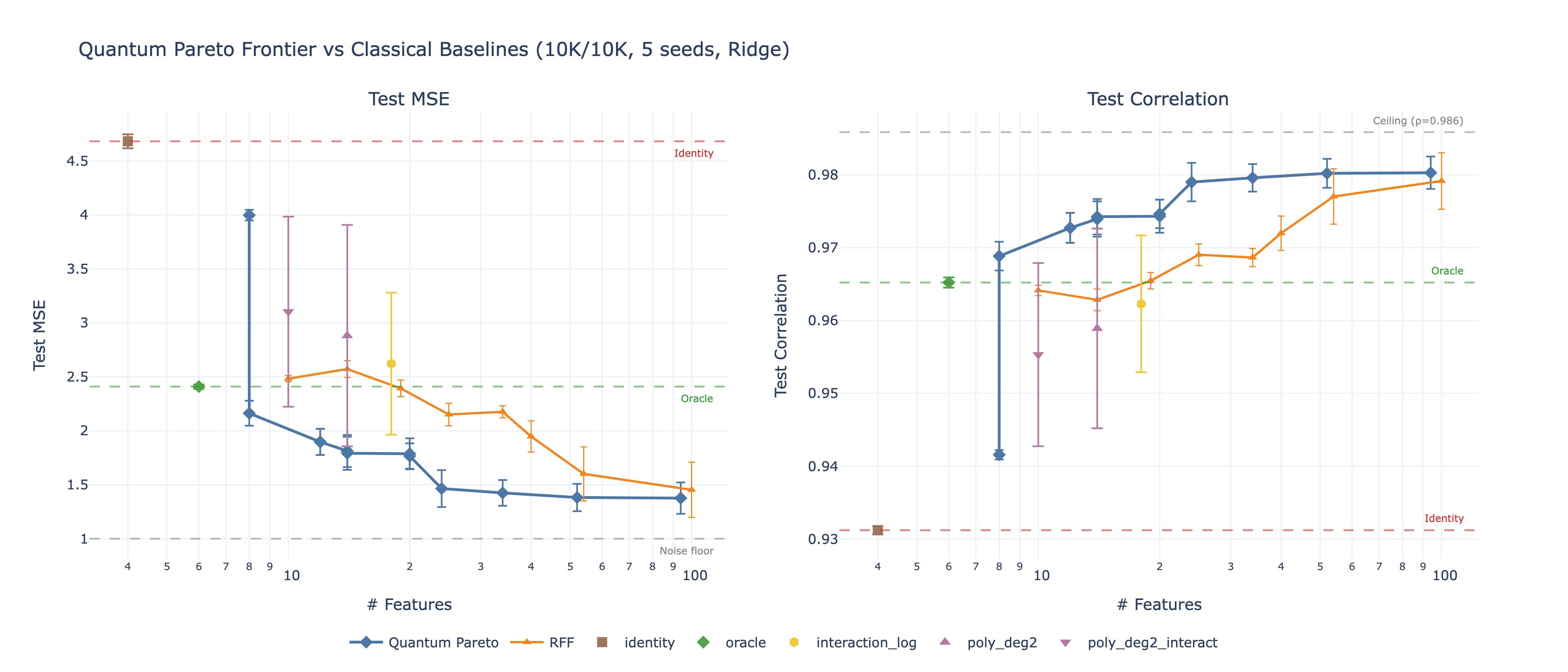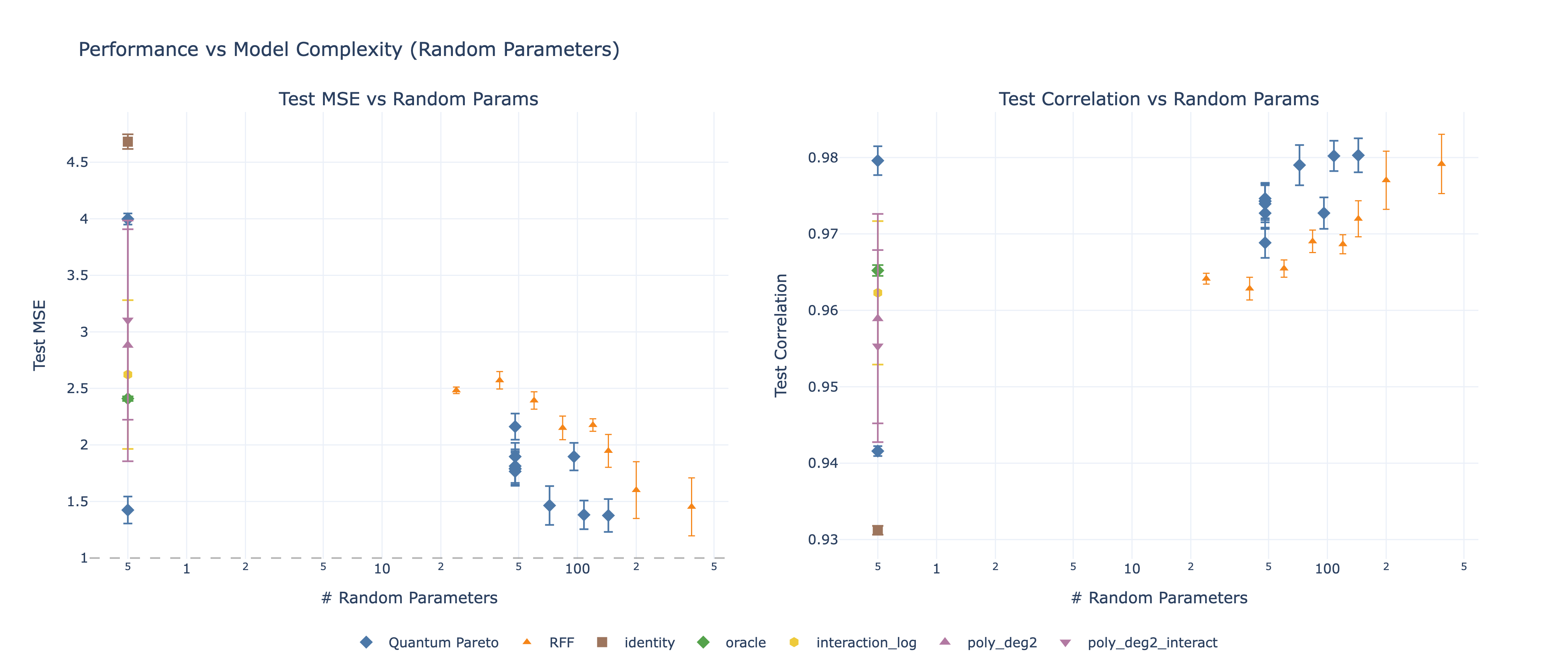 - Quantum reservoir achieves Pareto-optimal MSE at every feature count tested, with 5% improvement over the best classical method and notably lower variance across random seeds