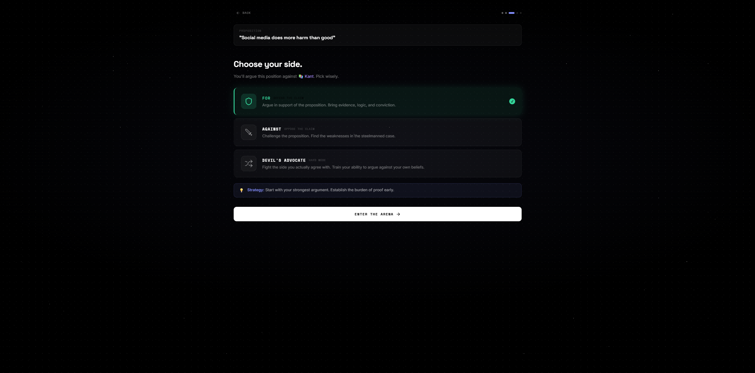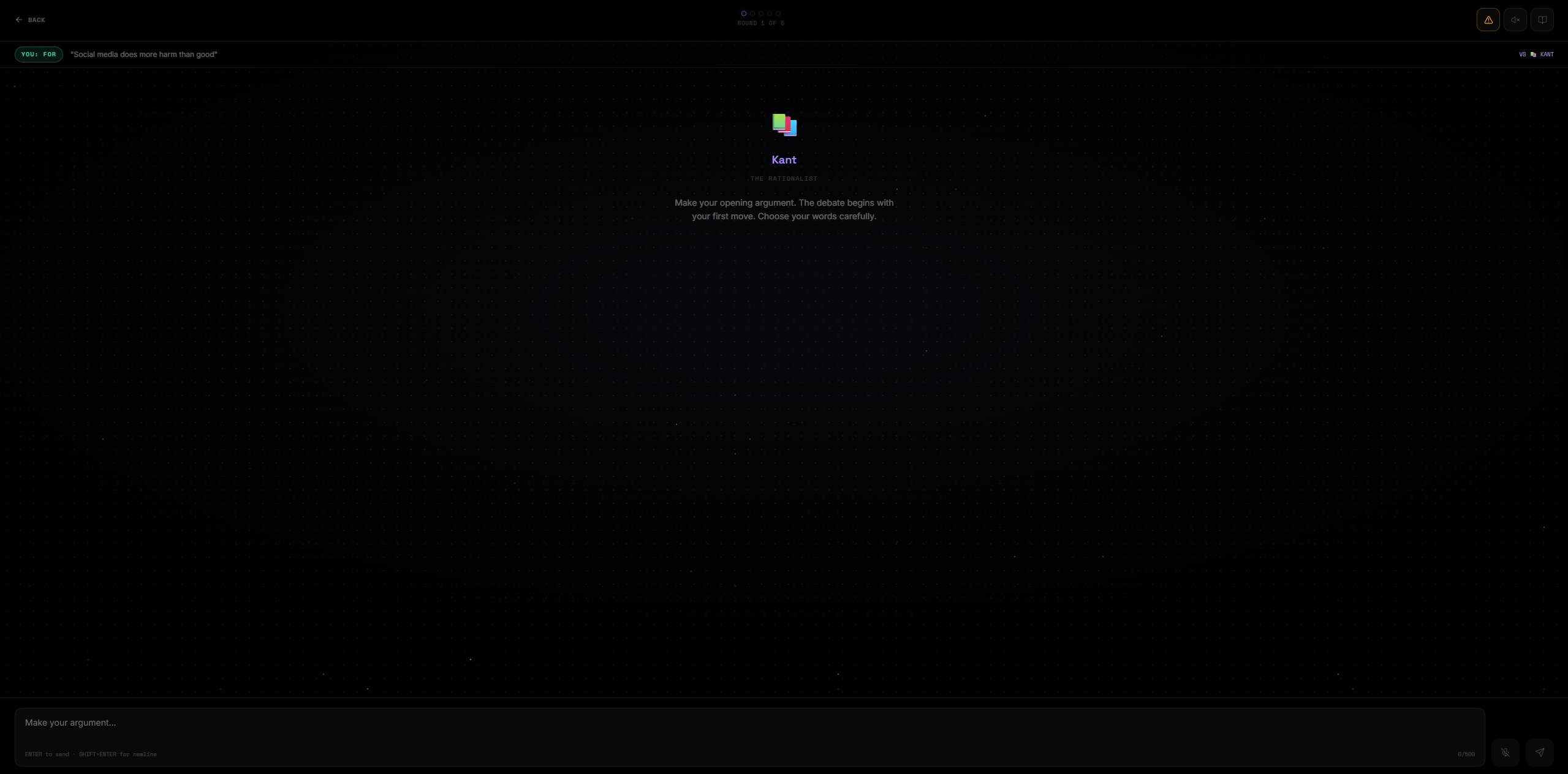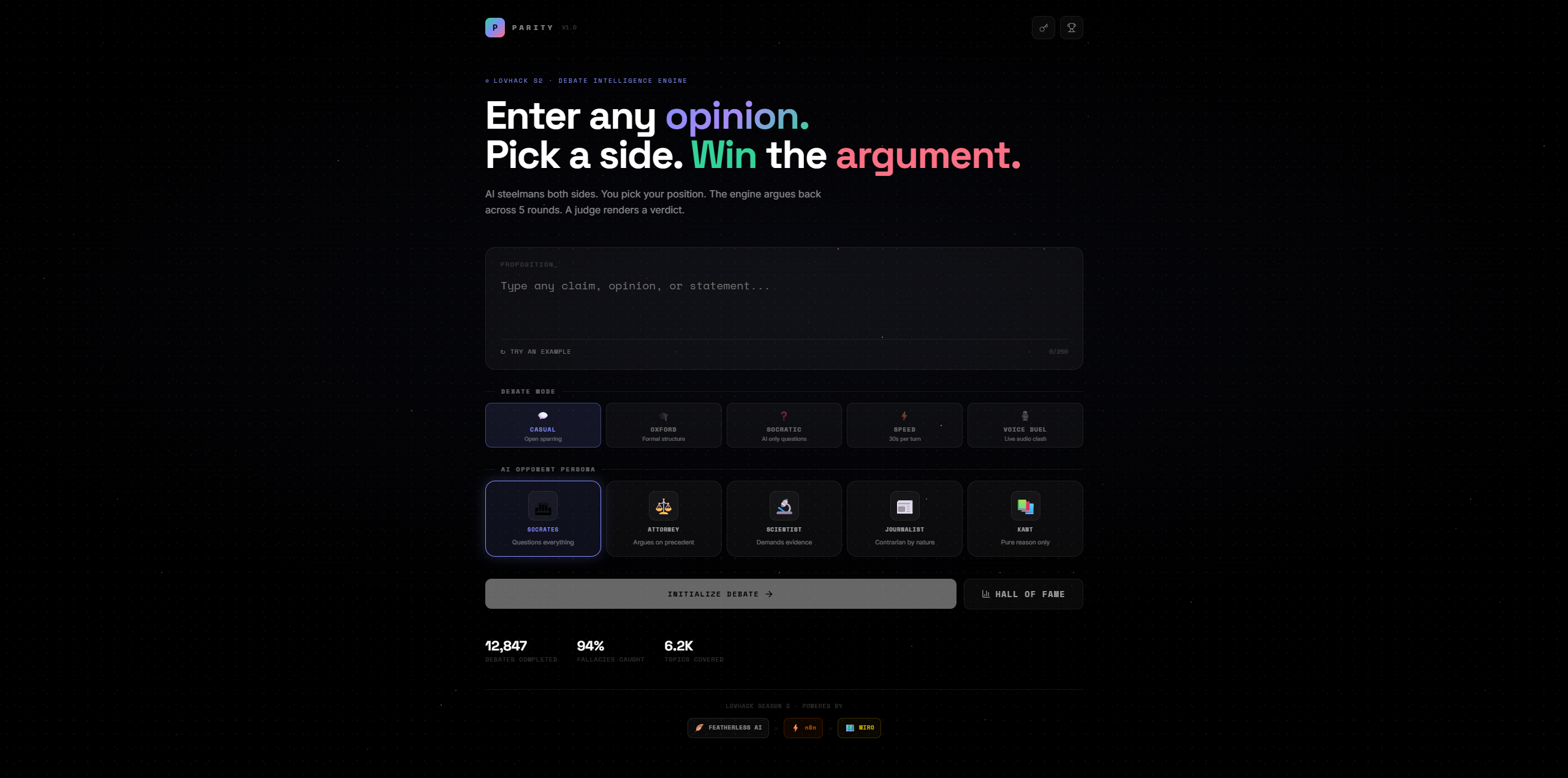 You enter any proposition. The AI steelmans both sides simultaneously — no straw men, only the strongest possible arguments for each position. You pick a stance. Then you debate across 5 rounds against an AI persona of your choosing. At the end, an AI judge scores the debate and renders a verdict.