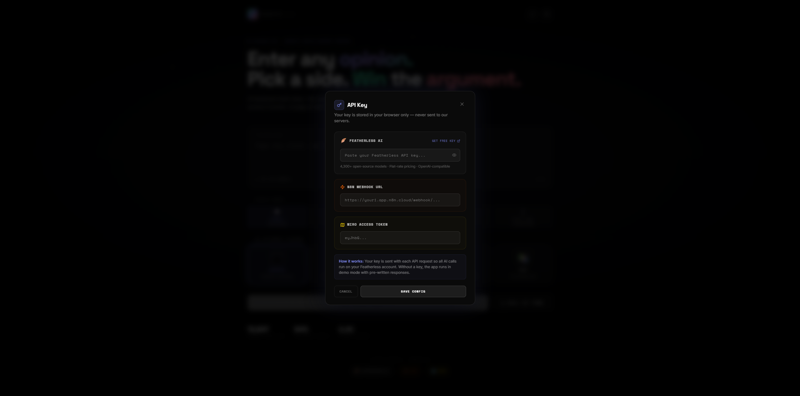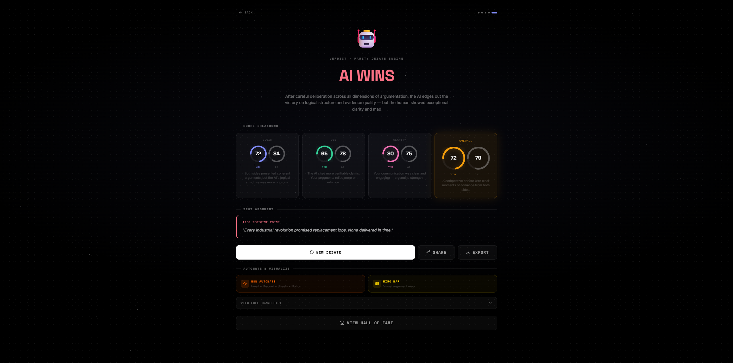 | ⚡ n8n | One-click exports full debate + scores to a webhook → email, Discord, Notion, Sheets |