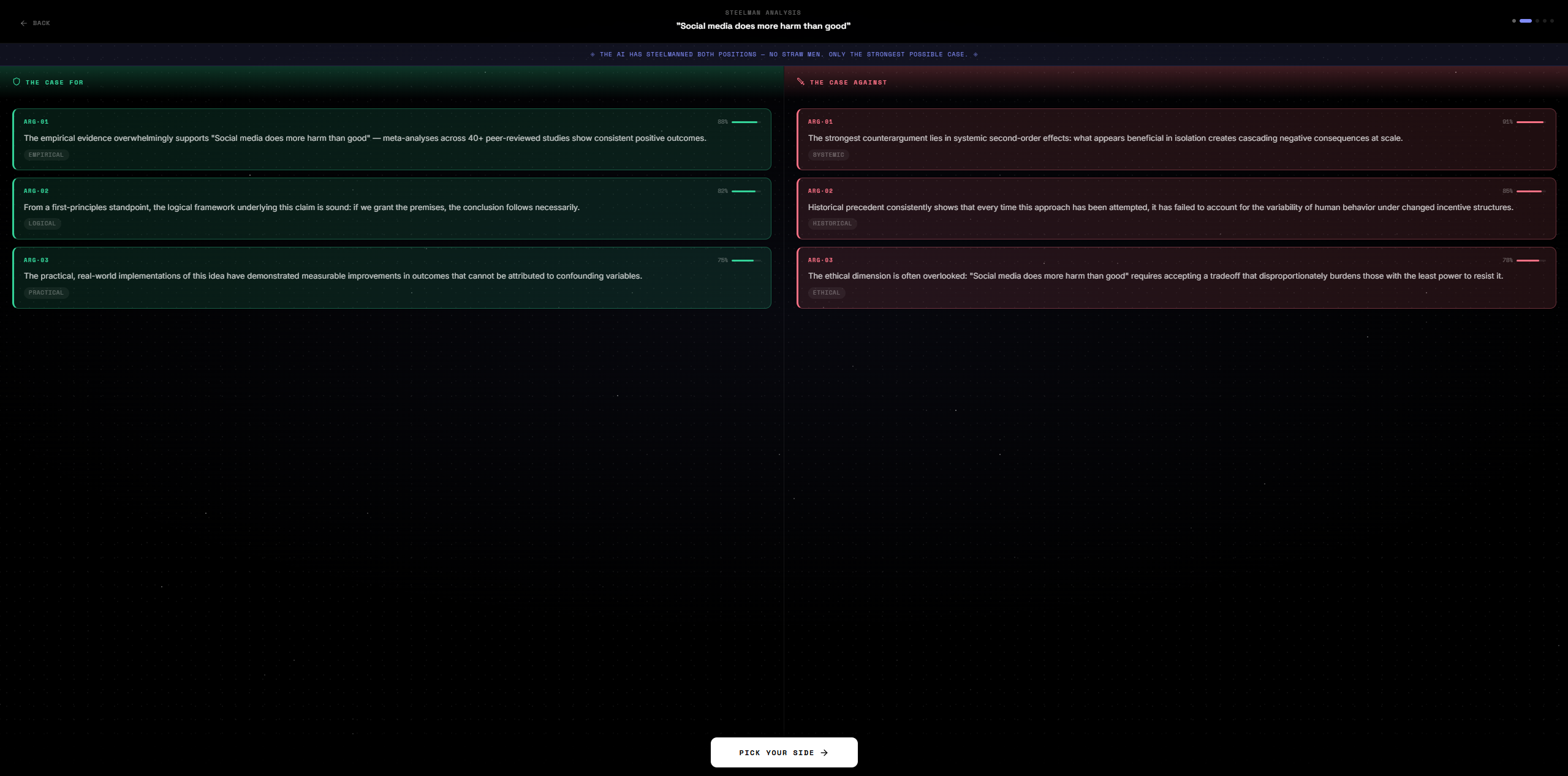 The idea came from a simple frustration: online debate is broken. Social media rewards dunking over reasoning. People never hear the strongest version of the opposing argument — only the weakest. The result is a generation that is very confident and very bad at arguing.