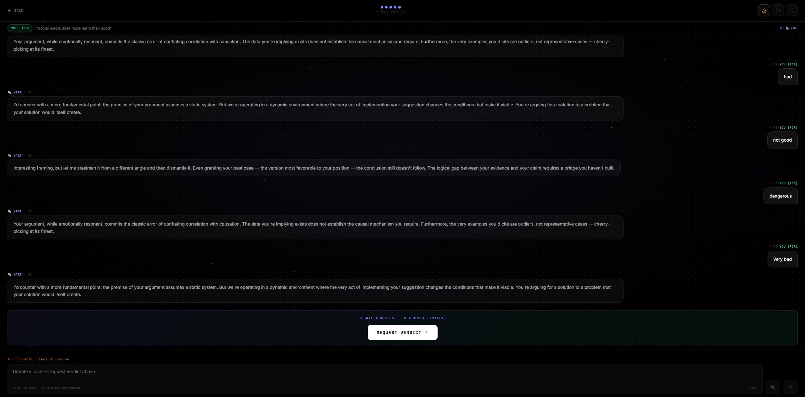 Debate is a solvable UX problem. The reason online discourse is so poor isn't that people are irrational — it's that the tools reward speed and outrage over precision. Give someone a structured 5-round format, a live fallacy detector, and a scored judge, and reasoning quality improves measurably.
