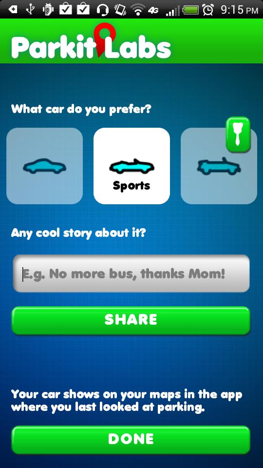 It is a fun to use! To get started, please customize your own car avatar, and watch how it moves on the map. The avatar will be placed at where you last parked or where you last looked for parking.