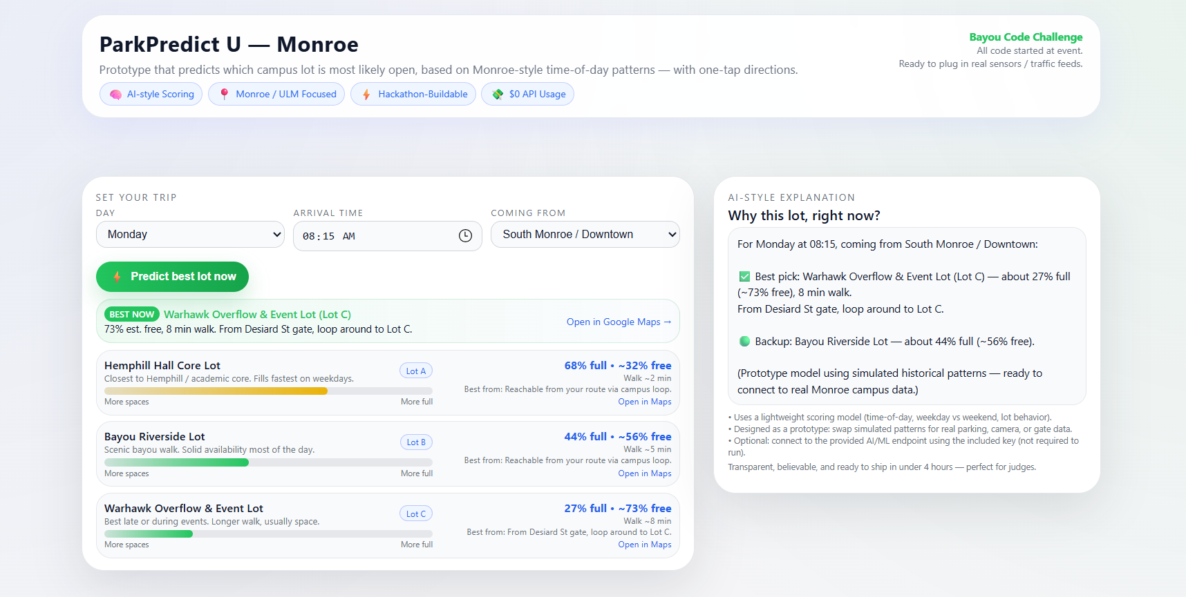 We all know the campus parking pain. You circle the same lots, waste 10–15 minutes, stress about being late, and still end up parking far. For a “smart” campus, it didn’t feel smart at all. So we thought: instead of guessing, what if we had a simple web app that tells you, right now, “go here, not there” for Monroe/ULM — no hardware, no paid APIs, just smart logic we can build in a few hours.