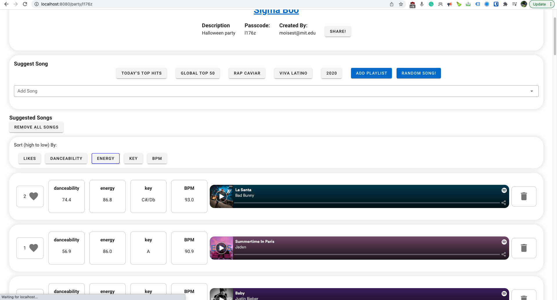 Users can create a music party, search songs from name or playlist, suggest songs, see ranked songs by likes, danceability, energy, key, and BPM and much more. Now everyone can join the party!