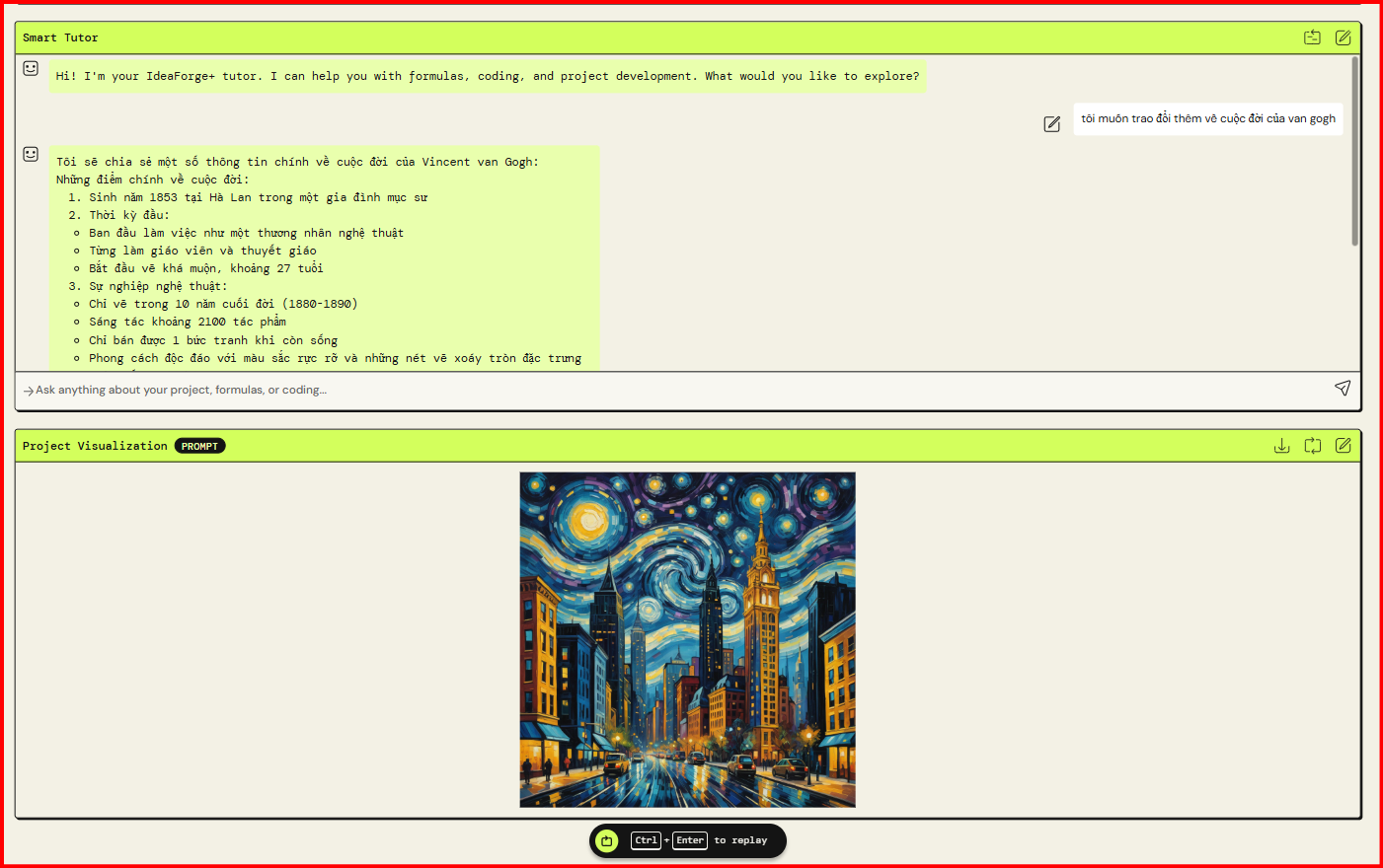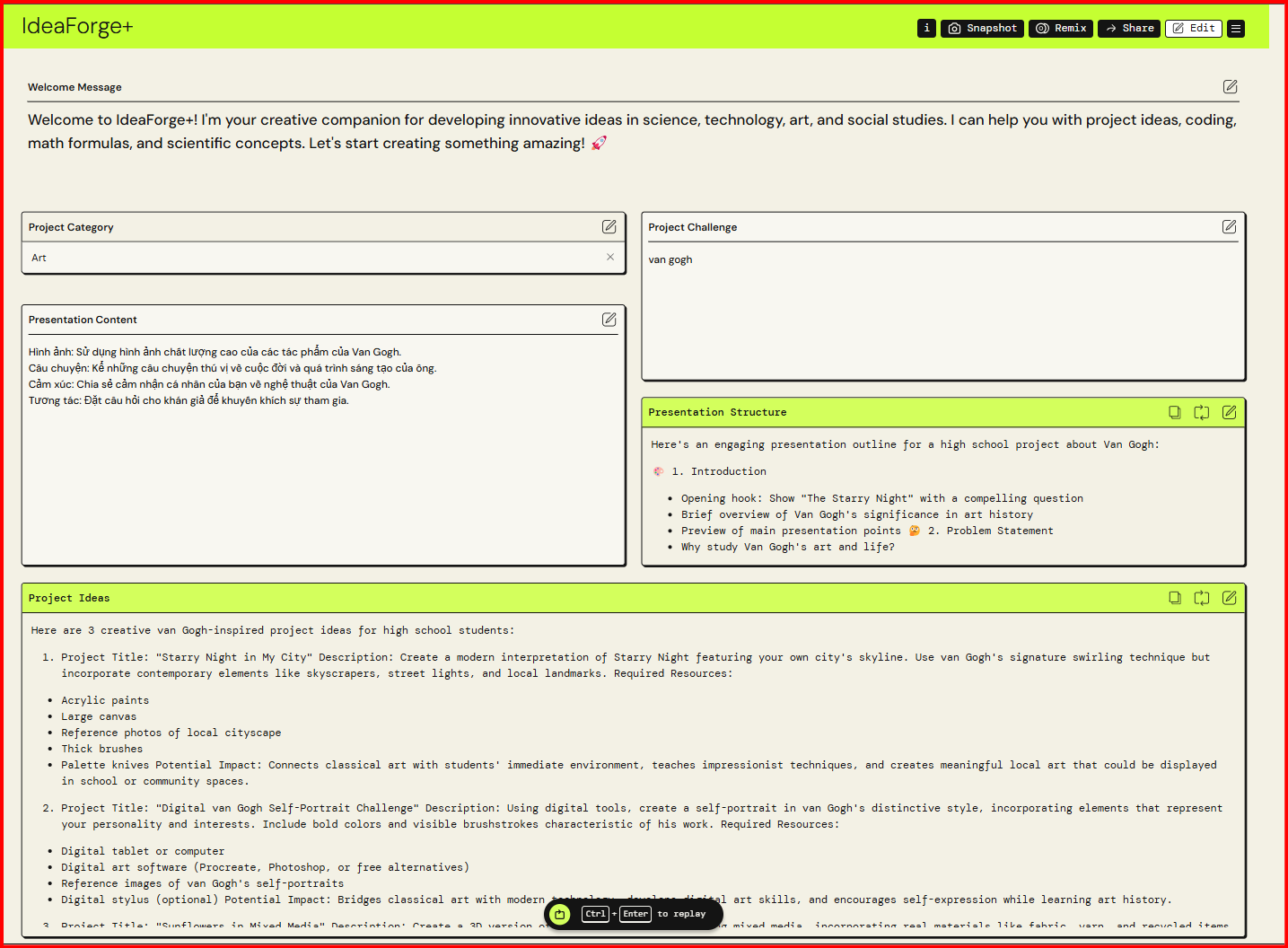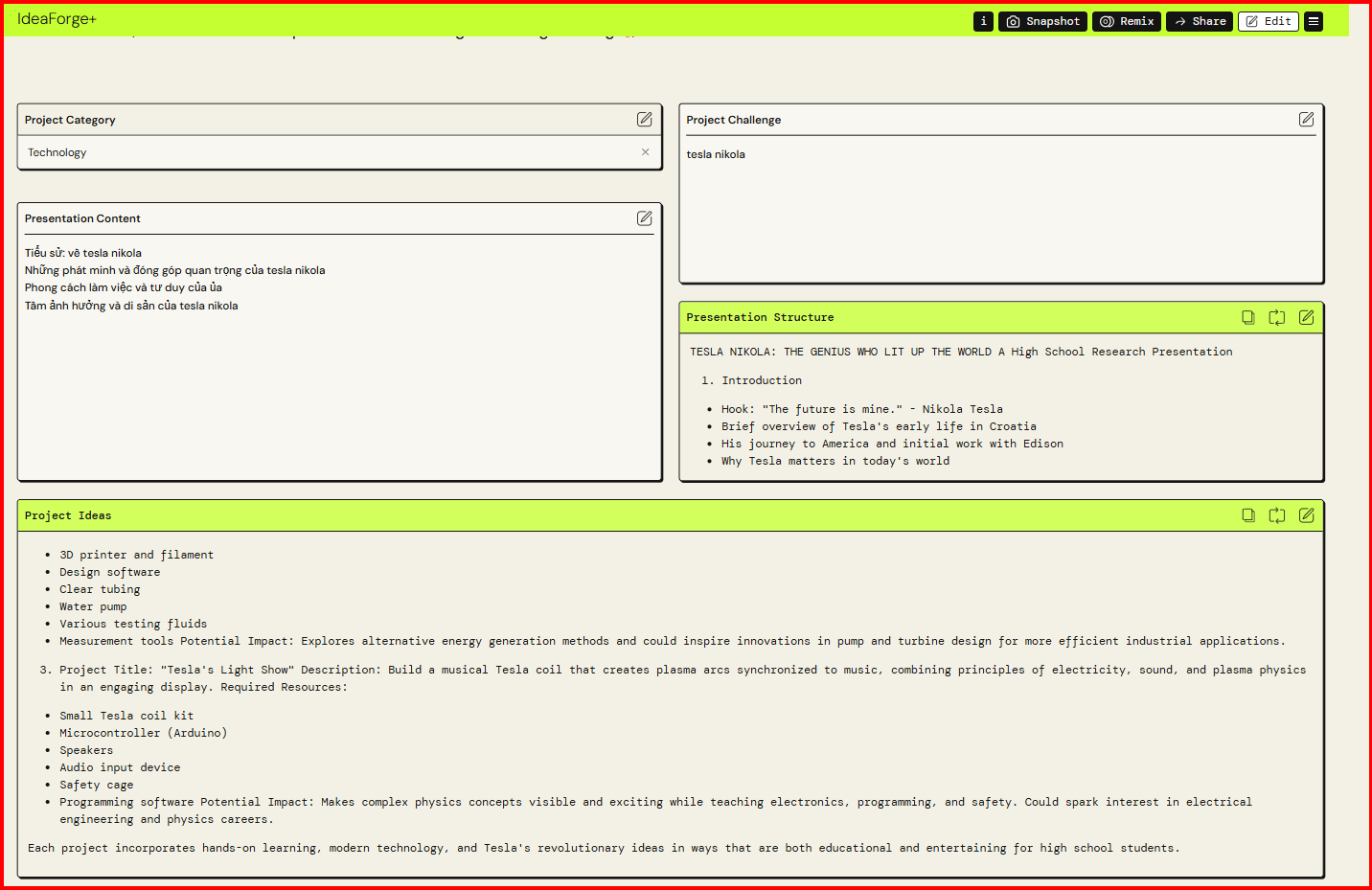 IdeaForge+ is a creative platform that helps students explore innovative project ideas, build engaging presentations, and get personalized support from AI-powered agents across science, technology, art, and social studies.