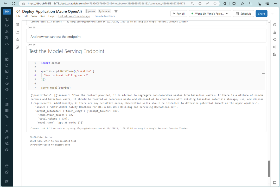 We also had our proof of concept to implement Azure OpenAI in Databricks MLflow model and serve it to the internet via Databricks serving endpoint. We had the opportunity to explore the end-to-end process from setting up the model up until deploying it in Databricks. From technical part, we learned that to achieve chain of thought, integration of chat history is required to maintain the continuity of the conversation with the bot. This enables the model to maintain a coherent and evolving dialogue, improving its ability to understand user intent and context.