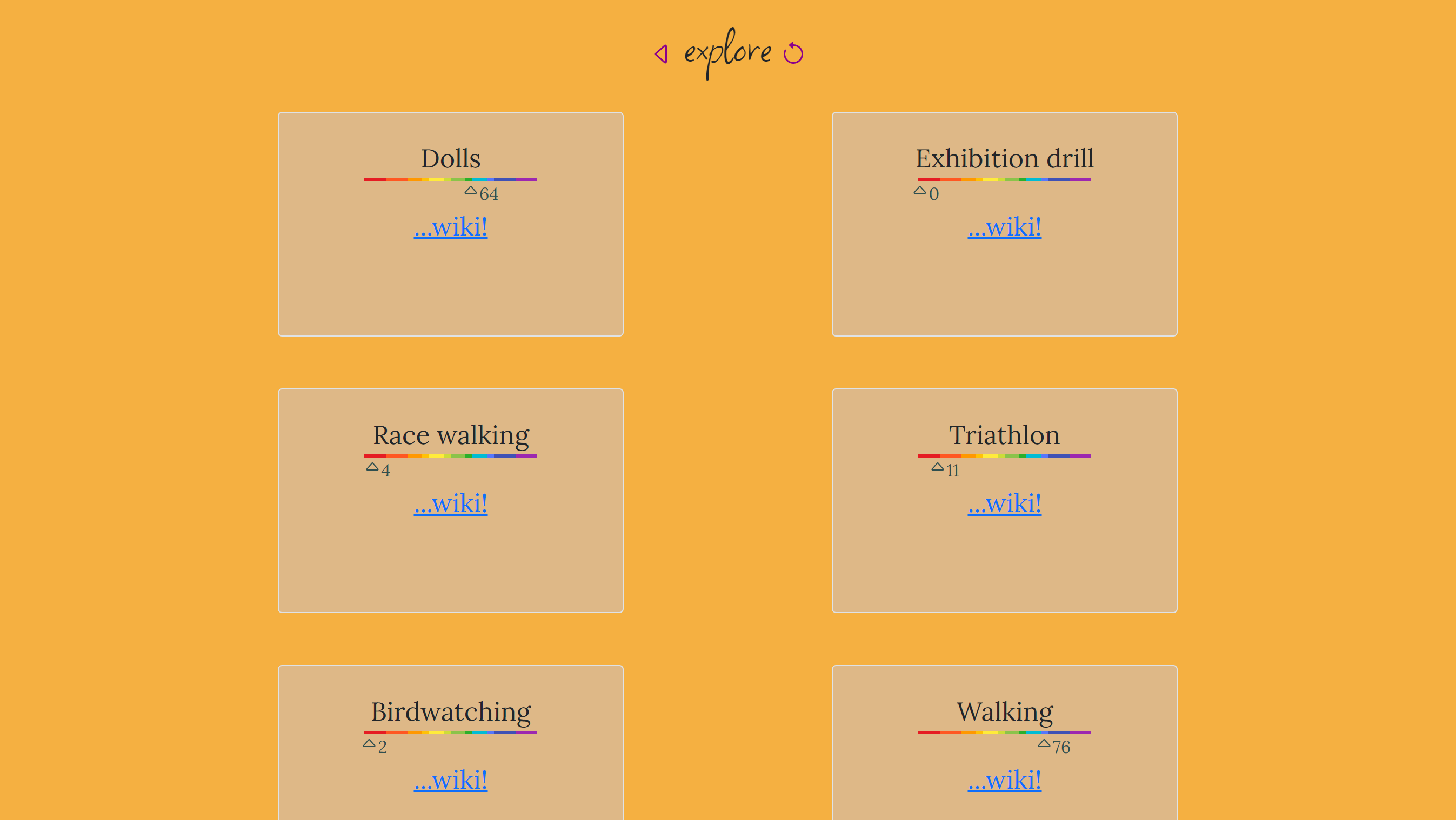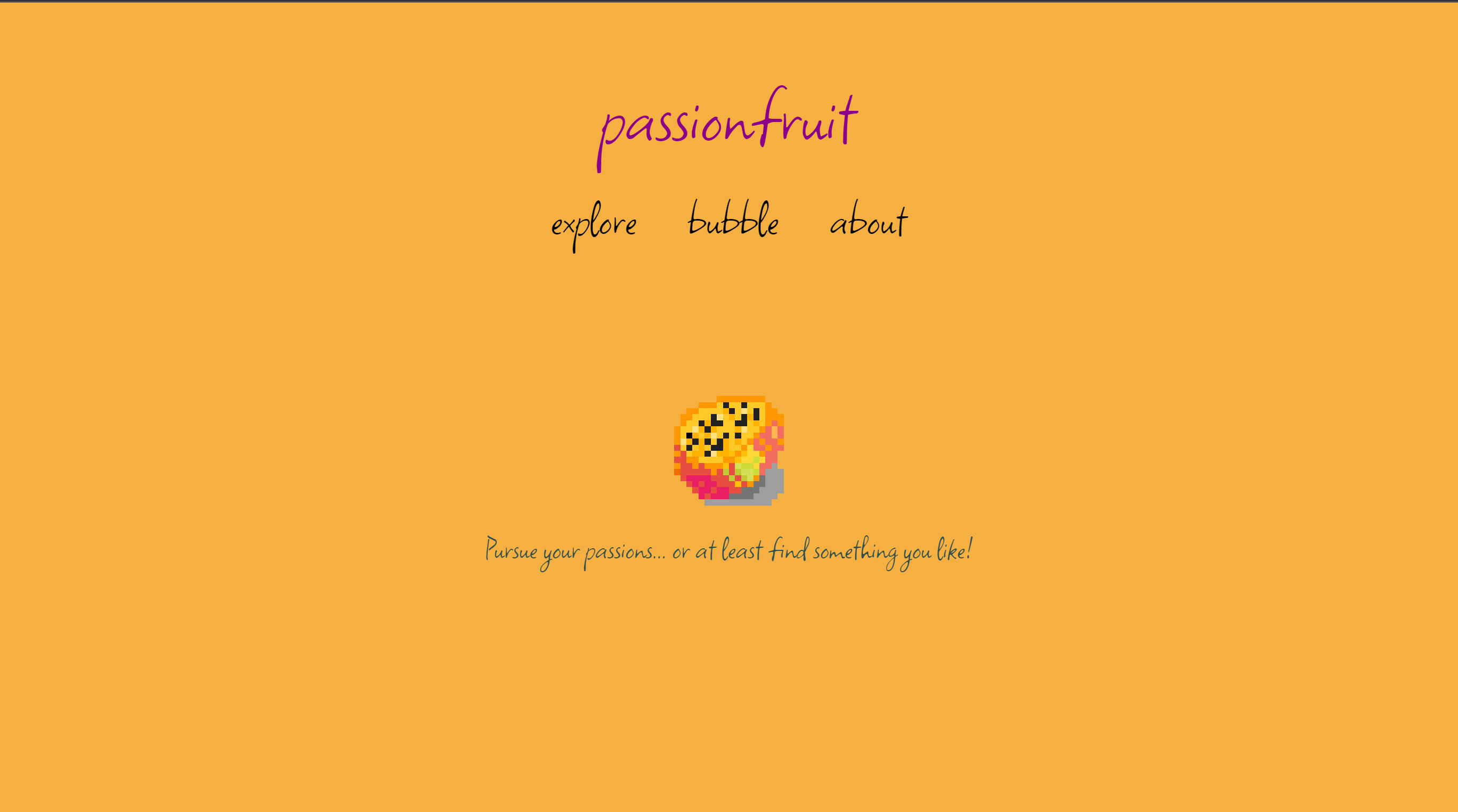 So, I think that a lot of people might not know what they want to do with their free time or as a career, so I decided to make a more visually appealing to find hobbies. In the current version of the website, the main thing is the explore page that displays random hobbies with an interest rank from 0-100 and a link to the Wikipedia page for it. The interest rank on the explore page is pretty ambiguous without a tooltip... Also, I called it "passionfruit" because, like, people have passions...