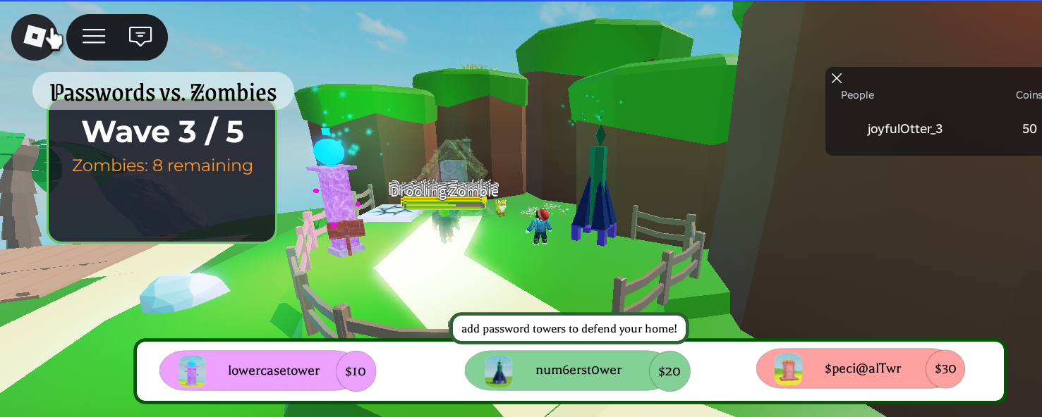 Many people overlook passwords and do not realize the digital threats they are exposing themselves to by having simple or reusing passwords. Thus we created Passwords Vs. Zombies, which is a tower defense game where the player needs to manage coins to buy password towers to protect their house from zombies. Additionally, the island is free to explore and rewards choosing a stronger password.