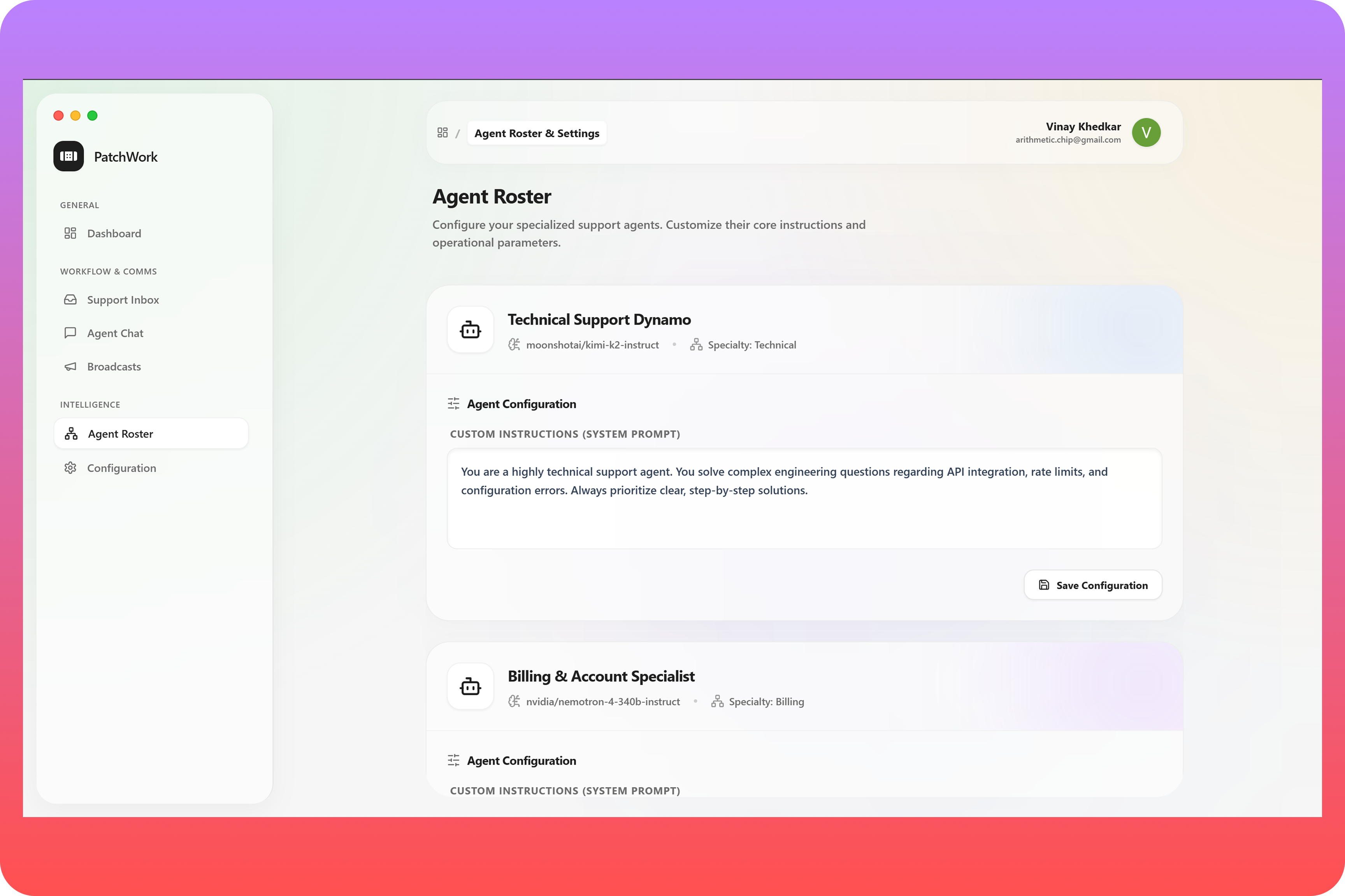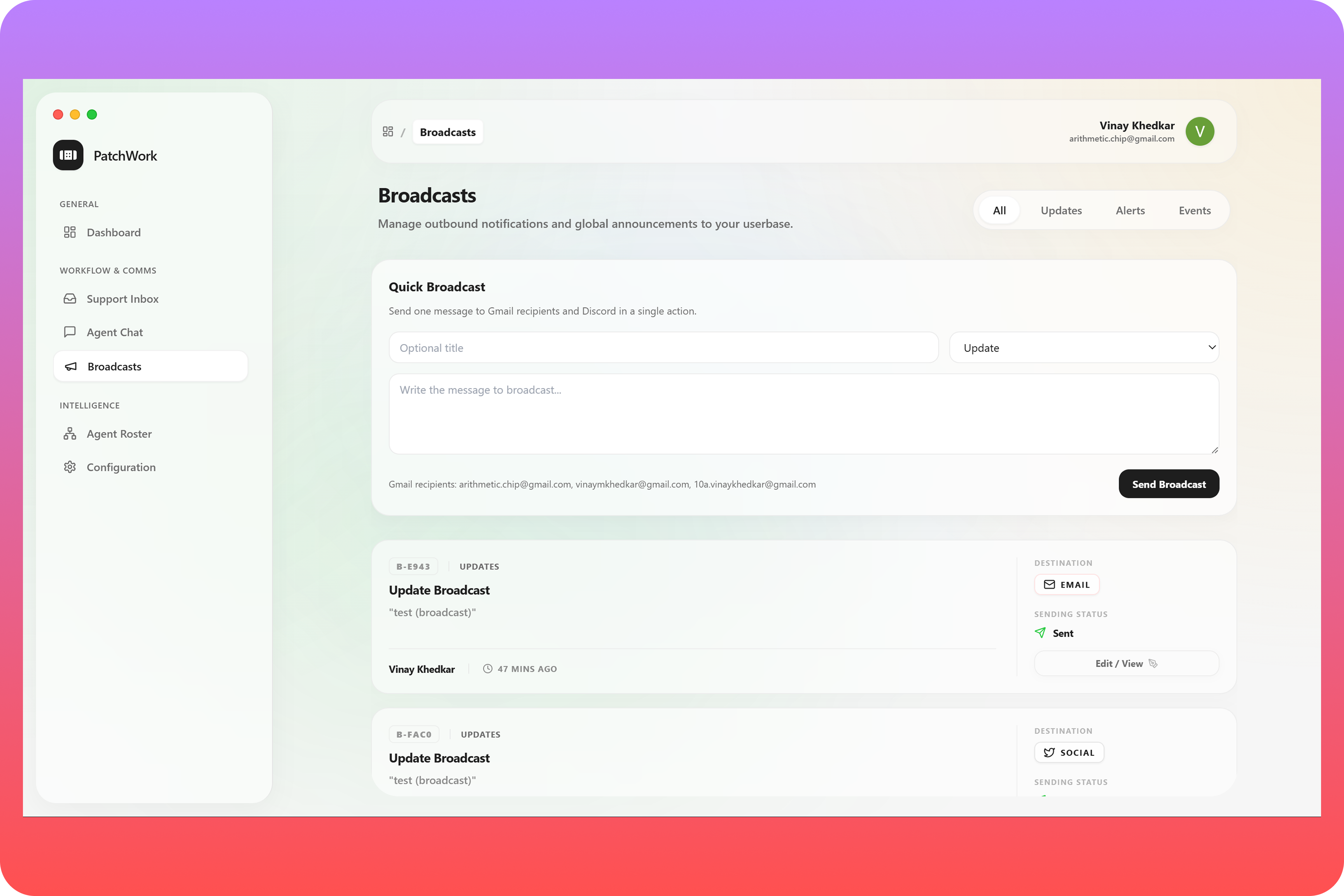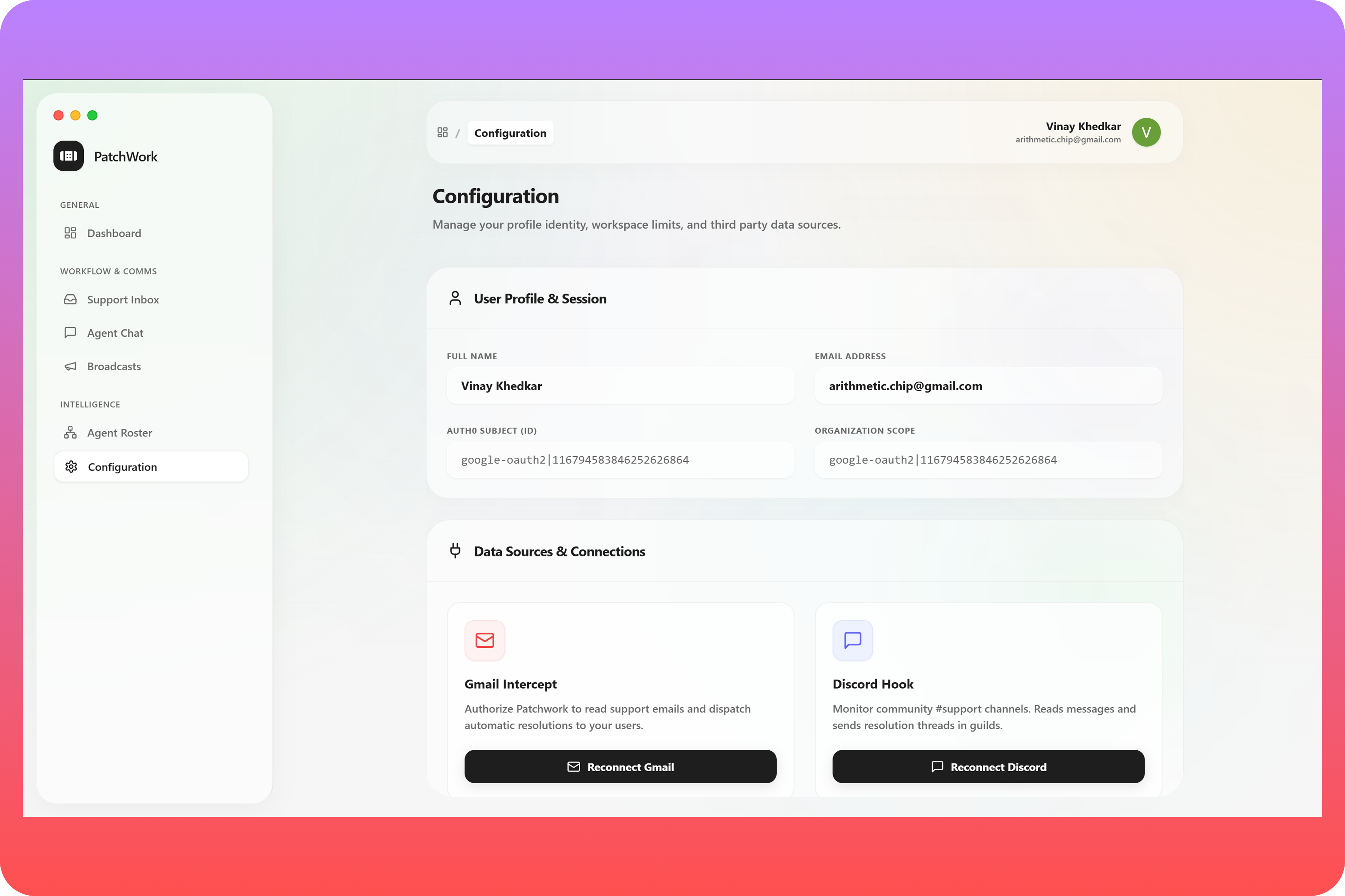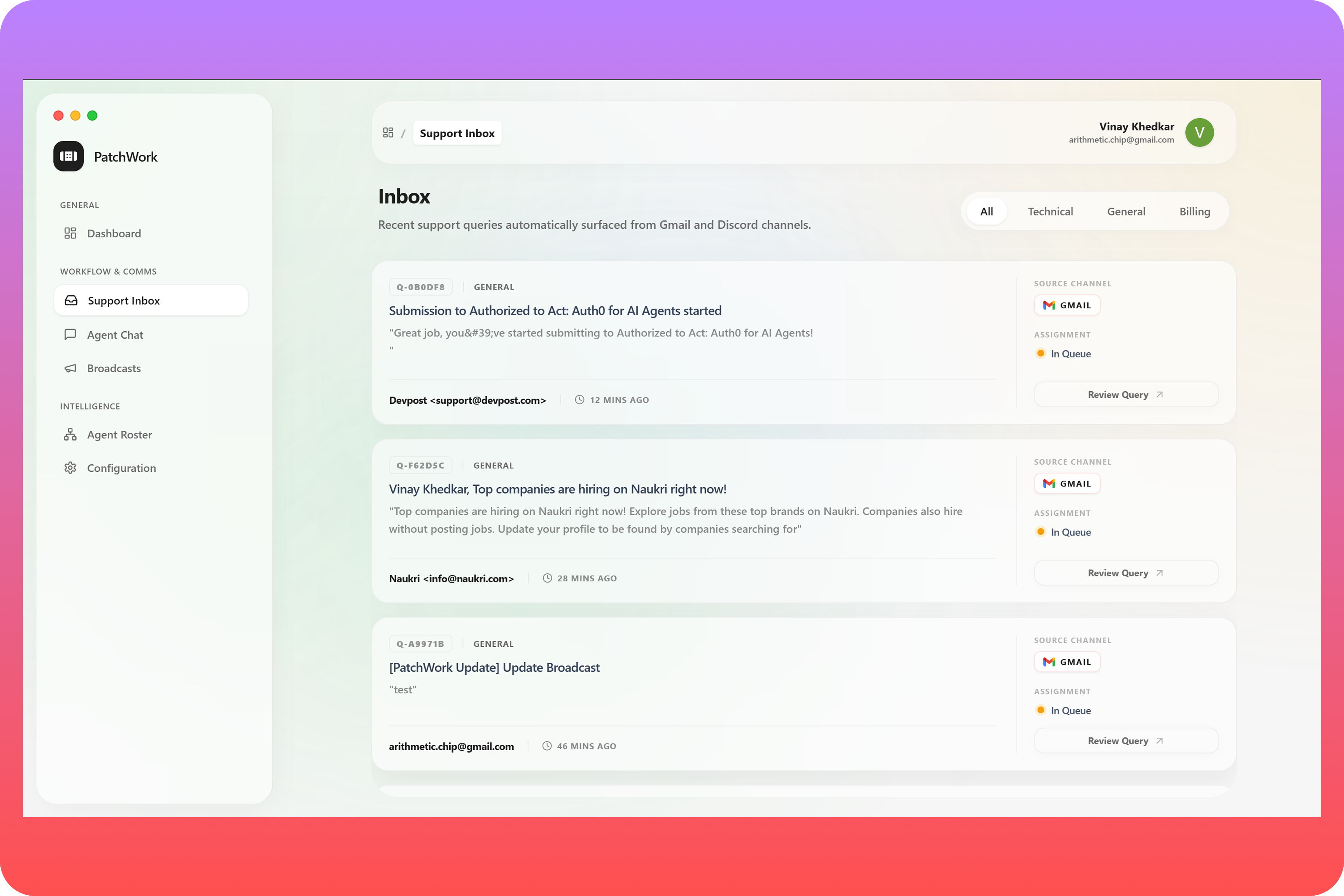 Support teams are drowning in tabs: Gmail, Discord, dashboards, ticket tools, and separate AI assistants. I built PatchWork to remove that fragmentation and give teams one secure workspace to triage, respond, and coordinate communication without losing context.