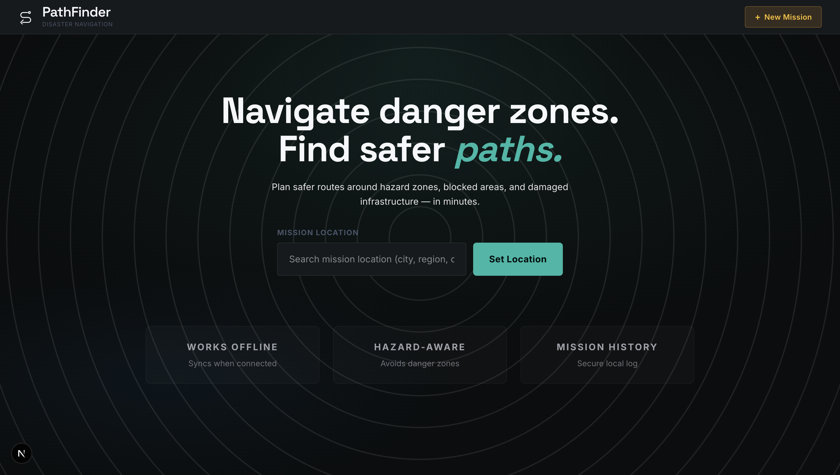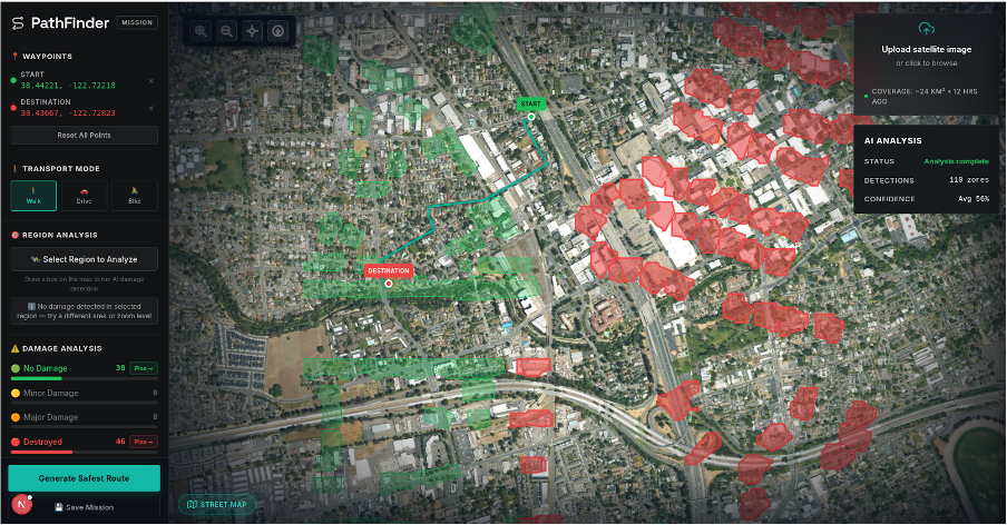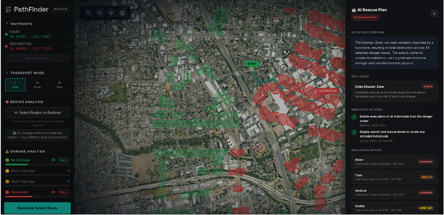 PathFinder is a disaster navigation system that uses satellite imagery and object detection to detect hazardous areas and generate and optimize safer routes. Users can upload satellite images, visualize detected danger zones, and plan routes that actively avoid high-risk regions. The goal is to provide clear, visual decision support for NGOs and field responders.