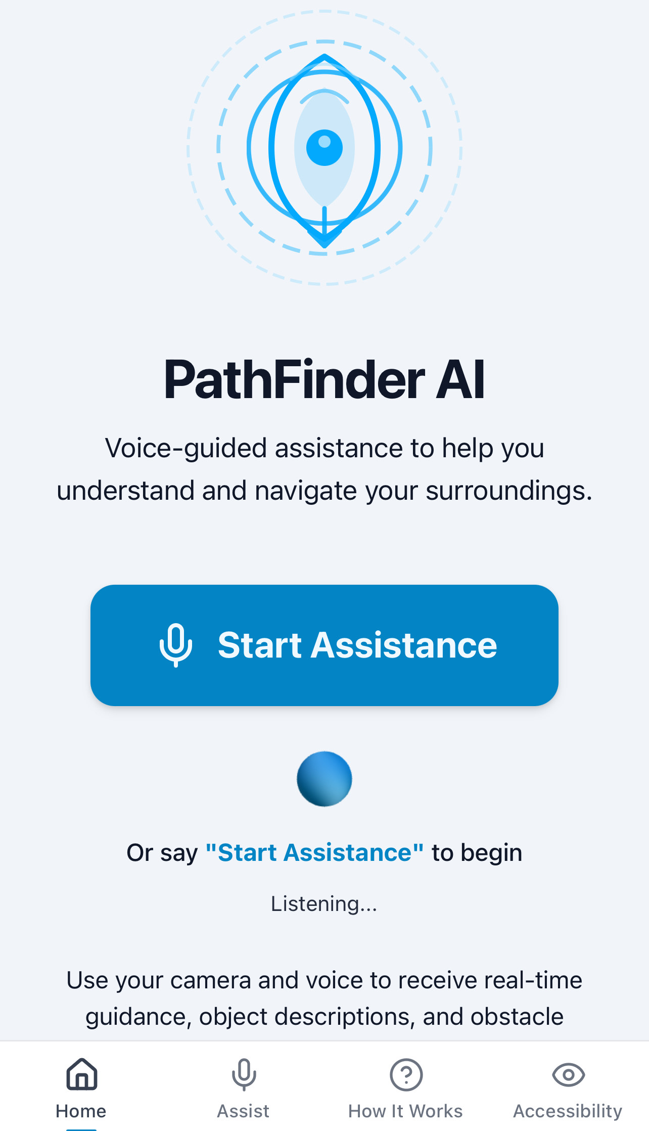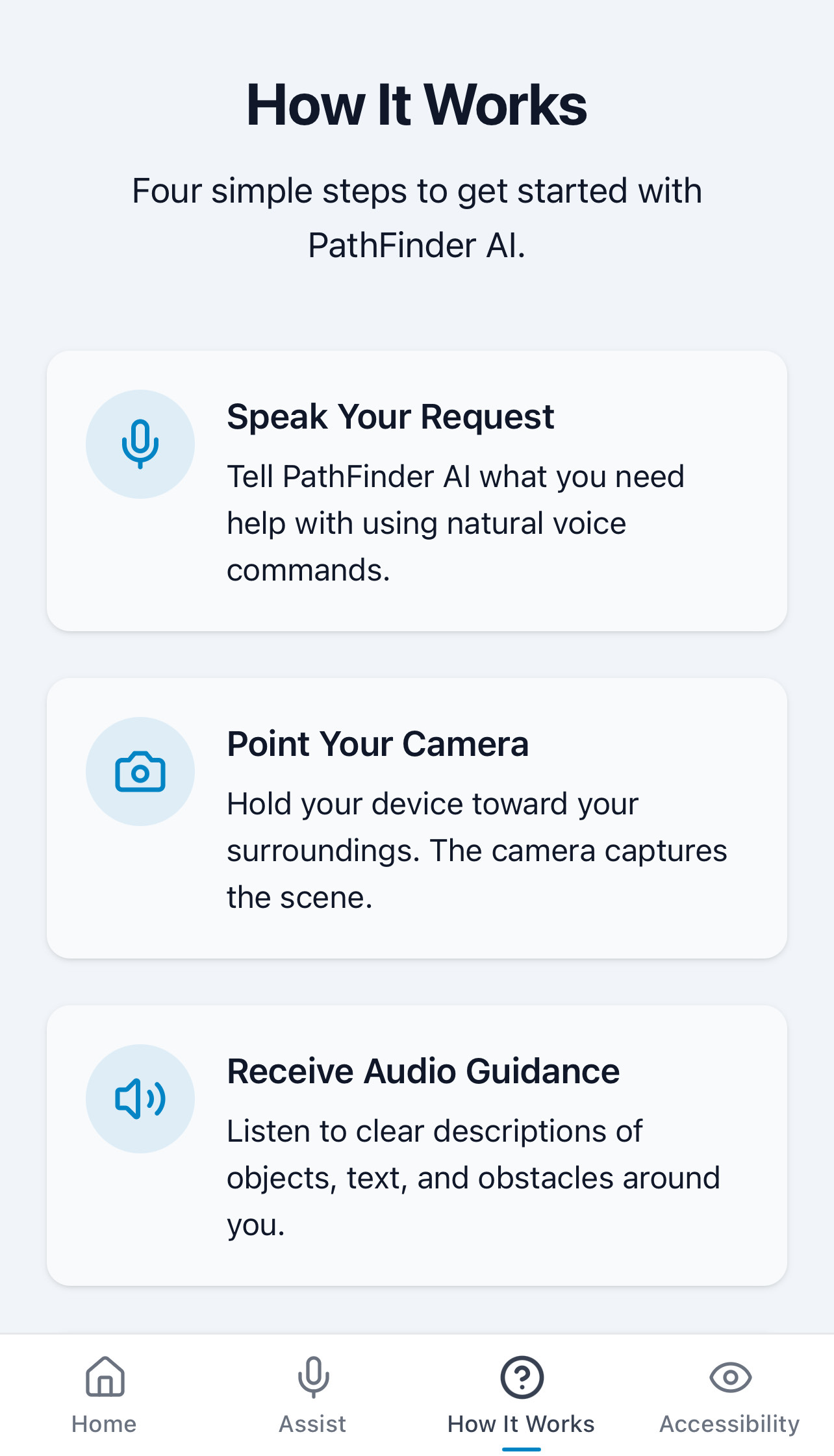 Pathfinder AI captures live camera frames, identifies obstacles and landmarks using Google Cloud Vision, and translates them into spoken cues and haptic signals. Users can issue voice commands like “What is ahead?” or “Describe door to my right,” and receive concise descriptions (“A bench two feet away, turn right”). This hands-free assistant ensures safe, confident navigation indoors and out.