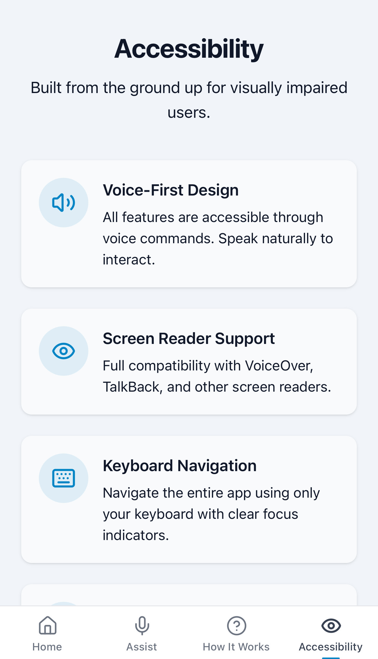 Our four-person team recognized that visually impaired users need seamless, real-time guidance while moving through spaces. Traditional navigation tools rely on visuals and do not translate well to audio-only interaction. We set out to build an AI companion that “sees” and narrates your surroundings entirely voice-first and usable on mobile.
