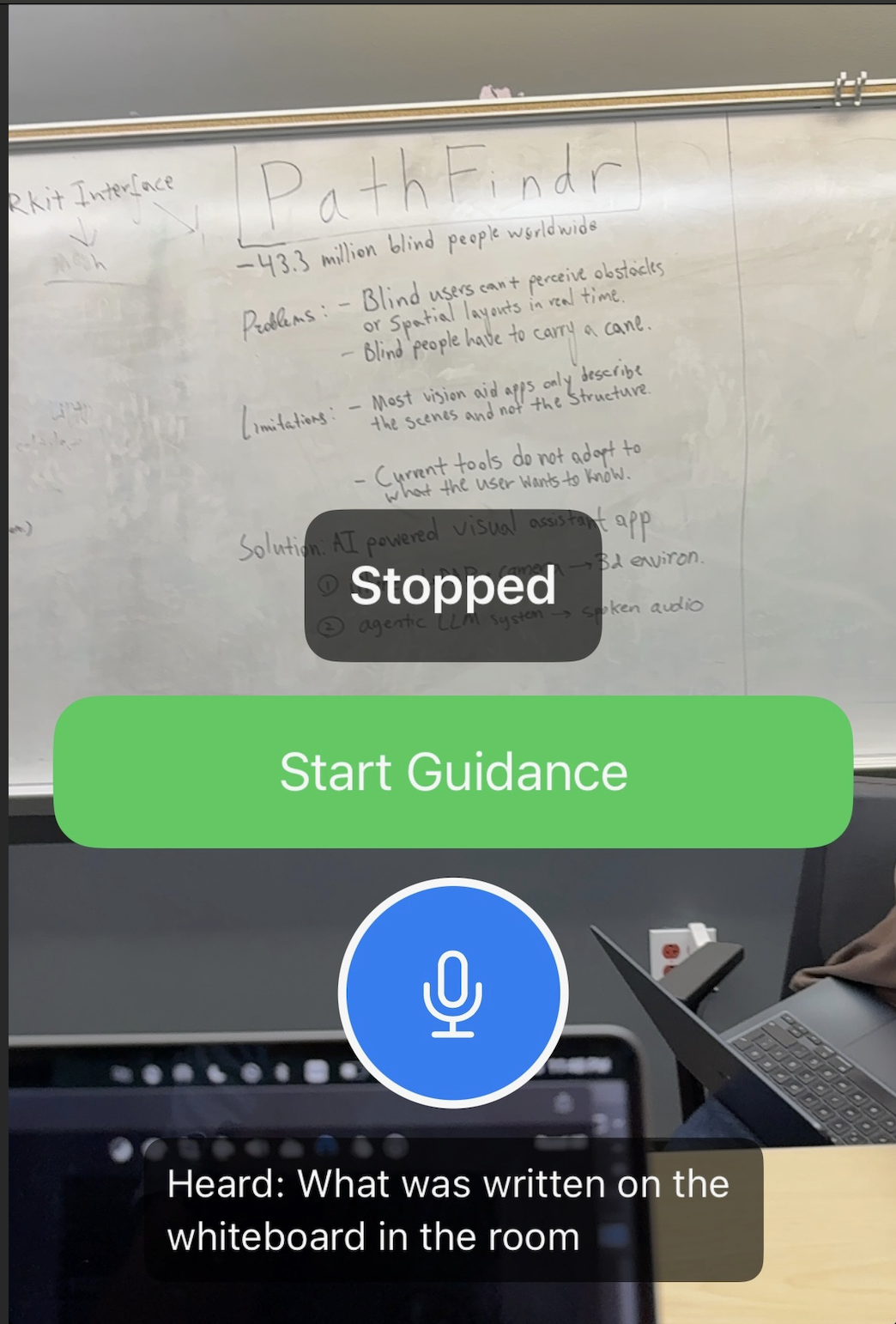 Once the user clicks Start Guidance and receives periodic visual cues like people seating in front of you, there is a glass door etc