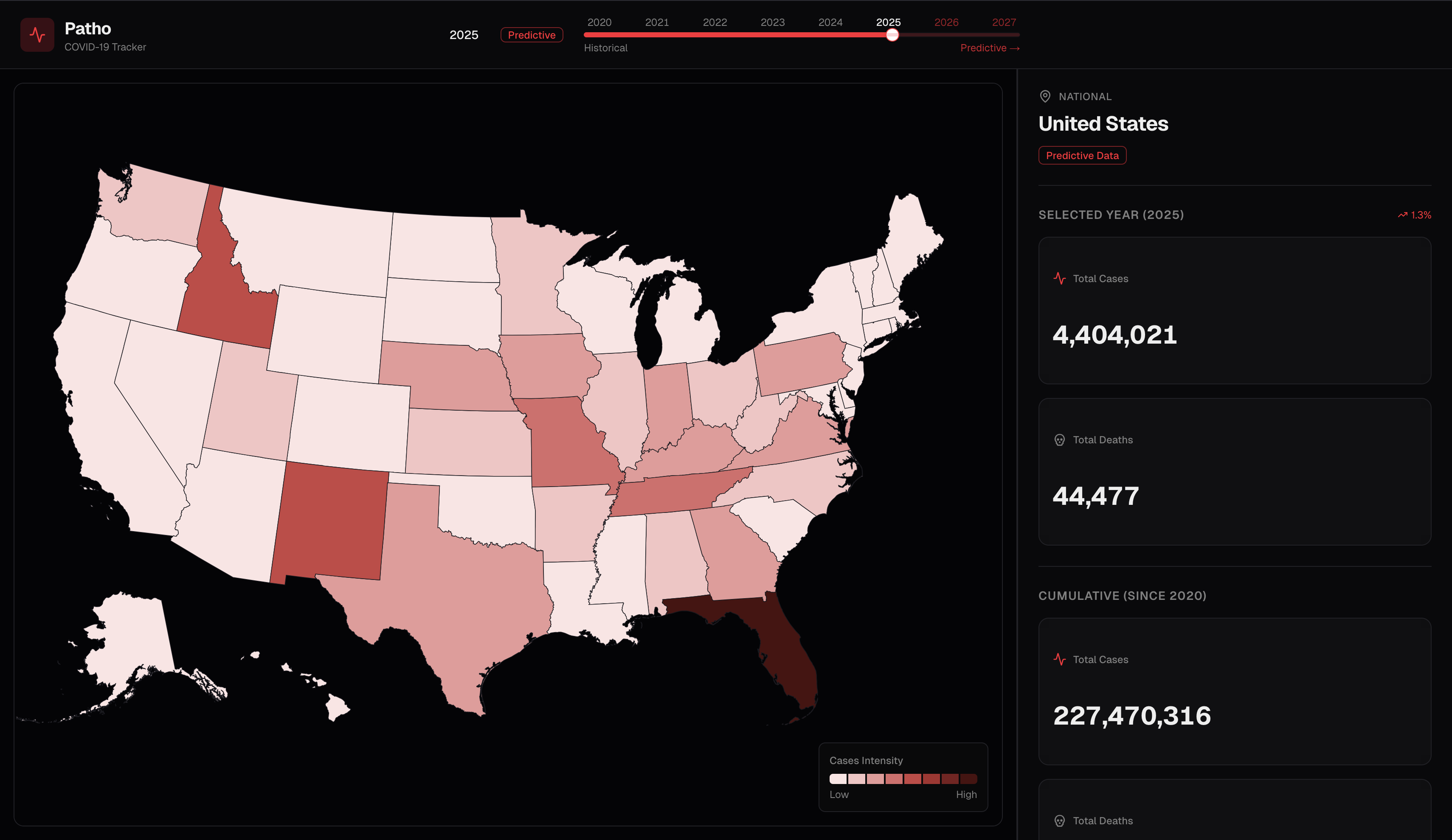 Patho is an interactive public health dashboard that maps COVID-19 case and death data across every US county, pulling from historical CDC datasets. Users can click any state or county to get granular metrics, scrub through a time slider to watch outbreaks evolve, and toggle predictive models to see where cases are projected to go.