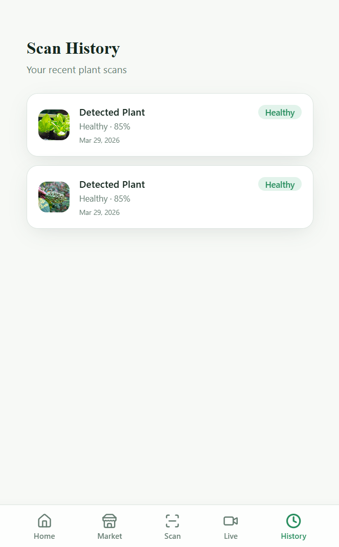 The application was developed using a modern web technology stack. The frontend was built to provide an intuitive and responsive user interface The backend handles image processing, data management, and API integration AI models or external APIs were used for plant image recognition and analysis Relevant information is retrieved and presented in a simplified manner A database is used to store user data, plant scans, and marketplace listings
