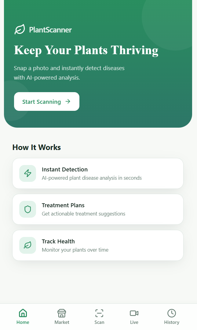 Patient-Plant is an AI-powered plant care assistant that allows users to: Scan plants in real time or upload images Detect plant health issues and identify possible diseases Receive personalized care recommendations such as watering, sunlight, and nutrients View simplified and relevant information gathered from online sources Borrow, rent, or exchange gardening items such as seeds and tools The application functions both as a plant diagnosis tool and a community platform for resource sharing.