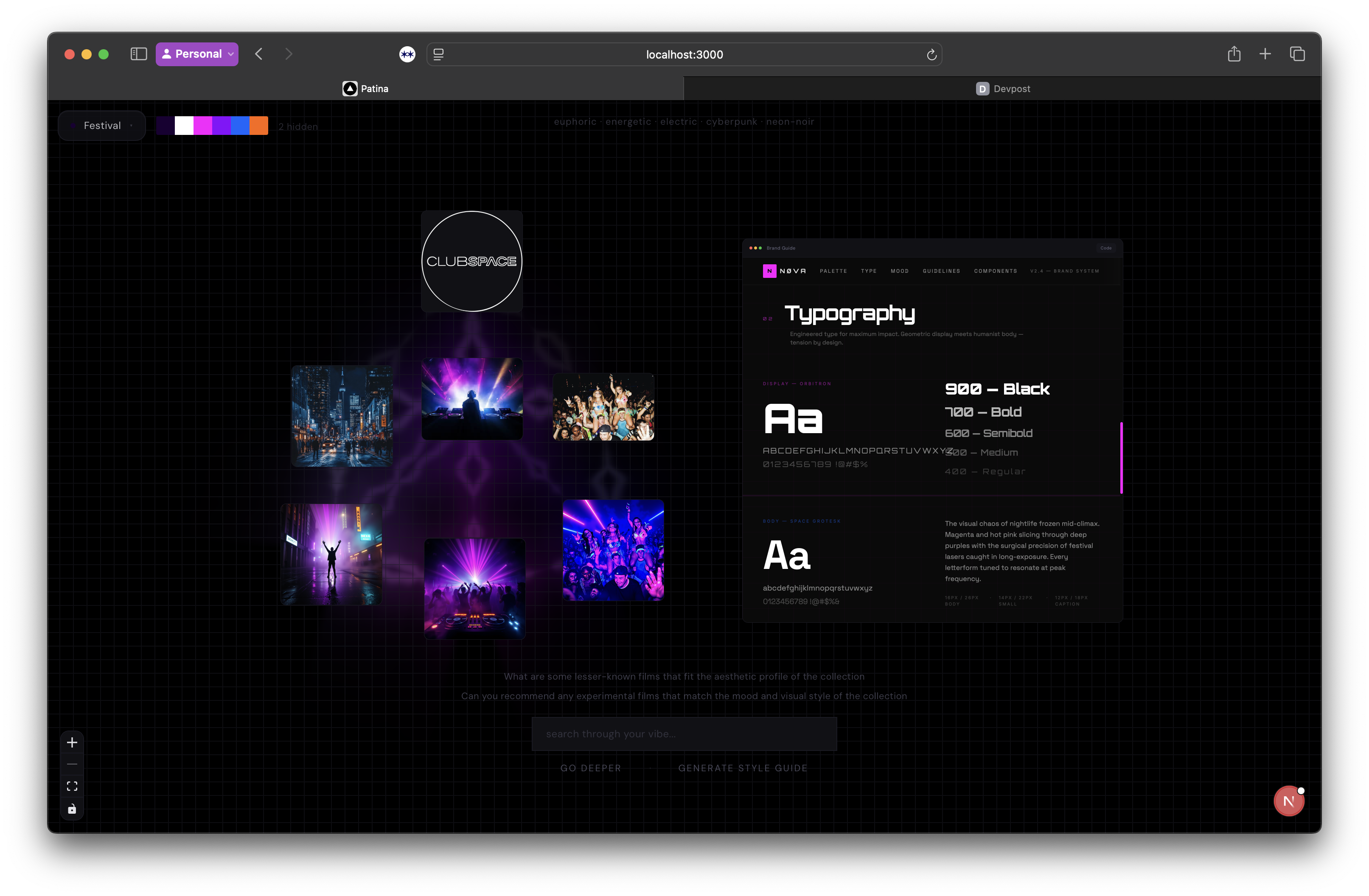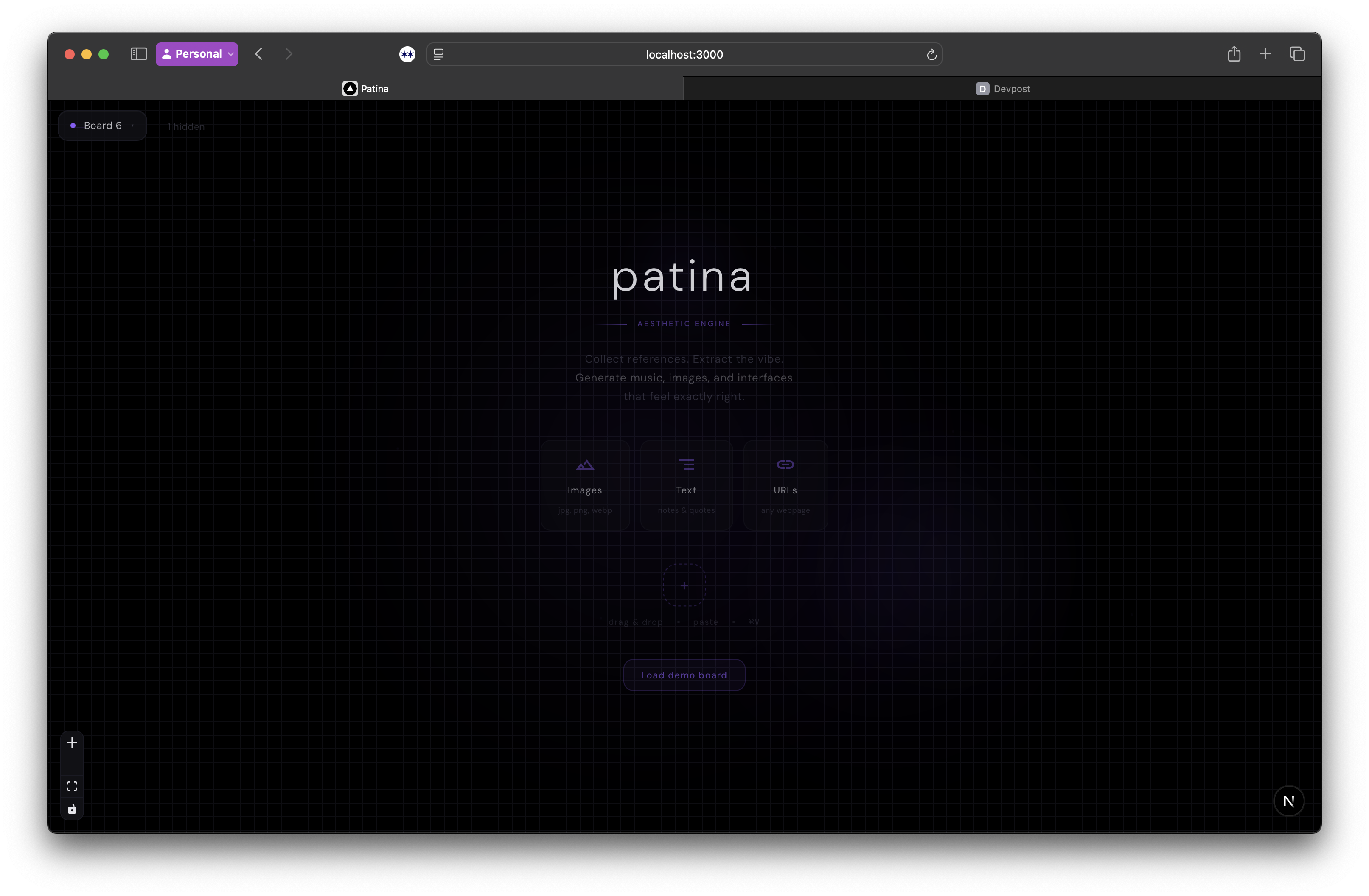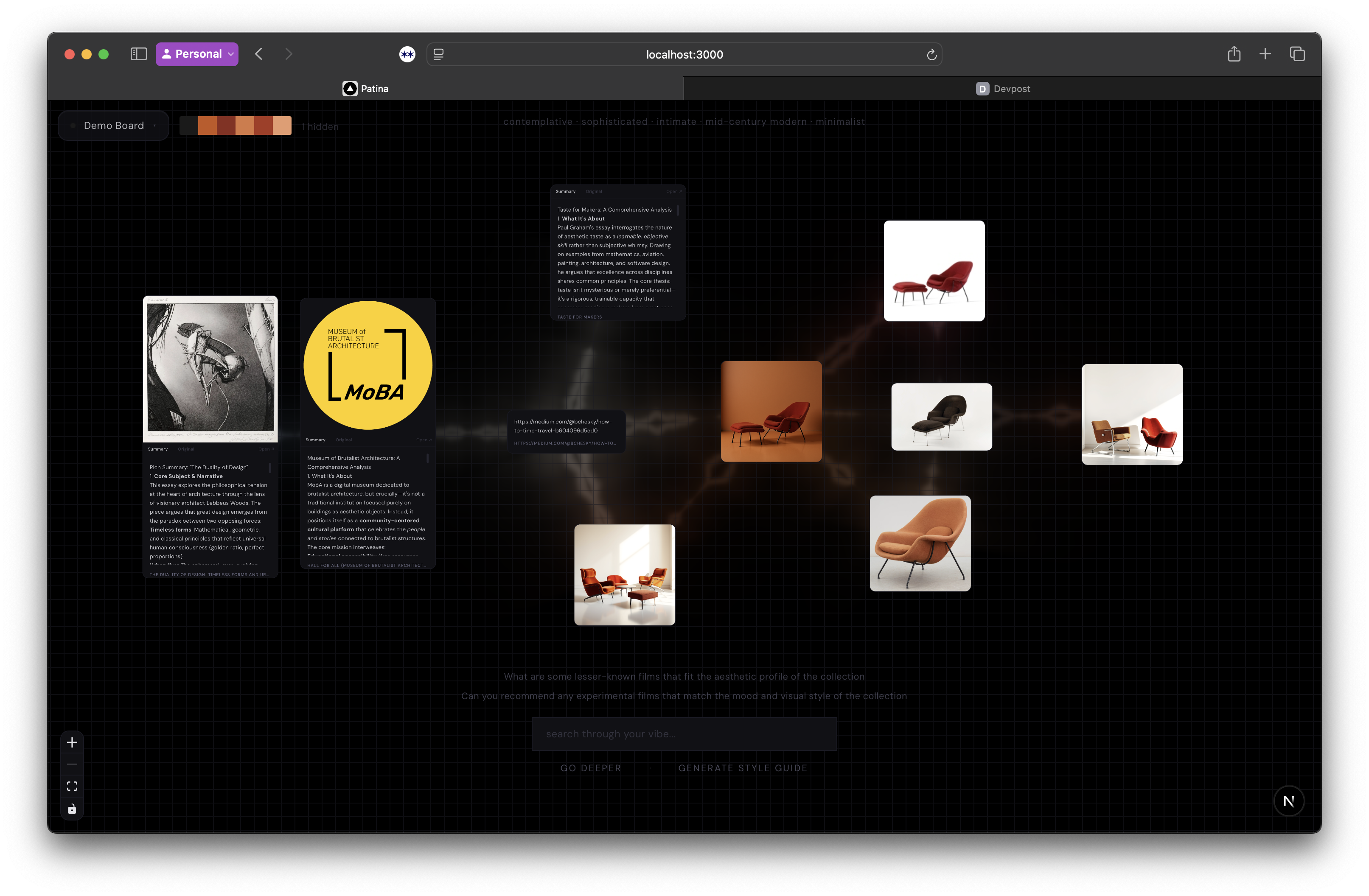 Patina is an infinite canvas mood board where every reference you add contributes to a living "vibe profile." You can drop in images, paste URLs to articles or portfolios, embed YouTube videos and Spotify tracks, preview Google Fonts, or just type raw text. Each piece gets analyzed by Claude to extract its aesthetics and how it contributes to the board's creative direction.