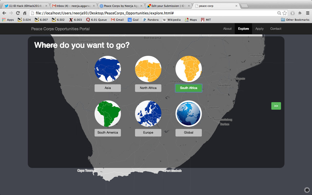 Peace Corps has sent more than 215,000 volunteers over the past 50 years to more than 139 countries. Currently, Peace Corps has more than 4000 opportunities, but lacks an interface to browse through them. This engaging user interface captures new recruits and matches them with the right opportunity.