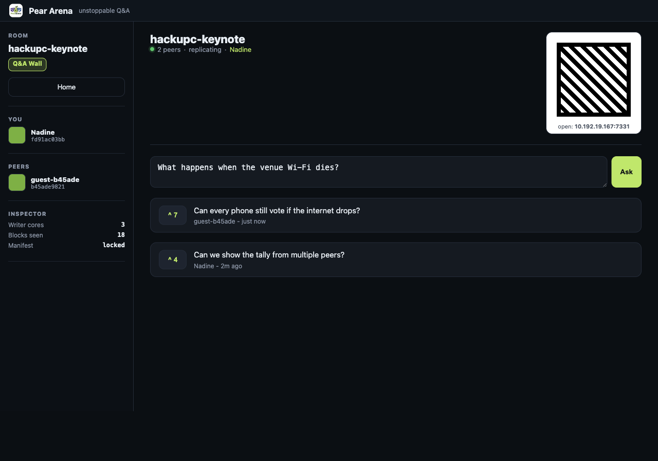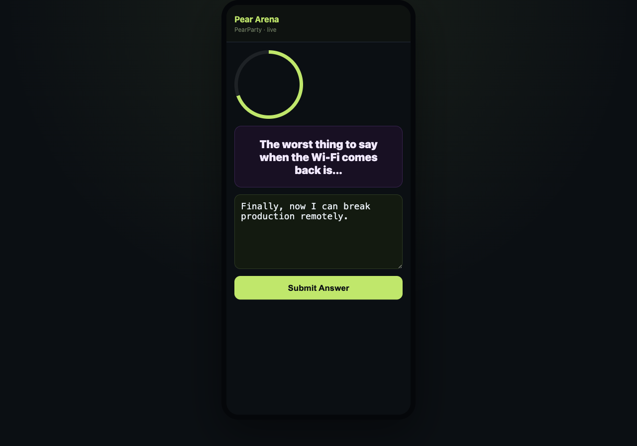 Q&A Wall — replicated questions + upvotes. PearQuiz — Kahoot-style trivia with countdown rings and time-weighted scoring. PearParty — Quiplash-style party game with prompt packs, hidden voting, and a winner reveal. The host's laptop runs a tiny HTTP server and prints a QR. Phones scan, get a mode-aware mobile UI, and become full game players — no app, no signup.