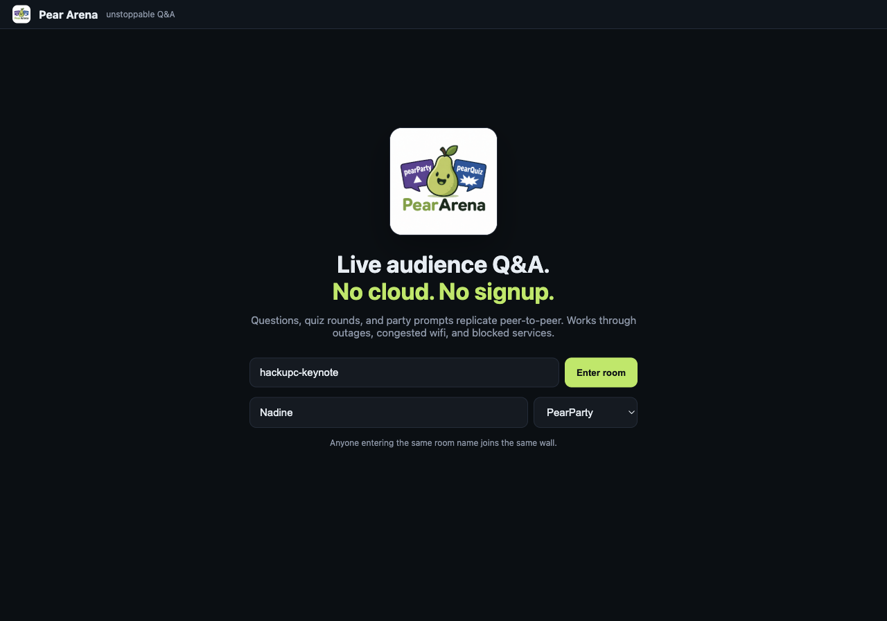 Live audience tools die the moment venue Wi-Fi or the SaaS provider does. Pear's runtime gave us an obvious answer: peers in the same room can talk directly. So we built the whole engagement stack with no server at all.