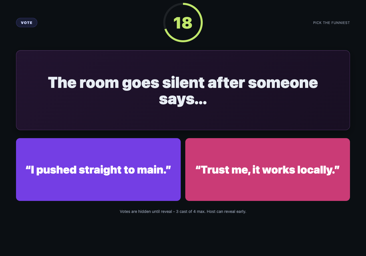 Cryptographically verifiable democratic voting mode. Prompt packs and rooms shareable as Pear links. A dedicated spectator / projector view. Persistent player identity across rooms. More modes: spectrum guessing, team play, live word clouds.