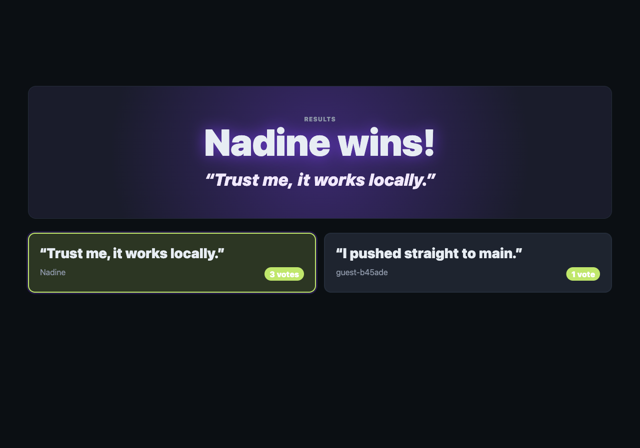 Hypercore + Hyperswarm for replication; deterministic reducers per mode. Modes as plugins (validate / reduce / render), registered in a tiny mode registry. Vanilla JS frontend with a 500ms tick, conic-gradient timers, and a full-screen stage mode. In-process HTTP + SSE server bridges phones to the swarm; each phone tags actions with a stable mobileAuthor ID and shows up as a distinct player. Pear runtime + Electron for the host, with LAN-IP auto-detection for the QR. Challenges we ran into Giving phones distinct identities when all events flow through one writer core. The 500ms re-render kept stealing focus from textareas — fixed with a render diff and in-place DOM patches. Making a single HTML mobile page adapt to three modes with countdowns, locked-in states, and leaderboards. Naming — we rebranded twice before landing on something that read P2P without leaning on source-game brands. Accomplishments that we're proud of A truly serverless party-game stack that survives a router reboot mid-round. One QR scan turns any phone into a full player with its own score. A pluggable mode system: one mode → three with no refactor of the replication layer. A polished full-screen "stage" with animated reveals that feels like a live show. What we learned Reducer determinism is everything — touch Date.now() instead of ev.ts and peers diverge. "No cloud" doesn't mean "no UX work." Focus, scaling, and reveal pacing were the real wins. A tiny in-process HTTP server is surprisingly powerful glue between a P2P desktop app and any phone in the room.